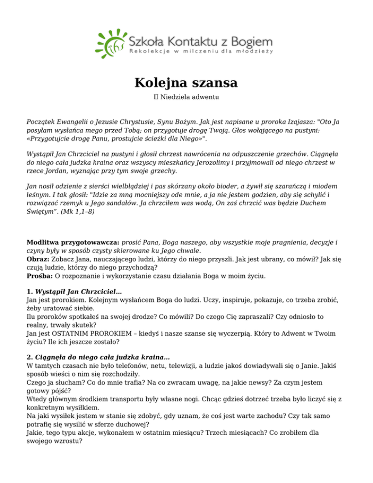 Kolejna szansa II Niedziela adwentu Początek Ewangelii o Jezusie Chrystusie, Synu Bożym. Jak jest napisane u proroka Izajasza: "Oto Ja posyłam wysłańca mego przed Tobą; on przygotuje drogę Twoją. Głos wołającego na pustyni: «Przygotujcie drogę Panu, prostujcie ścieżki dla Niego»". Wystąpił Jan Chrzciciel na pustyni i głosił chrzest nawrócenia na odpuszczenie grzechów. Ciągnęła do niego cała judzka kraina oraz wszyscy mieszkańcy Jerozolimy i przyjmowali od niego chrzest w rzece Jordan, wyznając przy tym swoje grzechy. Jan nosił odzienie z sierści wielbłądziej i pas skórzany około bioder, a żywił się szarańczą i miodem leśnym. I tak głosił: "Idzie za mną mocniejszy ode mnie, a ja nie jestem godzien, aby się schylić i rozwiązać rzemyk u Jego sandałów. Ja chrzciłem was wodą, On zaś chrzcić was będzie Duchem Świętym”. (Mk 1,1–8) Modlitwa przygotowawcza: prosić Pana, Boga naszego, aby wszystkie moje pragnienia, decyzje i czyny były w sposób czysty skierowane ku Jego chwale. Obraz: Zobacz Jana, nauczającego ludzi, którzy do niego przyszli. Jak jest ubrany, co mówił? Jak się czują ludzie, którzy do niego przychodzą? Prośba: O rozpoznanie i wykorzystanie czasu działania Boga w moim życiu. 1. Wystąpił Jan Chrzciciel… Jan jest prorokiem. Kolejnym wysłańcem Boga do ludzi. Uczy, inspiruje, pokazuje, co trzeba zrobić, żeby uratować siebie. Ilu proroków spotkałeś na swojej drodze? Co mówili? Do czego Cię zapraszali? Czy odniosło to realny, trwały skutek? Jan jest OSTATNIM PROROKIEM – kiedyś i nasze szanse się wyczerpią. Który to Adwent w Twoim życiu? Ile ich jeszcze zostało? 2. Ciągnęła do niego cała judzka kraina… W tamtych czasach nie było telefonów, netu, telewizji, a ludzie jakoś dowiadywali się o Janie. Jakiś sposób wieści o nim się rozchodziły. Czego ja słucham? Co do mnie trafia? Na co zwracam uwagę, na jakie newsy? Za czym jestem gotowy pójść? Wtedy głównym środkiem transportu były własne nogi. Chcąc gdzieś dotrzeć trzeba było liczyć się z konkretnym wysiłkiem. Na jaki wysiłek jestem w stanie się zdobyć, gdy uznam, że coś jest warte zachodu? Czy tak samo potrafię się wysilić w sferze duchowej? Jakie, tego typu akcje, wykonałem w ostatnim miesiącu? Trzech miesiącach? Co zrobiłem dla swojego wzrostu? 3. Jan nosił odzienie z sierści wielbłądziej… Jan był ascetą – kimś, kto zrezygnował z wszelkich wygód, ułatwień. Nawet tych – niby – najprostszych, najbardziej podstawowych. Na pierwszy rzut oka był dziwakiem. Ale coś w nim przyciągało ludzi. Na co zwracam uwagę spotykając ludzi na swojej drodze? Co mnie pociąga, a co odstrasza? W jakich warunkach jestem skłonny do spotkania z drugim człowiekiem? Co sprawi – jakie okoliczności – że minę obojętnie nawet najatrakcyjniejszą osobę? Rozmowa końcowa: Kolejny Adwent, kolejne Boże Narodzenie poproś Boga o pomoc w dobrym przeżyciu tego czasu. Na zakończenie odmów: Ojcze nasz