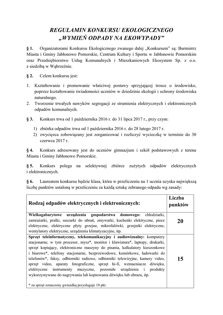 REGULAMIN KONKURSU EKOLOGICZNEGO „WYMIEŃ ODPADY NA EKOWYPADY” § 1. Organizatorami Konkursu Ekologicznego zwanego dalej „Konkursem” są: Burmistrz Miasta i Gminy Jabłonowo Pomorskie, Centrum Kultury i Sportu w Jabłonowie Pomorskim oraz Przedsiębiorstwo Usług Komunalnych i Mieszkaniowych Ekosystem Sp. z o.o. z siedzibą w Wąbrzeźnie. § 2. Celem konkursu jest: Kształtowanie i promowanie właściwej postawy sprzyjającej trosce o środowisko, poprzez kształtowanie świadomości uczniów w dziedzinie ekologii i ochrony środowiska naturalnego. Tworzenie trwałych nawyków segregacji ze strumienia elektrycznych i elektronicznych odpadów komunalnych. 1. 2. § 3. Konkurs trwa od 1 października 2016 r. do 31 lipca 2017 r., przy czym: 1) zbiórka odpadów trwa od 1 października 2016 r. do 28 lutego 2017 r. 2) zwycięzca zobowiązany jest zorganizować i rozliczyć wycieczkę w terminie do 30 czerwca 2017 r. § 4. Konkurs adresowany jest do uczniów gimnazjum i szkół podstawowych z terenu Miasta i Gminy Jabłonowo Pomorskie. § 5. Konkurs polega i elektronicznych. na selektywnej zbiórce zużytych odpadów elektrycznych § 6. Laureatem konkursu będzie klasa, która w przeliczeniu na 1 ucznia uzyska największą liczbę punktów ustaloną w przeliczeniu za każdą sztukę zebranego odpadu wg zasady: Rodzaj odpadów elektrycznych i elektronicznych: Wielkogabarytowe urządzenia gospodarstwa domowego: chłodziarki, zamrażarki, pralki, suszarki do ubrań, zmywarki, kuchenki elektryczne, piece elektryczne, elektryczne płyty grzejne, mikrofalówki, grzejniki elektryczne, wentylatory elektryczne, urządzenia klimatyzacyjne, itp. Sprzęt teleinformatyczny, telekomunikacyjny i audiowizualny: komputery stacjonarne, w tym procesor, mysz*, monitor i klawiatura*, laptopy, drukarki, sprzęt kopiujący, elektroniczne maszyny do pisania, kalkulatory kieszonkowe i biurowe*, telefony stacjonarne, bezprzewodowe, komórkowe, ładowarki do telefonów*, faksy, odbiorniki radiowe, odbiorniki telewizyjne, kamery video, sprzęt video, aparaty fotograficzne, sprzęt hi-fi, wzmacniacze dźwięku, elektryczne instrumenty muzyczne, pozostałe urządzenia i produkty wykorzystywane do nagrywania lub kopiowania dźwięku lub obrazu, itp. * za sprzęt oznaczony gwiazdką przysługuje 10 pkt. Liczba punktów 20 15 Małogabarytowe urządzenia gospodarstwa domowego: odkurzacze, urządzenia używane do szycia, żelazka, pozostałe urządzenia do prasowania, maglowania, tostery, frytkownice, rozdrabniacze, młynki do kawy, elektryczne urządzenia do otwierania i zamykania pojemników i opakowań, noże elektryczne, elektryczne urządzenia do strzyżenia włosów, suszarki, lokówki, prostownice, karbownice, szczoteczki elektryczne, depilatory, golarki, urządzenia do masażu oraz pozostałe urządzenia do pielęgnacji ciała, zegary, zegarki, elektroniczne urządzenia do celów odmierzania, wskazywania lub rejestrowania czasu, wagi elektroniczne, itp. Narzędzia elektryczne i elektroniczne: wiertarki, piły, urządzenia do skręcania, mielenia, piaskowania, przemiału, piłowania, cięcia, nawiercania, nabijania, składania, narzędzia do nitowania, przybijania, spawania, lutowania, urządzenia do koszenia trawy lub innych prac ogrodniczych, itp. Zabawki, sprzęt rekreacyjny i sportowy: kolejki elektryczne lub tory wyścigowe, kieszonkowe konsole do gier video, itp. Zużyte baterie: 1 kg Nakrętki plastikowe od butelek PET PE PEHD: 1 kg § 7. 10 10 5 5 10 Przebieg konkursu: 1. Zbiórka zużytych odpadów elektrycznych i elektronicznych w ramach konkursu trwa od 1 października 2016 r. do 28.02.2017 r. 2. Szkoły biorące udział w konkursie wyznaczają Szkolnego Koordynatora Konkursu. 3. Szkolny Koordynator Konkursu utrzymuje stały kontakt z Urzędem Miasta i Gminy Jabłonowo Pomorskie oraz Przedsiębiorstwem Usług Komunalnych i Mieszkaniowych Ekosystem Sp. z o. o., w szczególności: a) przyjmuje na terenie szkoły odpady, o których mowa w § 7 pkt 4 regulaminu, b) dokonuje przeliczenia punktów za zebrane odpady, c) prowadzi rejestr zebranych odpadów i ewidencję punktacji, d) zbiera od uczniów formularze A z informacją o odpadach, o których mowa w § 7 pkt 5 regulaminu i przekazuje formularze do 30-go dnia każdego miesiąca do Przedsiębiorstwa Usług Komunalnych i Mieszkaniowych Ekosystem Sp. z o. o., e) zbiera od uczniów potwierdzenia przyjęcia przez Przedsiębiorstwo Usług Komunalnych i Mieszkaniowych Ekosystem Sp. z o. o. odpadów, o których mowa w § 7 pkt 5, f) dokonuje czynności, o których mowa w § 7 pkt 7. 4. Odpady o wadze do 5 kg uczniowie przekazują osobiście do Szkolnego Koordynatora Konkursu. Zgromadzone odpady odbierane będą z zapewnionych przez Przedsiębiorstwo Usług Komunalnych i Mieszkaniowych Ekosystem Sp. z o. o. pojemników ustawionych na terenie szkoły, w terminach uzgodnionych ze Szkolnym Koordynatorem. 5. Odpady o wadze powyżej 5 kg będą odbierane przez Przedsiębiorstwo Usług Komunalnych i Mieszkaniowych Ekosystem Sp. z o. o. w ustalonych wcześniej terminach spod adresu wskazanego w formularzu A (wzór stanowi załącznik nr 1 do niniejszego regulaminu), wypełnionego przez rodziców/opiekunów ucznia i przekazanego Szkolnemu Koordynatorowi. 6. Upoważniony pracownik Przedsiębiorstwa Usług Komunalnych i Mieszkaniowych Ekosystem Sp. z o. o. potwierdza na formularzu A odbiór odpadów, spod wskazanego adresu. 7. Szkolny Koordynator przekazuje wypełniony formularz B (wzór stanowi załącznik do niniejszego regulaminu) do Urzędu Miasta i Gminy Jabłonowo Pomorskie w terminie do 10.03.2017 r., uwzględniając rozliczenie w okresie od 01.10.2016 r. do 28.02.2017 r. 8. W oparciu o wypełnione formularze B Urząd Miasta i Gminy Jabłonowo Pomorskie przygotuje sprawozdanie z przebiegu Konkursu. § 8. Wzory formularzy A i B znajdują się w Urzędzie Miasta i Gminy Jabłonowo Pomorskie oraz na stronie internetowej www.jablonowopomorskie.pl. § 9. Na podstawie pr