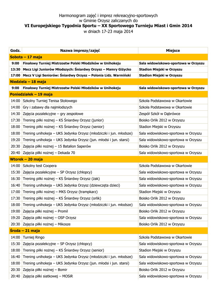 Harmonogram zajęć i imprez rekreacyjno-sportowych w Gminie Orzysz zaliczanych do VI Europejskiego Tygodnia Sportu – XX Sportowego Turnieju Miast i Gmin 2014 w dniach 17-23 maja 2014 Godz. Nazwa imprezy/zajęć Miejsce Sobota – 17 maja 9:00 Finałowy Turniej Mistrzostw Polski Młodzików w Unihokeju Sala widowiskowo-sportowa w Orzyszu 13:30 Mecz Ligi Juniorów Młodszych: Śniardwy Orzysz – Mamry Giżycko Stadion Miejski w Orzyszu 17:00 Mecz V Ligi Seniorów: Śniardwy Orzysz – Polonia Lidz. Warmiński Stadion Miejski w Orzyszu Niedziela – 18 maja 9:00 Finałowy Turniej Mistrzostw Polski Młodzików w Unihokeju Sala widowiskowo-sportowa w Orzyszu Poniedziałek – 19 maja 14:00 Szkolny Turniej Tenisa Stołowego Szkoła Podstawowa w Okartowie 14:00 Gry i zabawy dla najmłodszych Szkoła Podstawowa w Okartowie 14:30 Zajęcia pozalekcyjne – gry zespołowe Zespół Szkół w Dąbrówce 17:30 Trening piłki nożnej – KS Śniardwy Orzysz (junior) Boisko Orlik 2012 w Orzyszu 18:00 Trening piłki nożnej – KS Śniardwy Orzysz (senior) Stadion Miejski w Orzyszu 18:00 Trening unihokeja – UKS Jedynka Orzysz (młodziczki i jun. młodsze) Sala widowiskowo-sportowa w Orzyszu 19:20 Trening unihokeja – UKS Jedynka Orzysz (jun. młodsi i jun. starsi) Sala widowiskowo-sportowa w Orzyszu 20:30 Zajęcia piłki nożnej – 15 Batalion Saperów Boisko Orlik 2012 w Orzyszu 20:40 Zajęcia piłki nożnej – Dekada 70 Sala widowiskowo-sportowa w Orzyszu Wtorek – 20 maja 14:00 Szkolny test Coopera Szkoła Podstawowa w Okartowie 15:30 Zajęcia pozalekcyjne – SP Orzysz (chłopcy) Sala widowiskowo-sportowa w Orzyszu 16:30 Trening piłki nożnej – KS Śniardwy Orzysz (żak) Sala widowiskowo-sportowa w Orzyszu 16:40 Trening unihokeja – UKS Jedynka Orzysz (dziewczęta dzieci) Sala widowiskowo-sportowa w Orzyszu 17:00 Trening piłki nożnej – MKS Orzysz (trampkarz) Stadion Miejski w Orzyszu 17:30 Trening piłki nożnej – KS Śniardwy Orzysz (orlik) Boisko Orlik 2012 w Orzyszu 18:00 Trening unihokeja – UKS Jedynka Orzysz (młodziczki i jun. młodsze) Sala widowiskowo-sportowa w Orzyszu 19:00 Zajęcia piłki nożnej – Promil Boisko Orlik 2012 w Orzyszu 19:20 Zajęcia piłki nożnej – OSP Orzysz Sala widowiskowo-sportowa w Orzyszu 20:30 Zajęcia piłki nożnej – Mikosze Boisko Orlik 2012 w Orzyszu Środa – 21 maja 14:00 Turniej Ringo Szkoła Podstawowa w Okartowie 15:30 Zajęcia pozalekcyjne – SP Orzysz (chłopcy) Sala widowiskowo-sportowa w Orzyszu 18:00 Trening piłki nożnej – KS Śniardwy Orzysz (senior) Stadion Miejski w Orzyszu 16:40 Trening unihokeja – UKS Jedynka Orzysz (młodziczki i jun. młodsze) Sala widowiskowo-sportowa w Orzyszu 18:00 Trening unihokeja – UKS Jedynka Orzysz (jun. młodsi i jun. starsi) Sala widowiskowo-sportowa w Orzyszu 20:30 Zajęcia piłki nożnej – Bomir Boisko Orlik 2012 w Orzyszu 20:40 Zajęcia piłki siatkowej – MOSiR Sala widowiskowo-sportowa w Orzyszu Czwartek – 22 maja 10:00 Orzyszanie – ruszcie COOPER (test Coopera) Boisko lekkoatletyczne w Orzyszu 14:00 Szkoła Podstawowa w Okartowie Zajęcia piłki siatkowej 14:30 Zajęcia pozalekcyjne – zajęcia tenisa stołowego Zespół Szkół w Dąbrówce 15:30 Trening unihokeja – UKS Jedynka Orzysz (kl. I-IV chłopcy) Sala gimnastyczna SP Orzysz 16:30 Trening piłki nożnej – KS Śniardwy Orzysz (żak) Sala widowiskowo-sportowa w Orzyszu 17:00 Trening unihokeja – UKS Jedynka Orzysz (kl. I-IV dziewczęta) Sala gimnastyczna SP Orzysz 17:00 Trening piłki nożnej – KS Śniardwy Orzysz (junior) Stadion Miejski w Orzyszu 17:30 Trening piłki nożnej – KS Śniardwy Orzysz (orlik) Boisko Orlik 2012 w Orzyszu 18:00 Trening piłki nożnej – KS Śniardwy Orzysz (senior) Stadion Miejski w Orzyszu 18:00 Zajęcia piłki siatkowej – Mazurskie Stowarzyszenie Aktywności Lokalnej Sala widowiskowo-sportowa w Orzyszu 19:00 Zajęcia piłki nożnej – OSP Orzysz Boisko Orlik 2012 w Orzyszu 19:20 Zajęcia piłki nożnej – OSP nr 1 w Orzyszu Sala widowiskowo-sportowa w Orzyszu 20:30 Zajęcia piłki nożnej – Dekada 70 Boisko Orlik 2012 w Orzyszu Piątek – 23 maja 12:30 Turniej Siatkówki z okazji Europejskiego Tygodnia Sportu Zespół Szkół w Dąbrówce 14:00 Szkoła Podstawowa w Okartowie Szkolny turniej badmintona 15:30 Zajęcia pozalekcyjne – LO Orzysz Sala widowiskowo-sportowa w Orzyszu 16:00 Trening piłki nożnej – KS Śniardwy Orzysz (orlik) Boisko Orlik 2012 w Orzyszu 17:00 Trening piłki nożnej – KS Śniardwy Orzysz (junior) Stadion Miejski w Orzyszu 17:00 Trening piłki nożnej – MKS Orzysz (trampkarz) Stadion Miejski w Orzyszu 17:30 Trening piłki nożnej – MKS Orzysz (trampkarz) Boisko Orlik 2012 w Orzyszu 17:30 Amatorska Liga Piłki Nożnej Boisko Orlik 2012 w Orzyszu 18:00 Trening unihokeja – UKS Jedynka Orzysz (młodziczki i jun. młodsze) Sala widowiskowo-sportowa w Orzyszu 19:20 Trening unihokeja – UKS Jedynka Orzysz (jun. młodsi i jun. starsi) Sala widowiskowo-sportowa w Orzyszu 20:40 Zajęcia piłki siatkowej – MOSiR Sala widowiskowo-sportowa w Orzyszu