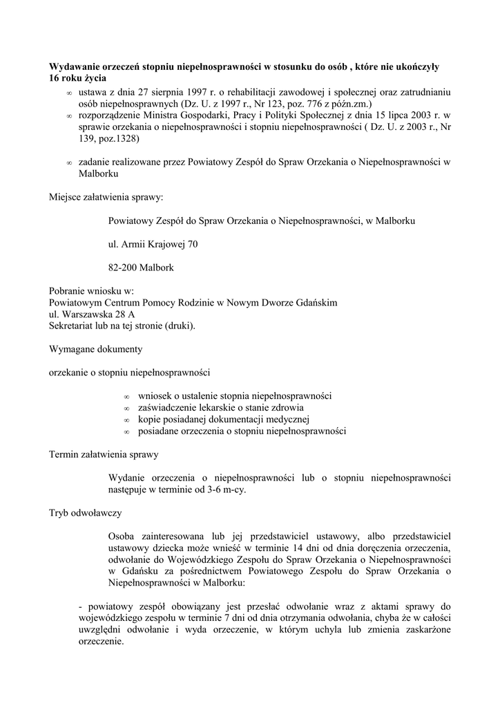 Wydawanie orzeczeń stopniu niepełnosprawności w stosunku do osób , które nie ukończyły 16 roku życia • ustawa z dnia 27 sierpnia 1997 r. o rehabilitacji zawodowej i społecznej oraz zatrudnianiu osób niepełnosprawnych (Dz. U. z 1997 r., Nr 123, poz. 776 z późn.zm.) • rozporządzenie Ministra Gospodarki, Pracy i Polityki Społecznej z dnia 15 lipca 2003 r. w sprawie orzekania o niepełnosprawności i stopniu niepełnosprawności ( Dz. U. z 2003 r., Nr 139, poz.1328) • zadanie realizowane przez Powiatowy Zespół do Spraw Orzekania o Niepełnosprawności w Malborku Miejsce załatwienia sprawy: Powiatowy Zespół do Spraw Orzekania o Niepełnosprawności, w Malborku ul. Armii Krajowej 70 82-200 Malbork Pobranie wniosku w: Powiatowym Centrum Pomocy Rodzinie w Nowym Dworze Gdańskim ul. Warszawska 28 A Sekretariat lub na tej stronie (druki). Wymagane dokumenty orzekanie o stopniu niepełnosprawności • • • • wniosek o ustalenie stopnia niepełnosprawności zaświadczenie lekarskie o stanie zdrowia kopie posiadanej dokumentacji medycznej posiadane orzeczenia o stopniu niepełnosprawności Termin załatwienia sprawy Wydanie orzeczenia o niepełnosprawności lub o stopniu niepełnosprawności następuje w terminie od 3-6 m-cy. Tryb odwoławczy Osoba zainteresowana lub jej przedstawiciel ustawowy, albo przedstawiciel ustawowy dziecka może wnieść w terminie 14 dni od dnia doręczenia orzeczenia, odwołanie do Wojewódzkiego Zespołu do Spraw Orzekania o Niepełnosprawności w Gdańsku za pośrednictwem Powiatowego Zespołu do Spraw Orzekania o Niepełnosprawności w Malborku: - powiatowy zespół obowiązany jest przesłać odwołanie wraz z aktami sprawy do wojewódzkiego zespołu w terminie 7 dni od dnia otrzymania odwołania, chyba że w całości uwzględni odwołanie i wyda orzeczenie, w którym uchyla lub zmienia zaskarżone orzeczenie.
