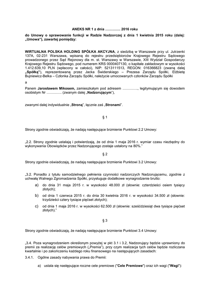 do Umowy o sprawowanie funkcji w Radzie Nadzorczej z dnia 1 kwietnia 2015 roku (dalej: