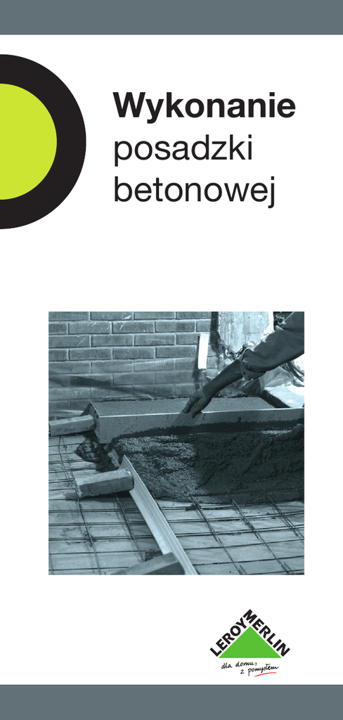 Wykonanie posadzki betonowej Gładźbetonowagrubości8-10cmpowinnabyćzbrojonasiatkąstalową. N A R Z Ę D Z I A I M AT E R I A Ł Y poziomnica miarka linijka deski grubości 27 mm deski grubości 12 mm, służące do wyznaczenia dylatacji profile dylatacyjne z PVC grabie betoniarka (nieobowiązkowo) szpadel ubijak folia pod beton łopata impregnat do desek siatka stalowa DO WYKONANIA BETONU METODĄ TRADYCYJNĄ żwir piasek woda M CE EN T Przygotowaniepodłoża 1. Usunąć darń i ziemię na głębokość 20-25 cm. Wykop powinien być szerszy i dłuższy od podłogi około 15 cm. 1 20/25 cm Na dnie otworu rozsypać kamienie lub gruz. Usunąć większe kawałki cegieł i tynku. Rozgarnąć i wyrównać gruz. Warstwa powinna mieć grubość 10-15 cm. 10/15 cm 2. Wypełnić nierówności mieszanką żwiru i piasku. 2 3. Powstałą warstwę zmoczyć obficie wodą i ubić ciężkim ubijakiem. 3 4. Na całej powierzchni rozłożyć folię tak, by przykrywała także łaty deskowania. 4 Przygotowaniedeskowania 1. Ustawić zaimpregnowane deski (grubość 27 mm) równo i wbić kołki w rogach wykopu oraz co jeden metr wzdłuż niego. Szerokość desek powinna odpowiadać grubości betonu (najczęściej 10 cm). Dostosować ustawienie desek i kołków do kąta nachylenia (1 cm/m). 2. Co 2-4 metry powinny znajdować się szczeliny dylatacyjne. Rozstawić deski (grubość 12 mm) lub profile dylatacyjne z PVC (których nie usuwa się po skończonej pracy). Profile dylatacyjne powinny dokładnie pasować do szerokości szalunku (drewnianej ramy), a ich wysokość musi wynosić tyle co grubość betonu. Deski lub profile dylatacyjne posłużą jako deski prowadzące, podczas wyrównywania powierzchni betonowej. Pola powierzchni wyznaczone przez profile dylatacyjne mogą wynosić maksymalnie 20 m2. 3. Rozłożyć plansze siatki stalowej: każda plansza ma długość około 2,40 m. Wiązać je ze sobą, aż do otrzymania pożądanej powierzchni (plansze powinny zachodzić na siebie na szerokość jednego oczka lub 15 cm). wiązanie zbrojenia Zbrojenie układa się wewnątrz pól utworzonych przez profile dylatacyjne. Uwaga!Należyzachowaćodległość2cmmiędzybrzegiem gładziisiatką,abyzapewnićotulinęzbrojeniabetonem. Obliczanie ilości potrzebnego betonu 5m 10 cm 5 m3 10 m ilość betonu = długość x szerokość x wysokość Przykład:10mx5mx0,1m=5m3 Ilości składników potrzebnych na 1 m3 betonu CE ME NT Piasek Cement Żwir worek 50 kg Podłoga w garażu, taras 7 worków 630 kg (90 kg/worek) lub 420 l (60 l/worek) Woda około 1232 kg (176 kg/worek) 175 l lub 770 l (110 l/worek) RADY • Użycie gotowego betonu znacznie ułatwi pracę. Można zamówić dostawę takiego betonu przez samochód-betoniarkę bezpośrednio na budowę (dzięki temu zakup betoniarki przenośnej nie będzie konieczny). • Jeżeli beton będzie układany w pomieszczeniu o dużej wilgotności (np. w piwnicy), można zwiększyć odporność betonu na wilgoć dodając do niego domieszkę uszlachetniającą. Układaniebetonu Rozprowadzić beton tak, by wystawał około 2 cm nad krawędzie desek. Wyrównać powierzchnię łatą. Ubijać od jednego boku, delikatnie przesuwając deskę wzdłuż oszalowania. Powtórzyć czynność dwa razy, a następnie wyrównać powierzchnię mieszanki betonowej, poruszając łatą jak przy piłowaniu. Wypełnić wszelkie nierówności i powtórnie wyrównać. RADY • Latem, aby woda szybko nie parowała, przykryć nawierzchnię płachtą z folii, napiąć ją i przycisnąć boki cegłami. • Starać się nie wykonywać betonu w zimne dni, ale jeśli się zdarzy, że przyjdą mrozy, przykryć powierzchnię słomianą matą lub posypać folię grubą warstwą piasku. • To trzeba wiedzieć: po 8 dniach od wykonania beton osiąga 90% swojej całkowitej wytrzymałości. Po ułożeniu posadzki betonowej Deski na krawędziach i dylatacyjne wyjąć z płyty betonowej. Powstałe szczeliny wypełnić zaprawą. Profile dylatacyjne z PVC można pozostawić na miejscu. Umożliwią one pracę gładzi bez pęknięć. RADA • Jeżeli gładź przylega do ściany domu, pozostawić przerwę dylatacyjną między ścianą a powierzchnią gładzi. Zapobiega ona pęknięciom ściany w wyniku ruchów podłoża. Konserwacja Istnieje wiele produktów konserwujących i czyszczących beton: środki chroniące przed powstawaniem plam, specjalne farby, odrdzewiacze, środki odtłuszczające i trawiące zabrudzenia smołą. Niniejsza ulotka ma jedynie charakter informacyjny. Szczegółowezasadymontażuiwykorzystaniaposzczególnychproduktów określainstrukcjaużytkowania. Leroy Merlin Polska nie ponosi żadnej odpowiedzialności za szkodybędącenastępstwemwadliwegomontażulubwykorzystaniaproduktów,awszczególnościichmontażuiwykorzystaniawsposóbniezgodnyzinstrukcjąużytkowania.