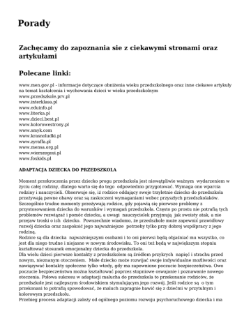 Porady Zachęcamy do zapoznania sie z ciekawymi stronami oraz artykułami Polecane linki: www.men.gov.pl - informacje dotyczące obniżenia wieku przedszkolnego oraz inne ciekawe artykuły na temat kształcenia i wychowania dzieci w wieku przedszkolnym www.przedszkole.prv.pl www.interklasa.pl www.eduinfo.pl www.literka.pl www.dzieci.best.pl www.kolorowestrony.pl www.smyk.com www.krasnoludki.pl www.zyraffa.pl www.mensa.org.pl www.wierszegosi.pl www.foxkids.pl ADAPTACJA DZIECKA DO PRZEDSZKOLA Moment przekroczenia przez dziecko progu przedszkola jest niewątpliwie ważnym wydarzeniem w życiu całej rodziny, dlatego warto się do tego odpowiednio przygotować. Wymaga ono wparcia rodziny i nauczycieli. Obserwuje się, iż rodzice oddający swoje trzyletnie dziecko do przedszkola przeżywają pewne obawy oraz są zaskoczeni wymaganiami wobec przyszłych przedszkolaków. Szczególnie trudne momenty przeżywają rodzice, gdy pojawią się pierwsze problemy z przystosowaniem dziecka do warunków i wymagań przedszkola. Często po prostu nie potrafią tych problemów rozwiązać i pomóc dziecku, a uwagi nauczycielek przyjmują jak swoisty atak, a nie przejaw troski o ich dziecko. Powszechnie wiadomo, że przedszkole może zapewnić prawidłowy rozwój dziecka oraz zaspokoić jego najważniejsze potrzeby tylko przy dobrej współpracy z jego rodziną. Rodzice są dla dziecka najważniejszymi osobami i to oni pierwsi będą objaśniać mu wszystko, co jest dla niego trudne i niejasne w nowym środowisku. To oni też będą w największym stopniu kształtować stosunek emocjonalny dziecka do przedszkola. Dla wielu dzieci pierwsze kontakty z przedszkolem są źródłem przykrych napięć i strachu przed nowym, nieznanym otoczeniem. Małe dziecko może rozwijać swoje indywidualne możliwości oraz nawiązywać kontakty społeczne tylko wtedy, gdy ma zapewnione poczucie bezpieczeństwa. Owo poczucie bezpieczeństwa można kształtować poprzez stopniowe oswajanie i poznawanie nowego otoczenia. Połowa sukcesu w adaptacji malucha do przedszkola to przekonanie rodziców, że przedszkole jest najlepszym środowiskiem stymulującym jego rozwój. Jeśli rodzice są o tym przekonani to potrafią spowodować, że maluch zapragnie bawić się z dziećmi w przytulnym i kolorowym przedszkolu. Przebieg procesu adaptacji zależy od ogólnego poziomu rozwoju psychoruchowego dziecka i ma charakter indywidualny. Łagodny start w środowisko przedszkolne może m.in. zapewnić opanowanie umiejętności samoobsługowych. Poziom opanowania tych umiejętności ma bowiem wpływ na poczucia bezpieczeństwa i niezależności dziecka. Dziecko 3-letnie powinno mieć opanowane następujące czynności samoobsługowe: samodzielne jedzenie łyżką, mycie rąk, samodzielne korzystanie z toalety, zdejmowanie i ubieranie podstawowych części garderoby, rozpoznawanie swoich rzeczy, czyszczenie nosa, znajomość swojego imienia i nazwiska. Przeciętny rozwój dziecka umożliwia w pełni opanowanie tych umiejętności. Jednak dzieci przychodzące do przedszkola często różnią się pod względem dojrzałości przedszkolnej, co wynika w dużej mierze z systemu wychowawczego w rodzinie. Dlatego też do realizacji powyższych wymagań i kształtowania umiejętności konieczna jest ścisła współpraca pomiędzy środowiskiem rodzinnym i przedszkolnym. Pierwszy krok dziecka w samodzielność często bywa trudny. Zatem musimy zrobić wszystko aby ułatwić dziecku przedszkolny start i dobrze przygotować do czekających je zadań. Jak można ułatwić dziecku start w przedszkolu – rady dla rodziców postarajmy się w początkowym okresie, odbierać dziecko wcześniej przez 2-3 dni (małe dziecko ma inne poczucie czasu i okres przebywania poza domem wydaje mu się bardzo długi), nie mówimy dziecku, że przyjdziemy po nie wcześniej, kiedy jest to niemożliwe ( w ten sposób tracimy jego zaufanie i zmniejszysz to jego poczucie bezpieczeństwa), nigdy nie straszymy dziecka przedszkolem, przeciwnie starajmy się podkreślać jego dobre strony, przyzwyczajamy swoją pociechę do urozmaiconych potraw, skończmy z rozdrabnianiem pokarmów (trzylatek może już swobodnie gryźć pokarm), wdrażajmy dziecko do przestrzegania umów i zasad, sprawdźmy , czy dziecko potrafi samodzielnie wykonać proste czynności – samemu załatwiać potrzeby fizjologiczne, myć ręce, ubierać się. Jeśli ma problemy poćwiczcie razem i chwalmy je za każdy nawet najmniejszy sukces, odzwyczajajmy dziecko od smoczków, pampersów, nocnika, pozwólmy dziecku uczestniczyć w przygotowaniach do przedszkola (wspólne zakupy), dajmy możliwość przyzwyczajania się do tych rzeczy w domu, aby w przedszkolu to wszystko nie było takie nowe, a już znajome i zarazem łatwe do rozpoznania, jeśli dziecko miało mało kontaktów z rówieśnikami i innymi dziećmi nadrabiajmy to teraz – zaprośmy do domu znajome dzieci lub wybierzmy się na plac zabaw (postarajmy się nie wtrącać się do ich zabawy). RADY NA PIERWSZE DNI W PRZEDSZKOLU stosujmy w przedszkolu krótkie pożegnania, nie okazujmy dziecku własnych rozterek zostawiając je w przedszkolu, (przekazujesz im wtedy swoje lęki), przygotujmy dla dziecka wygodny strój do samodzielnego ubierania, który można pobrudzić, nie wyręczajmy dziecka nawet gdyby wykonywało określone czynności niezdarnie, nie zmuszajmy dziecka do tego, by zawsze od razu opowiadało o tym, co wydarzyło się w przedszkolu. To powoduje niepotrzebny stres, poczekajmy, aż samo zacznie mówić, nie pytajmy dziecko, co i ile zjadło, ale w co i z kim się bawiło, jeśli dziecko przy pożegnaniu z mamą płacze, postarajmy się, żeby przez kilka dni odprowadzał je do przedszkola tata (rozstanie z nim jest często mniej bolesne), pozostawmy w szafce w szatni dodatkowe ubrania, uprzedźmy dziecko, że gdy pobrudzi lub zmoczy ubranie, może przebrać się w czyste. Jeśli dziecko zabrudzi ubranie nie miejmy do niego pretensji i sta