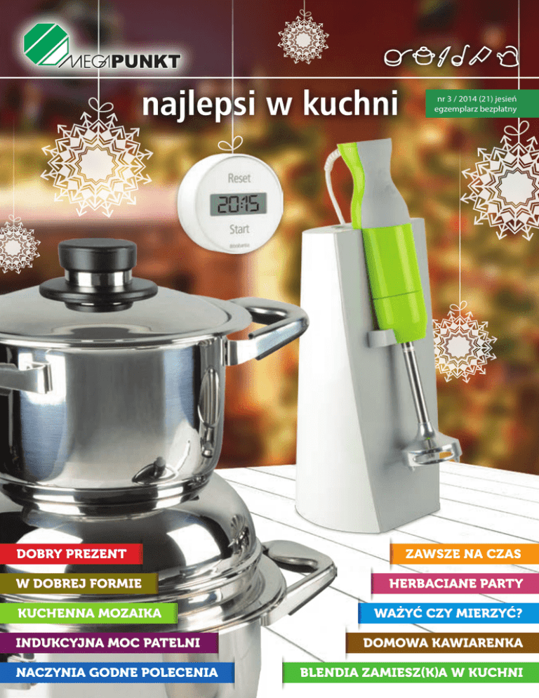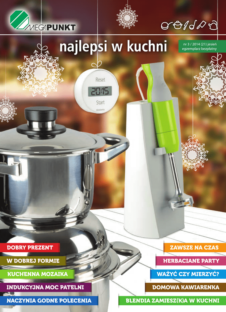 nr 3 / 2014 (21) jesień egzemplarz bezpłatny DOBRY PREZENT W DOBREJ FORMIE KUCHENNA MOZAIKA INDUKCYJNA MOC PATELNI NACZYNIA GODNE POLECENIA ZAWSZE NA CZAS HERBACIANE PARTY WAŻYĆ CZY MIERZYĆ? DOMOWA KAWIARENKA BLENDIA ZAMIESZ(K)A W KUCHNI W okresie świąteczno-karnawałowym praca w kuchni wre Gotujemy, smażymy, pieczemy, mierzymy, ważymy, miksujemy, a przy tym – stale zerkamy na zegarek odmierzając czas. Czy zdążymy przed nadejściem gości? Długie wieczory sprzyjają spotkaniom towarzyskim – przy kawie, herbacie, a czasem i czymś mocniejszym. Warto te chwile urozmaicić ciekawymi przyborami, które będą nam towarzyszyć przy stole. Megapunkt stając naprzeciw wszystkim tym wyzwaniom, poszerzył zimowy numer o dodatkowe 4 strony, a i tak nie zmieściło się w nim wszystko to, o czym chcieliśmy Wam napisać. Odwiedźcie więc nasze sklepy i bacznie się rozglądajcie – za wyjątkowymi pomysłami na prezenty oraz dodatkowymi promocjami, które nie zmieściły się w gazetce. Z OSTATNIEJ CHWILI SERIA LIMITOWANA! 5. 1. 4. 2. Spartan Damast Limited Edition 2014 – 91 mm: 1. duże ostrze ze stali damasceńskiej, 2. małe ostrze, 3. korkociąg, 4. otwieracz do puszek, 5. z małym śrubokrętem, 6. otwieracz do kapsli, 7. ze śrubokrętem, 8. i przyrządem do zdejmowania izolacji, 9. szpikulec-szydło, 10. kółko. 7. SŁUPSK GDAŃSK OLSZTYN BYDGOSZCZ POZNAŃ WŁOCŁAWEK PŁOCK WARSZAWA ZIELONA GÓRA ŁÓDŹ WROCŁAW BIELSKO-BIAŁA KRAKÓW 6. 8. 3. 10. 9. Tylko teraz w sklepach Megapunkt nabyć można wyjątkową limitowaną serię scyzoryków VICTORINOX z linii Spartan. Ich ostrze główne wykonane zostało z najwyższej klasy stali damasceńskiej, a charakterystyczną celidorową okładzinę zastąpiono drewnem cisowym, na którym umieszczono inkrustowany logotyp marki VICTORINOX – szwajcarski krzyż i tarczę. Każdy nóż posiada numer seryjny, a cała edycja obejmuje jedynie 5000 szt., z czego zaledwie kilkadziesiąt przeznaczono na rynek polski. Jeśli cenisz wyjątkowe przedmioty, koniecznie odwiedź sklepy Megapunkt! Model dostępny w sklepach Megapunkt w drugiej połowie listopada! NACZYNIA GODNE POLECENIA .................................. INDUKCYJNA MOC PATELNI ...................................... ZAWSZE NA CZAS ....................................................... W DOBREJ FORMIE .................................................... KUCHENNA MOZAIKA ................................................ DOBRY PREZENT ........................................................ BLENDIA ZAMIESZ(K)A W KUCHNI ............................. WAŻYĆ CZY MIERZYĆ? ............................................... DOMOWA KAWIARENKA ............................................ HERBACIANE PARTY .................................................. 03 06 08 09 10 12 14 16 18 19 Zapraszamy też na: www.megapunkt.pl Bielsko-Biała: Gemini Park 33 484-08-01; Bydgoszcz: Drukarnia 664-310-055; Gdańsk: Galeria Bałtycka 58 520-24-04; Kraków: Bonarka City Center 12 298-63-47, Galeria Krakowska 12 628-78-54; Łódź: Galeria Łódzka 42 634-67-86, Manufaktura 42 632-42-55; Olsztyn: Manhattan 664-310-054; Płock: Mazovia 24 367-85-65; Poznań: Plaza 61 656-33-38; Słupsk: Jantar 59 845-56-02; Warszawa: Hala Mirowska 22 654-20-30 w.11, M1 Marki 22 781-24-86; Sadyba Best Mall 22 370-39-50, Wola Park 22 533-41-49, Maximus (Nadarzyn) 22 345-31-00; Wrocław: Galeria Dominikańska 71 344-85-90; Zielona Góra: Focus Mall 68 410-71-23. Be Happy! NACZYNIA GODNE POLECENIA Garnek – jaki jest, każdy widzi. Uszy, korpus, pokrywa. Czy na pewno? Zwykło się mówić, że diabeł tkwi w szczegółach. Tak jest w przypadku naczyń Zest for Life z linii EUROPE. Przypominają tradycyjne stalowe garnki. Zagłębiając się w detale produkcyjne, dostrzeżemy jednak istotne różnice. Dzięki nim oraz kilku dodatkom zwykłe naczynia przemieniają się w cały system do gotowania. Wykonano je ze stali 18/10 – uznawanej za najlepszą i używanej do produkcji przyrządów chirurgicznych. Ścianki i pokrywa garnków mają grubość 1 mm. Dno zaś jest wielowarstwową konstrukcją o grubości 5,6 mm dla garnków o śr. 16-20 cm i 6,6 mm dla garnków o śr. od 24 cm. W stalowej kapsule sprasowano gruby (4 lub 5 mm) aluminiowy krążek, który wyrównuje rozkład temperatury na dnie garnka. Nie ma miejsc mocno i słabo rozgrzanych. Potrawa podgrzewa się równomiernie – nie jest niedogotowana z jednej strony, a przypalona z innej. Jest to szczególnie istotne przy kuchniach indukcyjnych, gdzie występuje silne miejscowe nagrzewanie. Grube dno także wolniej się wychładza. Biorąc pod uwagę fakt, że garnki EUROPE są bardzo eleganckie, możemy w nich serwować potrawy bezpośrednio na stół (na specjalnych podkładkach, które ochronią blat przed odparzeniem). Tak podane pozostaną długo ciepłe. Garnki EUROPE sprawdzają się przy szybkich potrawach takich, jak zupy. Niezastąpione są zaś przy tych, które wymagają długiego gotowania – jak bigos, czy mięso w sosie. Możemy w nich smażyć i dusić bez użycia tłuszczu. Puste naczynie podgrzewamy na „średnim ogniu”, aż wlana do niego kropla wody zachowa się jak rtęć – rozpryskując się i tocząc po dnie. Wówczas wkładamy mięso i dociskamy je do dna. Początkowo przywrze (inaczej niż w naczyniach z powłoką non-stick), ale po ok. 2-3 min. zarumieni się i odejdzie od dna w stopniu umożliwiającym obrócenie. Teraz możemy smażyć dalej lub przykryć garnek pokrywą, jeśli chcemy mięso udusić. Gdy spod pokrywy zacznie wydobywać się para, zmniejszamy płomień do minimum. Źródło ciepła możemy wyłączyć na ok. 15 min. przed upływem czasu duszenia tradycyjnym sposobem – mięso dodusi się kosztem ciepła zmagazynowanego w wielowarstwowym dnie. Po takim użyciu garnek oczyścić możemy solą lub cytryną. Podczas długiego przyjęcia możemy dodatkowo wydłużyć czas utrzymywania wysokiej temperatury. W tym celu wysta