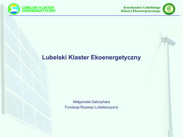 Lubelski Klaster Ekoenergetyczny Małgorzata Gałczyńska Fundacja Rozwoju Lubelszczyzny Lubelski Klaster Ekoenergetyczny Partnerzy klastra 39 podmiotów, w tym: 33 przedsiębiorców, jednostki naukowo – badawcze, wyższe uczelnie i instytucje otoczenia biznesu z województw: lubelskiego, świętokrzyskiego, wielkopolskiego i mazowieckiego Podmioty zajmujące się energetyką: solarną, wiatrową, wodną i geotermalną, produkcją i wykorzystaniem biomasy na cele energetyczne, gospodarką odpadami przemysłowymi, edukacją wyższą i badaniami oraz efektywnością energetyczną i budownictwem energooszczędnym Misja „Wspieranie wszelkich działań związanych ze zrównoważonym wykorzystaniem odnawialnych źródeł energii w oparciu o potencjał województwa lubelskiego poprzez opracowywanie i wdrażanie innowacji technologicznych, produkcyjnych i procesowych, popularyzacja odnawialnych źródeł energii w regionie oraz rozwój budownictwa energooszczędnego” Tworzenie warunków dla rozwoju OZE i efektywności energetycznej Inkubator Przedsiębiorczości Fundacji Rozwoju Lubelszczyzny Przy wsparciu inkubatora do roku 2020 powstanie co najmniej 30 nowych przedsiębiorstw w branży OZE, efektywności energetycznej, ekobudownictwa i ICT. W ramach projektu przedsiębiorstwa działające w branżach: energetyka odnawialna, poprawa efektywności energetycznej i ekobudownictwo stworzą kompleksową, wzajemnie uzupełniającą się ofertę produktów i usług. Inkubator Przedsiębiorczości Fundacji Rozwoju Lubelszczyzny Instalacja fotowoltaiczna do produkcji prądu elektrycznego o mocy 30 kW Ogniwa fotowoltaiczne są zainstalowane na elewacji i na dachu budynku. Instalacja wykorzystywana będzie przede wszystkim jako instalacja doświadczalna. Efekt dydaktyczny instalacji: zbudowana pod kątem obserwacji uzysków energii; falownik rejestruje wszystkie niezbędne informacje; próbkowanie z częstotliwością 5 minut; prezentacja danych na wyświetlaczu falownika; wewnętrzna sieć LAN – łatwy dostęp do danych Dane techniczne instalacji Moc generatora: 30 kVA, Układ: trójfazowy 400/230 (3/N/PE) Panele monokrystaliczne: 162 szt. Specyfikacja poszczególnych sekcji 1) 42 panele o mocy 275Wp (dach) 2) 60 paneli o mocach 195Wp (fasada I) 3) 60 paneli o mocach 195Wp (fasada II) Kształcenie kadr dla rozwijającej się branży OZE i EE Projekt „Szkoły nowych możliwości – modernizacja kształcenia zawodowego” Fundacja Rozwoju Lubelszczyzny – Lider projektu Zespół Szkół nr 2 im. A Świętochowskiego z Łukowa – Partner projektu • • • wdrożenie w szkołach wchodzących w skład Zespołu Szkół nowych programów rozwojowych uwzględniających m.in. wprowadzenie nowego kierunku w Technikum (Technik urządzeń i systemów energetyki odnawialnej) i specjalizację klas w kierunku montażu i serwisu urządzeń energetyki odnawialnej w miejsce klasy wielozawodowej w Zasadniczej Szkole Zawodowej; utworzenie pracowni do montażu OZE i pracowni elektrycznej OZE; miesięczne płatne staże dla 124 uczniów. Okres realizacji: 10.2012 r. – 09.2015 roku Tworzenie warunków do rozwoju przedsiębiorczości na obszarach chronionych w tym NATURA 2000 Lubelskie Energetyczne Partnerstwo Naturowe •kontynuacja współpracy Partnerów zapoczątkowanej w ramach projektu „Energetyczni kreatorzy zmian”; •profil Partnerstwa Naturowego jest związany z branżą energetyki odnawialnej; W ramach Partnerstwa Naturowego w województwie lubelskim współpracują: •Fundacja Rozwoju Lubelszczyzny – Lider •Lubelski Klaster Ekoenergetyczny •7 instytucji, w tym instytucje otoczenia biznesu, jednostki samorządu terytorialnego i wyższe uczelnie •16 przedsiębiorców zajmujących się energetyką wodną, wiatrową, solarną, budownictwem energooszczędnym i wykorzystaniem biomasy do produkcji energii w biogazowniach i przez energetykę zawodową. Tworzenie warunków do rozwoju przedsiębiorczości na obszarach chronionych w tym NATURA 2000 Lubelskie Energetyczne Partnerstwo Naturowe Działania •2 wizyty studyjne – 22.06.2015 roku (MEW w miejscowości Wolica, MEW w miejscowości Bieleckie Młyny) i 1.07.2015 roku (farma fotowoltaiczna na terenie obszaru NATURA 2000 Izbicki Przełom Wieprza) •2 seminaria – 16.07.2015 roku „Prowadzenie działalności gospodarczej na obszarach chronionych (w szczególności NATURA 2000)” i 23.07.2015 r. „Udział społeczeństwa w ochronie środowiska, w tym rozwiązywanie konfliktów związanych z lokalizacją inwestycji w branży OZE”; •Konferencja „Odnawialne źródła energii na obszarach Natura 2000 na Lubelszczyźnie potencjał i możliwości działania ” w dniu 28. 07.2015 roku; •Stoisko Partnerstwa podczas Święta Sportu Powiatu Tomaszowskiego w dniu 19.07.2015 roku; XIV Transgranicznego Festiwalu Pieśni o Roztoczu w dniu 26.07.2015 roku; podczas Konferencji „Energetyka odnawialna i efektywność energetyczna – stymulatory rozwoju gospodarczego województwa lubelskiego” w dniu 30.06.2015 roku; •Audycja radiowa wyemitowana w dniu 11.07.2015 roku jako odcinek cyklicznego programu Kalejdoskop Regionalny w „Radio Lublin” i artykuł opublikowany 19.06.2015 roku w „Dzienniku Wschodnim”. •Szkolenie „Wsparcie finansowe projektów ekoenergetycznych” w dniu 20.07.2015 roku; •Broszura o Lubelskim Energetycznym Partnerstwie Naturowym; •Oferta inwestycyjna dotycząca Obszarów NATURA 2000 w Powiecie Tomaszowskim. Promowanie technologii produkcji energii z OZE i idei poprawy efektywności energetycznej Współpraca z Targami Lubelskimi SA Lubelski Klaster Ekoenergetyczny - Partner Lubelskich Targów Energetycznych ENERGETICS w latach 2008-2015. Działania LKE: •wspólne stoisko podczas targów w dniach 17-19.11.2015 roku •seminaria klastra poświęcone problematyce poprawy efektywności energetycznej i wykorzystania potencjału OZE – w dniu 18.11.2015 roku Fundacja Rozwoju Lubelszczyzny opracowała dobrą pr