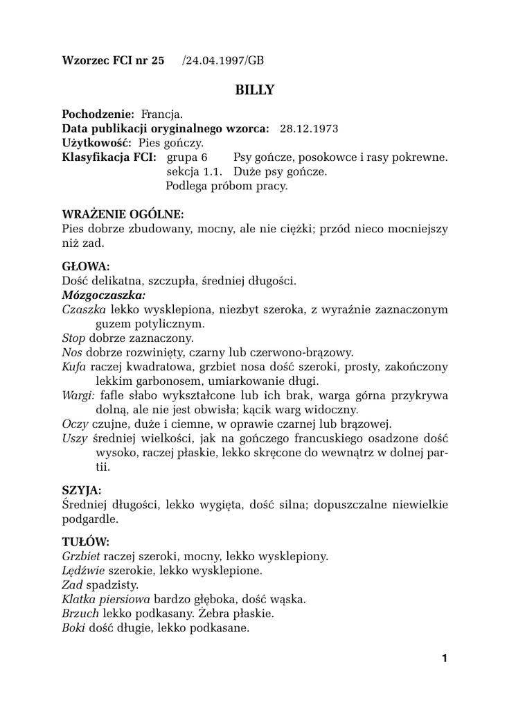 Wzorzec FCI nr 25 /24.04.1997/GB BILLY Pochodzenie: Francja. Data publikacji oryginalnego wzorca: 28.12.1973 Użytkowość: Pies gończy. Klasyfikacja FCI: grupa 6 Psy gończe, posokowce i rasy pokrewne. sekcja 1.1. Duże psy gończe. Podlega próbom pracy. WRAŻENIE OGÓLNE: Pies dobrze zbudowany, mocny, ale nie ciężki; przód nieco mocniejszy niż zad. GŁOWA: Dość delikatna, szczupła, średniej długości. Mózgoczaszka: Czaszka lekko wysklepiona, niezbyt szeroka, z wyraźnie zaznaczonym guzem potylicznym. Stop dobrze zaznaczony. Nos dobrze rozwinięty, czarny lub czerwono-brązowy. Kufa raczej kwadratowa, grzbiet nosa dość szeroki, prosty, zakończony lekkim garbonosem, umiarkowanie długi. Wargi: fafle słabo wykształcone lub ich brak, warga górna przykrywa dolną, ale nie jest obwisła; kącik warg widoczny. Oczy czujne, duże i ciemne, w oprawie czarnej lub brązowej. Uszy średniej wielkości, jak na gończego francuskiego osadzone dość wysoko, raczej płaskie, lekko skręcone do wewnątrz w dolnej partii. SZYJA: Średniej długości, lekko wygięta, dość silna; dopuszczalne niewielkie podgardle. TUŁÓW: Grzbiet raczej szeroki, mocny, lekko wysklepiony. Lędźwie szerokie, lekko wysklepione. Zad spadzisty. Klatka piersiowa bardzo głęboka, dość wąska. Brzuch lekko podkasany. Żebra płaskie. Boki dość długie, lekko podkasane. 1 OGON: Długi, mocny, niekiedy z niewielkim „piórem”. KOŃCZYNY: Kończyny przednie silne, proste. Łopatki dość długie, dobrze przylegające do klatki piersiowej. Kończyny tylne: Uda umiarkowanie umięśnione. Stawy skokowe umiarkowanie kątowane, mocne. Łapy dobrze wykształcone, raczej okrągłe; palce mocne, zwarte. RUCH: Swobodny galop. SKÓRA: Biała, czasami z ciemnobrązowymi, prawie czarnymi łatami; elastyczna i delikatna. SZATA: Sierść krótka, ostra w dotyku, czasem nieco szorstka. Umaszczenie całkowicie białe, białe z odcieniem „kawy z mlekiem”, białe z jasnopomarańczowymi lub cytrynowymi łatami, albo czaprakiem. WYMIARY: Wysokość w kłębie: - psy 60 - 70 cm, - suki 58 - 62 cm. WADY: Wszelkie odstępstwa od powyższego wzorca powinny być traktowane jako wady i oceniane w zależności od stopnia ich nasilenia. WADY DYSKWALIFIKUJĄCE: Agresja lub nadmierna lękliwość. Kufa zbyt krótka, zbyt długa lub zbyt wąska. Wyraźny przodozgryz, ale nieznaczny przodozgryz (0,5 cm) nie jest wadą dyskwalifikującą. Umaszczenie czarne lub czerwone. Każdy pies, wykazujący wyraźne deformacje budowy lub zaburzenia charakteru, powinien być zdyskwalifikowany. UWAGA: Samce muszą mieć dwa, prawidłowo wykształcone jądra, całkowicie umieszczone w mosznie. 2