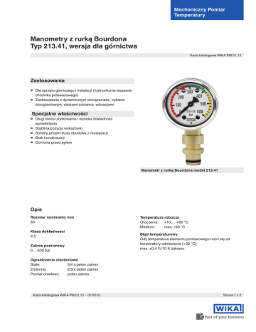 Mechaniczny Pomiar Temperatury Manometry z rurką Bourdona Typ 213.41, wersja dla górnictwa Karta katalogowa WIKA PM 01.12 Zastosowania Dla sprzętu górniczego i instalacji (hydrauliczne wsparcie chodnika przewozowego) Zastosowania z dynamicznym obciążeniami, cyklami obciążeniowym, skokami ciśnienia, wibracjami Specjalne właściwości Długi okres użytkowania i wysoka dokładność wyświetlania Stabilna pozycja wskazówki Solidny projekt (kuta obudowa z mosiądzu) Brak kondensacji Ochrona przed pyłem Manometr z rurką Bourdona model 213.41 Opis Rozmiar nominalny mm 50 Klasa dokładności 2,5 Zakres pomiarowy 0 ... 600 bar Temperatura robocza Otoczenia: +10 … +60 °C Medium: max. +60 °C Błąd temperaturowy Gdy temperatura elementu pomiarowego różni się od temperatury odniesienia (+20 °C): max. ±0,4 %/10 K zakresu Ograniczenia ciśnieniowe Stałe: 3/4 x pełen zakres Zmienne: 2/3 x pełen zakres Pomiar chwilowy: pełen zakres Karta katalogowa WIKA PM 01.12 ∙ 07/2010 Strona 1 z 2 Wersja standardowa Obudowa Kuty mosiądz Przyłącze procesowe Stop miedzi, Podłączenie dolne (radialne) Przyłącze procesowe wg DIN 20043, DN 10 Szyba Pleksiglas Obejma Zaciskany pierścień, stal nierdzewna, błyszcząca Element pomiarowy Stal nierdzewna, lutowanie twarde Ciecz wypełniająca Gliceryna 99,7 % Mechanizm Stop miedzi, części eksploatacyjne nowe srebro Podzielnia Stop miedzi, biała, z kołkiem oporowym, czarne nadruki Opcje Inne przyłącza procesowe Obudowa lakierowana zgodnie ze specyfikacją klienta Wskazówka Tworzywo, czarna Podzielnia: specjalne skale, napisy, specjalny lakier, pokrywana farbą świecącą Wskazówka: specjalny lakier, pokrywana farbą świecącą Wymiary w mm Wersja standardowa Przyłącze procesowe wg DIN 20043, DN 10 11596814.01 Przyłącze dolne NG Wymiary w mm 50 20,5 a b 31 D 51 D1 48 h±1 32 e 9 SW 14 Waga w kg 0,21 Informacje potrzebne do zamówienia Model / rozmiar nominalny / zakres pomiarowy/ przyłącze procesowe / opcje Specyfikacje podane w niniejszej karcie przedstawiają stan konstrukcyjny aktualny w momencie wydruku. Istnieje możliwość wprowadzenia modyfikacji i zmian w specyfikacji materiałowej. Strona 2 z 2 Karta katalogowa WIKA PM 01.12 ∙ 07/2010 WIKA Polska spółka z ograniczoną odpowiedzialnością sp.k. Ul. Łęgska 29/35, 87-800 Włocławek Tel.: (+48) 54 23 01 100 Fax: (+48) 54 23 01 101 E-mail: [email protected] www.wikapolska.pl