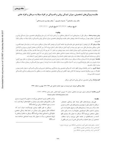 * Downloaded from umj.umsu.ac.ir at 1:22 IRST on Saturday March 4th 2017 1391/10/11 : 1391/08/24 : : . : . . . C . . t : . . C . : . : : : Email: jafar. [email protected] .( ) . .( ) .( ) .( ) ( ) ... ( ) .( ) - « » « .( ) » . Downloaded from umj.umsu.ac.ir at 1:22 IRST on Saturday March 4th 2017 «A » . .( ) ( ) . .( ) . .( ) . .( ) DNA .( ) .( ) .( ) . ( ) . .( ) : . .( ) . .( ) . .( ) ( 2 3 4 Amelang Hali Sarafino ) .( ) 1 Eysenk & Cooper .( ) Downloaded from umj.umsu.ac.ir at 1:22 IRST on Saturday March 4th 2017 . .( ) ( . ) . . . ( ) .( ) . .( ) ) .( ) . ( ( ) MMPI ( ) .( ) . .( ) . .( ) . C C . ( ) . - . : 1 2 3 4 Lillberg Shekelle Harris Spiegel &Davis ... - ) ( - . + ( ) . ) ( - ) ( . Downloaded from umj.umsu.ac.ir at 1:22 IRST on Saturday March 4th 2017 . . . - % % . .( ) . / . / . ( ) . : - – . . . . . . . .( ) / P / E N . . / / ) ( ) . ( ( ) . . :( ) / / C / / / / / / / / / / . . / / / C / . . / / t . Downloaded from umj.umsu.ac.ir at 1:22 IRST on Saturday March 4th 2017 / . . / / / / / :( ) t T / / / / / / / / / / / / / / / / / / . (P = / ) (t = / ) t . t . (P = / ) (t = / ) . . t (P = / ) t . C t :( ) T / / / / / / / / / / C / / (t = / ) ... (P = / ) (t = / ) t . C (t = / ) t . (P = / ) t Downloaded from umj.umsu.ac.ir at 1:22 IRST on Saturday March 4th 2017 . . C :( ) t T / / / / / / . (t = / ) t . (P = / ) . . .( ) ( ) . ( ) ( ) . . C . . .( ) .( ) C . . .( ) . 1 3 Ferrario & Zotti 2 Peacey Helgesson . .( ) . Downloaded from umj.umsu.ac.ir at 1:22 IRST on Saturday March 4th 2017 . ( ) ( ) ( ) . ( ) . . . . . .( ) . . . . . . . ( ) . 1 2 3 4 Golden Bammer Spiegel Norton ( ) ( ) ... References: 1. first results from the Heidelberg cohort study of Hassanpour A, Azari E. Quality of life and related the factors in cancer patients. National congress of Gesundheitspsychologie 2004; 12: 102-15. care in special diseases. Ahvaz; Ahvaz University Downloaded from umj.umsu.ac.ir at 1:22 IRST on Saturday March 4th 2017 2. 3. 7. 8. preliminary study university of Nijmegen. The health of women with breast cancer. Abstract Netherlands; 2004. Book of National congress of care in special 14. Nakaya N, Tsubono Y, Hosokawa T. Personality diseases. Ahvaz; Ahvaz University of Medical and the risk of cancer. J National Cancer Inst Sciences; 2006. (Persian) 2003; 95: 799-805. Lukman J. Text book of medical surgical nursing. 15. Sharma A, Sharp DM. National personality St predicts post operative stay after colorectal cancer Publishing Tehran: Aeejeh Publishing; 2002: 285- resection. The University of Hall 2007; 10(2): 90. 151-6. Tan M. Social support and coping in Turkish 16. Lazarus RS, Folkman S. Stress, appraisal, and patients with cancer. Cancer Nurs; 2007: 30(6): coping. New York: Springer; 1984: 231-457. 17. Cooper C, Payne R. Causes, Coping and Courtens AM, Stevens FCJ, Crebolder HFJM, Consequences of Stress at Work. New York: John Philipsen H. Longitudinal study and quality of life Wiley & Son Ltd; 1994. P. 234-587. 18. Vafaii B. Evaluation of the relation between life Nurs; 1996: 19(3): 162-9. stresses and blood neoplastic diseases in males Dincher TR, Harkness GA. Medical Surgical and females aged between 30 and 50]. Med J Nursing. Philadelphia. Harkness and Dincher Tabriz Univ Med Sci; 2000: 34(47): 47-54. Publishers; 2000: 239-68. (Persian) Gibs W. Tragedy of birth. J Shargh; 2001: 1(1): 19. Sarafino E P. Health Psychology: Biopsychosocial 10-12. (Persian) Interactions. United States: John Wiley & Sons, Demateuoo R. Health psychology. Tehran: Samt; INC; 2002. 1999. (Persian) 9. 13. Hali M, Magdalena S. Development of the revised NEO personality inventory for Indonesia: a and social support in cancer patients. Cancer 6. für Bamshad Z, Safikhani F. Assessment of mental 498-504. 5. Zeitschrift of Medical Sciences; 2006. (Persian) 3st volume. Translated by Ebrahimi N. 1 4. elderly. 20. Lillberg K, Verkasalo PK, Kaprio J, Teppo L, Bagby R, Vachon D, Bulmash EL, Toneatto T, Helenius H, Koskenvuo M. Stressful life events Quilty LC, Costa P. Pathological gambling and and risk of breast cancer in 10808 women: A fivefactor model of personality. J Affect Disord; cohort study. Am J Epidemiol 2003; 157: 415-23. 2007: 43(17): 873-90. 21. Zahiroddin AR, Sadighi G. Depression among 10. Hosaka T, Fukunishi I. Development of type C personality, cross cultural application. Psychiatr Behav Sci; 1999: 24(2): 73-6. personality: stress research. New York: John Wiley and Sons; 1998. M, Hasselbach Fac Med 2003; 27(3): 203-7. (Persian) 22. Sadock BJ, Kaplan HI. Synopsis of psychiatry. 9th 11. Eysenk HJ, Cooper CL. Stress, disease and 12. Amelang 100 diabetics referring to university hospitals. J Ed. Philadelphia: Lipincott Williams & Wilkins; 2003. 23. Bammer K, Newberry BH. Stress and cancer. P, Stürmer T. Personality, cardiovascular disease, and cancer: Toronto: Hogrefe; 1982. 24. Shekelle R A. Shryock P, Ogleby M, Lepper J. Diet, serum cholesterol, and death from coronary heart disease. New Engl J Med 1989; 30(4): 65- survey. Eur J Cancer 2006; 42: 2585-9. 32. Helgesson O, Cabrera C, Lapidus L, Bengtsson C, Lissner L. Self-reported stress levels predict 70. Downloaded from umj.umsu.ac.ir at 1:22 IRST on Saturday March 4th 2017 awareness in young women: an international 25. Harris CA, Zakowski SG. Comparisons of distress subsequent breast cancer in a cohort of Swedish in adolescents of cancer patients and controls. women. Eur J Cancer Prevent 2003; 12(5): 377- Psycho-Oncology; 2003; 12: 173-82. 81. 26. Spiegel D, Giese-Davis J. Depression and cancer: Mechanisms and disease progression. Biol 33. Wellman B. Networks in the Global Village, Boulder, CO: Westview Press; 1999. 34. Ferrario SR, Zotti AM, Ippoliti M, Zotti P. Psychiatry 2003; 54: 269-82. 27. Agajani S. Review and determine the relationship Caregiving-related needs analysis: a proposed between personality type with coping with stress model reflecting current research and socio- the political students (Dissertation). Tehran: Tarbiat development