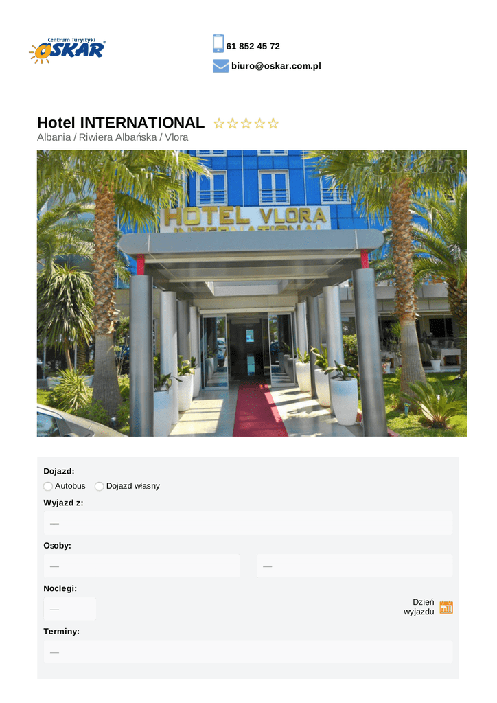 61 852 45 72 [email protected] Hotel INTERNATIONAL Albania / Riwiera Albańska / Vlora Dojazd: Autobus Dojazd własny Wyjazd z: Osoby: Noclegi: Dzień wyjazdu Terminy: Pokój: Wyżywienie: Najtańsza oferta Styczniowe Rabaty zniżka 20% cena katalogowa do 6 marca 2017: 4084,00 zł do 6 marca 2017: 1225,20 zł do 3 sierpnia 2017: 0,00 zł do 3 sierpnia 2017: 2858,80 zł Suma: 4084,00 zł Suma: 4084,00 zł Opis oferty Miejscowość Atuty Wycieczki bliskość centrum fakultatywne kryty basen, centrum spa, sauna 5 różnych barów serwujących napoje przez cały dzień Opinie telewizor LCD z dostępem do kanałów telewizji kablowej w pokojach bezpłatny Internet Wi-Fi Rozkład jazdy Położenie Hotel International położony jest w odległości zaledwie 10 metrów od brzegu Zatoki Vlorskiej. Obiekt oferuje komfortowe i nowoczesne pokoje oraz apartamenty. W hotelu znajduje się kryty basen, wanna z hydromasażem, sauny i centrum spa. Do dyspozycji gości bezpłatny parking oraz dostęp do bezprzewodowego Internetu WiFi. Hotelowa restauracja serwuje dania kuchni międzynarodowej do wyboru z karty. Na terenie obiektu znajduje się też 5 różnych barów, w których przez cały dzień podawane są napoje. Hotel International usytuowany jest w pobliżu głównych atrakcji miasta tuż przy głównym punkcie promenady. Zakwaterowanie Pokoje dwuosobowe wyposażone są w telewizor LCD z dostępem do kanałów telewizji kablowej z dużym oknem widokowym. Część pokoi jest z widokiem na morze. W łazience znajduje się suszarka do włosów oraz prysznic lub wanna. Dostępne opcje wyżywienia śniadania - serwowane (w cenie) obiadokolacje - we własnym zakresie Dostępne opcje zakwaterowania pokój 2 osobowy Pakiet KOMFORT gwarancja wyboru miejsca w autokarze napoje w autokarze w cenie (6 x do wyboru: kawa, herbata, zimny napój 0,2l) cena: 50 zł/os Pakiet PRESTIGE gwarancja wyboru miejsca w autokarze napoje w autokarze w cenie (6 x do wyboru: kawa, herbata, zimny napój 0,2l) pierwszeństwo wejścia na pokład autokaru nadbagaż 5 kg w cenie suchy prowiant na drogę powrotną cena: 100 zł/os Karta Dużej Rodziny www.oskar.com.pl/zalaczniki/karta_duzej_rodziny Warunki promocji FIRST MINUTE www.oskar.com.pl/zalaczniki/warunki_promocji Ubezpieczenie Warunki ubezpieczenia Bezpieczne Podróże Signal Iduna dokument do pobrania www.oskar.com.pl/zalaczniki/owu Warunki ubezpieczenia Kosztów Imprezy Turystycznej Signal Iduna dokument do pobrania www.oskar.com.pl/zalaczniki/owurg Turystyczny Fundusz Gwarancyjny W związku z powołaniem do życia w dniu 26.11.2016 Turystycznego Funduszu Gwarancyjnego każdy klient Biura Podróży Oskar zobowiązany jest do zapłaty kwoty w wysokości 10zł/os. przy każdorazowej rezerwacji imprezy turystycznej (obowiązuje od dnia 26.11.2016). Kwota przeznaczona na Turystyczny Fundusz Gwarancyjny zostanie automatycznie doliczona do wartości rezerwacji (w momencie jej dokonania). Wyjątkiem są imprezy turystyczne odbywające się w krajach posiadających granicę z Rzeczpospolitą Polską. Składka nie jest przychodem biura. Udogodnienia Widok na morze Klimatyzacja Regulowane fotele Tacki Nowoczesna flota Zawodowy kierowca Pasy bezpieczeństwa Toaleta w autokarze Podnóżki Club hotel Fitness Wi-Fi Lodówka Basen kryty Winda Blisko centrum Życie nocne Bez paszportu Blisko plaży Restauracja hotelowa Region nadmorski Program ramowy Dzień 1 Wyjazd z Polski zgodnie z rozkładem jazdy autokarów. Przejazd przez Czechy, Słowację, Węgry, Serbię, Macedonię. Dzień 2 Przyjazd do Vlory w godzinach południowych. Zakwaterowanie. Spotkanie informacyjne z rezydentem. Dzień 3-13 Pobyt na miejscu, możliwość korzystania z dodatkowych wycieczek fakultatywnych. Dzień 14 Wykwaterowanie do godz. 09.00. Czas wolny. Wyjazd do Polski w godzinach popołudniowych. Dzień 15 Przejazd przez Macedonię, Serbię, Węgry, Słowację, Czechy. Przyjazd do Polski. Orientacyjne godziny powrotu do poszczególnych miast zgodnie z rozkładem jazdy autokarów. Cena obejmuje Cena obejmuje przejazd autokarem klasy LUX (klimatyzacja, cafe - bar, DVD, WC) zakwaterowanie: 12 noclegów w Hotelu INTERNATIONAL wyżywienie: 12 śniadań opiekę pilota w czasie podróży opieka rezydenta na miejscu ubezpieczenie KL 10000 euro, NNW 10000 zł, bagaż (utrata 500 zł) Cena nie obejmuje Dopłaty wymagane na miejscu opłata klimatyczna 13 euro/os; dzieci do 12 lat płacą 50% - płatne u pilota w autokarze Dopłaty opcjonalne ubezpieczenie od chorób przewlekłych i nowotworowych KL 20000 euro, NNW 10000 zł, bagaż (utrata 500 zł): 200 zł/os ubezpieczenie od kosztów rezygnacji: 3,5% wartości rezerwacji Informacje dodatkowe dokumenty: paszport lub dowód osobisty (zgodnie z obowiązującymi przepisami) zaleca się wyrobienie karty EKUZ brak aneksów kuchennych chyba, że oferta stanowi inaczej Chcesz wiedzieć szybciej? Polub nas na facebooku Wycieczki fakultatywne 45 € /os. Riwiera Albanska 30 € /os. Berat - Ardenica Apollonia 28 € /os. Wieczor albanski 35 € /os. 45 € /os. Girjokastra i Blekitne Przelecz Llogara i Oko Zamek Lekursi OSKAR Sp. z o.o. pl.Wolności 2/4c, 61-738 Poznań Potrzebujesz pomocy? Zadzwoń lub napisz: 61 852 45 72 [email protected] Zadzwoń Projekt i wdrożenie: Simply User
