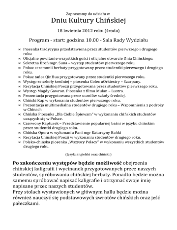 Zapraszamy do udziału w Dniu Kultury Chińskiej 18 kwietnia 2012 roku (środa) Program - start: godzina 10.00 - Sala Rady Wydziału • Piosenka tradycyjna przedstawiona przez studentów pierwszego i drugiego roku • Oficjalne powitanie wszystkich gości i oficjalne otwarcie Dnia Chińskiego. • Sekretna Broń mgr. Suna – występ studentów pierwszego roku. • Pokaz ceremonii herbaty przygotowany przez studentki pierwszego i drugiego roku. • Pokaz tańca QinHua przygotowany przez studentki pierwszego roku. • Występ ze szkoły średniej – piosenka Golec uOrkiestry – Szarpany. • Recytacja Chińskiej Poezji przygotowana przez studentów pierwszego roku. • Występ Magdy Gawron. Piosenka z filmu Mulan – Lustro. • Prezentacja przygotowana przez uczniów szkoły średniej. • Chiński Rap w wykonaniu studentów pierwszego roku. • Prezentacja multimedialna studentów drugiego roku – Wspomnienia z podroży w Chinach • Chińska Piosenka „Dla Ciebie Śpiewam” w wykonaniu chińskich studentów uczących się w Polsce. • Czerwony Kapturek – Przedstawienie popularnej baśni w języku chińskim przez studentki drugiego roku. • Chińska Opera w wykonaniu Pani mgr Katarzyny Bańki • Recytacja Chińskiej Poezji w wykonaniu studentów drugiego roku. • Polsko-chińska piosenka „Wszyscy Polacy” w wykonaniu wszystkich studentów drugiego roku. (Język: angielski oraz chiński.) Po zakończeniu występów będzie możliwość obejrzenia chińskiej kaligrafii i wycinanek przygotowanych przez naszych studentów, spróbowania chińskiej herbaty. Ponadto będzie można samemu spróbować napisać kaligrafie i otrzymać swoje imię napisane przez naszych studentów. Przy stolach wystawionych w głównym hallu będzie można również nauczyć się podstawowych zwrotów chińskich oraz jeść pałeczkami.