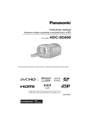 Instrukcja obsługi Kamera wideo wysokiej rozdzielczości (HD) Nr modelu HDC-SD800 Przed pierwszym włączeniem kamery prosimy o dokładne przeczytanie instrukcji obsługi. VQT3K59 until 2010/12/27 Informacje dotyczące bezpieczeństwa ∫ Informacje na temat formatu nagrywania filmów ∫ Odszkodowanie za zawartość zapisów W przypadku filmów nagrywanych za pomocą kamery, można wybrać format nagrywania AVCHD, 1080/50p lub iFrame. (l 44, 55) AVCHD: Ten format służy do nagrywania w wysokiej rozdzielczości. Nadaje się do oglądania na telewizorach o dużej przekątnej ekranu lub do zapisywania na płytach. 1080/50p: Jest to tryb nagrywania 1080/50p (1920k1080/50 progresywny), w którym można nagrywać z najwyższą jakością*. Sceny zarejestrowane w trybie 1080/50p można zapisać lub odtworzyć za pomocą tego urządzenia lub HD Writer AE 3.0. * Oznacza to najwyższą jakość zapewnianą przez kamerę. Panasonic nie ponosi odpowiedzialności za szkody bezpośrednio lub pośrednio spowodowane jakimikolwiek problemami skutkującymi utratą nagranych lub edytowanych materiałów, jak również nie udziela gwarancji w odniesieniu do jakichkolwiek materiałów, w przypadku nieprawidłowego działania nagrywania lub edycji. Analogicznie, powyższe zastrzeżenia mają zastosowanie w przypadku dokonywania jakichkolwiek napraw kamery. iFrame: Jest to format nagrywania odpowiedni do odtwarzania i obróbki na komputerach Mac (iMovie’11). Korzystając z iMovie’11, można importować filmy iFrame szybciej niż filmy AVCHD. Ponadto, rozmiar pliku importowanych filmów iFrame będzie mniejszy niż filmów AVCHD. ≥ Brak zgodności z filmem nagranym w formacie AVCHD lub 1080/50p. -2- ∫ Karty, których można używać z tą kamerą Karta pamięci SD, karta pamięci SDHC i karta pamięci SDXC ≥ Karty pamięci o pojemności 4 GB lub większej bez logo SDHC lub karty pamięci o pojemności 48 GB lub większej bez logo SDXC nie są zgodne ze specyfikacją karty SD. ≥ Więcej informacji o kartach SD znajduje się na stronie 13. ∫ W niniejszej instrukcji obsługi ≥ Karta pamięci SD, karta pamięci SDHC oraz karta pamięci SDXC są określane wspólnie jako “karta SD”. ≥ Funkcje, których można używać w trybie nagrywania filmów: Funkcje, których można używać w trybie robienia zdjęć: ≥ Funkcje, których można używać w trybie odtwarzania filmów: Funkcje, których można używać w trybie odtwarzania zdjęć: ≥ Odnośne strony oznaczone zostały strzałką, np. l 00 -3- Spis treści Informacje dotyczące bezpieczeństwa ... 2 Przygotowanie Zaawansowane (Nagrywanie) Wykaz części i zasady ich obsługi ..........6 Zasilanie ....................................................9 Wkładanie/wyjmowanie akumulatora ........................................ 9 Ładowanie akumulatora .................... 10 Czas ładowania i czas nagrywania ... 11 Przygotowanie kart SD ........................... 13 Karty, które można używać z tą kamerą .......................................... 13 Wkładanie/wyjmowanie karty SD ...... 14 Włączanie/wyłączanie kamery ............... 15 Włączanie i wyłączanie zasilania przy użyciu przycisku zasilania ......... 15 Włączanie i wyłączanie urządzenia przy użyciu ekranu LCD .................... 15 Wybieranie trybu..................................... 16 Jak używać ekranu dotykowego ...........17 Informacje na temat menu dotykowego ....................................... 18 Ustawianie daty i czasu.......................... 19 Funkcja przybliżania i oddalania (zoom) ...................................................... 42 Szybkość funkcji zoom – informacje ......................................... 42 Rozszerzony zoom optyczny ............ 42 Funkcja stabilizacji obrazu .................... 43 Nagrywanie 1080/50p ............................. 44 Nagrywanie z funkcją dotyku ................ 45 Ikony funkcji dotykowych .................. 45 Funkcje nagrywania ikon obsługi ......... 48 Ikony obsługi ..................................... 48 Funkcje nagrywania menu..................... 54 Nagrywanie ręczne ................................. 71 Balans bieli ....................................... 72 Ręczna regulacja czasu naświetlania/przysłony ...................... 73 Ręczna regulacja ostrości................. 74 Nagrywanie wideo 3D............................. 75 Funkcje niedostępne podczas nagrywania w 3D .............................. 77 Podstawowe Czynności zaawansowane (odtwarzanie) Przed rozpoczęciem nagrywania...........20 Nagrywanie filmów ................................. 22 Robienie zdjęć......................................... 24 Robienie zdjęć w trybie nagrywania filmów ................................................ 25 Tryb Intelligent Auto ...............................26 Odtwarzanie filmów/zdjęć ......................28 Korzystanie z ekranu menu ................... 31 Korzystanie z szybkiego menu.......... 32 Korzystanie z menu ustawień................ 33 Używanie pilota .......................................40 Korzystanie z przycisków strzałek/ przycisku OK ..................................... 41 Funkcje odtwarzania .............................. 78 Odtwarzanie filmów za pomocą ikony obsługi ..................................... 78 Wyodrębnianie zdjęć z filmów........... 79 Indeks czasowy najlepszych fragmentów ....................................... 79 Powtarzanie odtwarzania.................. 80 Kontynuowanie poprzedniego odtwarzania ...................................... 80 Powiększanie odtwarzanego zdjęcia (Odtwarzanie z powiększeniem) ................................ 81 Różne funkcje odtwarzania.................... 82 Odtwarzanie filmów/zdjęć zgodnie z datą nagrania ................................. 82 Odtwarzanie najlepszych fragmentów ....................................... 83 -4- Zmiana ustawień odtwarzania i wyświetlenie pokazu slajdów ............ 85