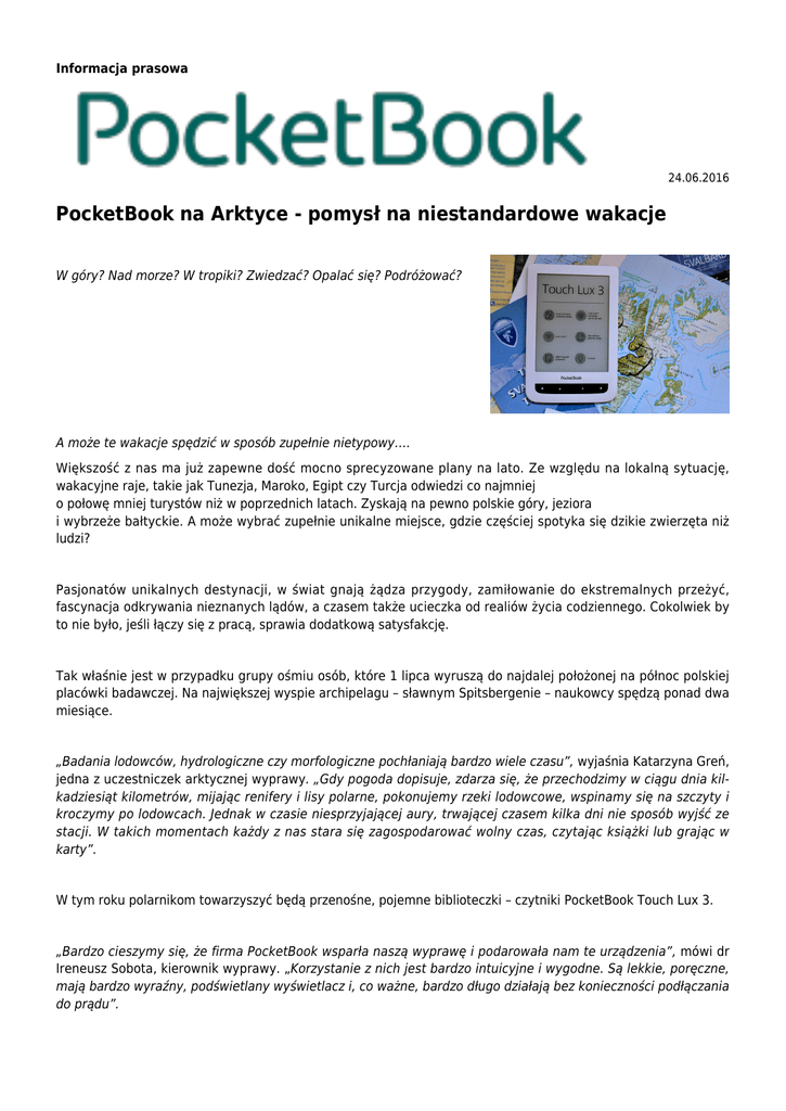 Informacja prasowa 24.06.2016 PocketBook na Arktyce - pomysł na niestandardowe wakacje W góry? Nad morze? W tropiki? Zwiedzać? Opalać się? Podróżować? A może te wakacje spędzić w sposób zupełnie nietypowy…. Większość z nas ma już zapewne dość mocno sprecyzowane plany na lato. Ze względu na lokalną sytuację, wakacyjne raje, takie jak Tunezja, Maroko, Egipt czy Turcja odwiedzi co najmniej o połowę mniej turystów niż w poprzednich latach. Zyskają na pewno polskie góry, jeziora i wybrzeże bałtyckie. A może wybrać zupełnie unikalne miejsce, gdzie częściej spotyka się dzikie zwierzęta niż ludzi? Pasjonatów unikalnych destynacji, w świat gnają żądza przygody, zamiłowanie do ekstremalnych przeżyć, fascynacja odkrywania nieznanych lądów, a czasem także ucieczka od realiów życia codziennego. Cokolwiek by to nie było, jeśli łączy się z pracą, sprawia dodatkową satysfakcję. Tak właśnie jest w przypadku grupy ośmiu osób, które 1 lipca wyruszą do najdalej położonej na północ polskiej placówki badawczej. Na największej wyspie archipelagu – sławnym Spitsbergenie – naukowcy spędzą ponad dwa miesiące. „Badania lodowców, hydrologiczne czy morfologiczne pochłaniają bardzo wiele czasu”, wyjaśnia Katarzyna Greń, jedna z uczestniczek arktycznej wyprawy. „Gdy pogoda dopisuje, zdarza się, że przechodzimy w ciągu dnia kilkadziesiąt kilometrów, mijając renifery i lisy polarne, pokonujemy rzeki lodowcowe, wspinamy się na szczyty i kroczymy po lodowcach. Jednak w czasie niesprzyjającej aury, trwającej czasem kilka dni nie sposób wyjść ze stacji. W takich momentach każdy z nas stara się zagospodarować wolny czas, czytając książki lub grając w karty”. W tym roku polarnikom towarzyszyć będą przenośne, pojemne biblioteczki – czytniki PocketBook Touch Lux 3. „Bardzo cieszymy się, że firma PocketBook wsparła naszą wyprawę i podarowała nam te urządzenia”, mówi dr Ireneusz Sobota, kierownik wyprawy. „Korzystanie z nich jest bardzo intuicyjne i wygodne. Są lekkie, poręczne, mają bardzo wyraźny, podświetlany wyświetlacz i, co ważne, bardzo długo działają bez konieczności podłączania do prądu”. Dla producenta projekt ten jest również niezwykle ciekawym doświadczeniem. „Zdajemy sobie sprawę, że na Spitsbergenie w czasie miesięcy wakacyjnych nie odnotowuje się najniższych temperatur, ale z chęcią dowiemy się, jak nawet w takich surowych warunkach sprawdzą się nasze czytniki”, deklaruje Maksym Zhelezniak, , Szef Działu Sprzedaży PocketBook S.A. na obszar Europy Środkowej i Wschodniej. „Jesteśmy pewni jakości reprezentowanej przez model PocketBook Touch Lux 3, zatem nie mamy wątpliwości, że polscy polarnicy nie zawiodą się, korzystając z naszych urządzeń”. Relacje z arktycznych przygód czytników PocketBook będzie można śledzić na fanpage’ach stacji polarnej oraz producenta urządzeń. Dodatkowe informacje na www.pocketbook-int.com/pl oraz na fanpage'u https://www.facebook.com/PocketBookPoland PocketBook jest czwartym co do wielkości globalnym producentem wysokiej jakości czytników książek elektronicznych z ekranami wykonanymi w technologii E Ink (zwaną też papierem elektronicznym). Spółka ma w swojej ofercie także czytniki multimedialne oraz tablety, które pracują w oparciu o system Android. Firma powstała w 2007 roku i ma swoją siedzibę w Lugano w Szwajcarii. Produkty PocketBook są dostępne w sprzedaży w 24 krajach. Dzięki połączeniu sprzętu, unikalnego oprogramowania oraz ergonomicznego wzornictwa czytniki e-booków PocketBook pozycjonują się w segmencie „premium” tego rynku.