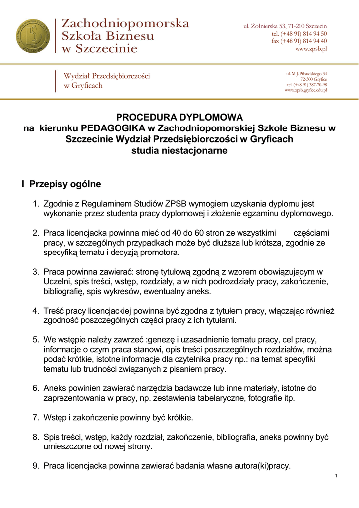 ul. Żołnierska 53, 71-210 Szczecin tel. (+48 91) 814 94 50 fax (+48 91) 814 94 40 www.zpsb.pl Wydział Przedsiębiorczości w Gryficach ul. M.J. Piłsudskiego 34 72-300 Gryfice tel. (+48 91) 387-70-98 www.zpsb.gryfice.edu.pl PROCEDURA DYPLOMOWA na kierunku PEDAGOGIKA w Zachodniopomorskiej Szkole Biznesu w Szczecinie Wydział Przedsiębiorczości w Gryficach studia niestacjonarne I Przepisy ogólne 1. Zgodnie z Regulaminem Studiów ZPSB wymogiem uzyskania dyplomu jest wykonanie przez studenta pracy dyplomowej i złożenie egzaminu dyplomowego. 2. Praca licencjacka powinna mieć od 40 do 60 stron ze wszystkimi częściami pracy, w szczególnych przypadkach może być dłuższa lub krótsza, zgodnie ze specyfiką tematu i decyzją promotora. 3. Praca powinna zawierać: stronę tytułową zgodną z wzorem obowiązującym w Uczelni, spis treści, wstęp, rozdziały, a w nich podrozdziały pracy, zakończenie, bibliografię, spis wykresów, ewentualny aneks. 4. Treść pracy licencjackiej powinna być zgodna z tytułem pracy, włączając również zgodność poszczególnych części pracy z ich tytułami. 5. We wstępie należy zawrzeć :genezę i uzasadnienie tematu pracy, cel pracy, informacje o czym praca stanowi, opis treści poszczególnych rozdziałów, można podać krótkie, istotne informacje dla czytelnika pracy np.: na temat specyfiki tematu lub trudności związanych z pisaniem pracy. 6. Aneks powinien zawierać narzędzia badawcze lub inne materiały, istotne do zaprezentowania w pracy, np. zestawienia tabelaryczne, fotografie itp. 7. Wstęp i zakończenie powinny być krótkie. 8. Spis treści, wstęp, każdy rozdział, zakończenie, bibliografia, aneks powinny być umieszczone od nowej strony. 9. Praca licencjacka powinna zawierać badania własne autora(ki)pracy. 1 ul. Żołnierska 53, 71-210 Szczecin tel. (+48 91) 814 94 50 fax (+48 91) 814 94 40 www.zpsb.pl Wydział Przedsiębiorczości w Gryficach ul. M.J. Piłsudskiego 34 72-300 Gryfice tel. (+48 91) 387-70-98 www.zpsb.gryfice.edu.pl 10. Bibliografia pracy powinna zawierać minimum 15 pozycji literaturowych (książek, artykułów, źródeł, źródła statystyczne czy pochodzące z placówek oświatowych i inne) 11. Literatura i źródła powinny być dostosowane do tematu pracy. 12. Praca powinna zawierać analizę literatury, wyników badań własnych studenta oraz wnioski. II Seminarium dyplomowe 1. Promotora grupy seminaryjnej wyznacza dziekan. 2. Dyplomowanie prowadzą pracownicy naukowo-dydaktyczni posiadający co najmniej stopień naukowy doktora. 3. Student bierze udział w zajęciach seminaryjnych oraz ma prawo do konsultacji u opiekuna danej grupy seminaryjnej w wymiarze przewidzianym programem studiów. 4. Jeśli promotorem pracy nie jest specjalista z danego kierunku warunek ten musi spełniać recenzent (np. jeśli promotorem pracy na kierunku pedagogika jest filozof lub socjolog – recenzentem musi być pedagog). Możliwe jest także powołanie dodatkowego recenzenta – specjalisty z danej dziedziny wiedzy. III Temat pracy dyplomowej 1. Temat pracy dyplomowej musi być zaakceptowany przez promotora, który ustala także szczegółowy zakres pracy. Temat pracy powinien odpowiadać kierunkowi oraz specjalności/specjalizacji studiów oraz zainteresowaniom studenta. 2. Tematy prac przedkładane są przez promotora Dziekanowi nie później niż do końca pierwszego semestru trwania seminarium. W późniejszym terminie zmiana tematu wymaga zgody Dziekan Wydziału. 2 ul. Żołnierska 53, 71-210 Szczecin tel. (+48 91) 814 94 50 fax (+48 91) 814 94 40 www.zpsb.pl Wydział Przedsiębiorczości w Gryficach ul. M.J. Piłsudskiego 34 72-300 Gryfice tel. (+48 91) 387-70-98 www.zpsb.gryfice.edu.pl 3. Ostatecznej akceptacji tematów prac dyplomowych dokonuje Dziekan Wydziału. 4. Każdy temat powinien być realizowany przez jednego studenta. IV Techniczne zasady pisania pracy licencjackiej: Praca licencjacka powinna być pisana w programie Word. • Ustawienia strony w pracy powinny być następujące: lewy margines: 2,5 cm (należy dodatkowo uwzględnić miejsce na oprawę pracy), prawy margines: 2,5 cm, od dołu i od góry strony margines: 2,5 cm. • Czcionka: tekst podstawowy: Times New Roman, 12, normalny, tytuły rozdziałów: Times New Roman, 16, normalny bold, tytuły podrozdziałów: Times New Roman 14, normalny bold, przypisy dolne: Times New Roman, 10, normalny. • Praca powinna zawierać wcięcia przed każdym akapitem 1 cm. • W tekście odstęp pomiędzy wierszami (interlinia) powinien wynosić 1,5 spacji. • W bibliografii pomiędzy wierszami (interlinia) odstęp powinien wynosić 1,5 spacji. • Tekst pracy powinien być wyjustowany (wyrównany do prawej i lewej). • Numeracja stron w pracy powinna być ciągła, bez numeru na pierwszej stronie, napisana cyframi arabskimi (należy wstawić opcję: inne na 1 stronie), w prawym dolnym rogu. • Należy zachować jednolitość prezentacji całego tekstu. • Na końcu tytułów rozdziałów i podrozdziałów nie powinno być kropki. • Cytaty z literatury piszemy czcionką prostą i umieszczamy w cudzysłowiu. • Każda myśl pochodząca od innego autora powinna być opisana przypisem. • W tekście umieszczamy kursywę wyłącznie w pisowni zwrotów obcojęzycznych i zaznaczenia treści wywiadów, pochodzących z badań własnych studenta(ki). • Każda tabela w pracy powinna być ponumerowana, zatytułowana nad tabelą, a pod tabelą powinno być umieszczone źródło pochodzenia, nawet jeśli tabela jest wynikiem badań własnych studenta(ki). • Analogiczną zasadę stosujemy do wykresów. 3 ul. Żołnierska 53, 71-210 Szczecin tel. (+48 91) 814 94 50 fax (+48 91) 814 94 40 www.zpsb.pl Wydział Przedsiębiorczości w Gryficach ul. M.J. Piłsudskiego 34 72-300 Gryfice tel. (+48 91) 387-70-98 www.zpsb.gryfice.edu.pl V Ogólne zasady konstrukcji przypisów bibliograficznych i bibliografii: • W pracy licencjackiej stosujemy wyłącznie przypisy 