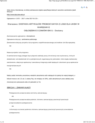 Ogłoszenie 1 z 12 http://bzp.uzp.gov.pl/Out/Browser.aspx?id=70803415-7ff8-49a9-84f7-... Adres strony internetowej, na której zamieszczona będzie specyfikacja istotnych warunków zamówienia (jeżeli dotyczy): http://www.dzp.uksw.edu.pl Ogłoszenie nr 11971 - 2017 z dnia 2017-01-20 r. Warszaw a: DOSTAWA ARTYKUŁÓW PROMOCYJNYCH Z LOGO DLA UKSW W WARSZAW I E OGŁOSZENI E O ZAMÓWI ENI U - Dost aw y Zam ieszczan ie ogł oszen ia: obowiązkowe Ogł oszen ie dot yczy: zamówienia publicznego Zam ów ien ie dot yczy pr oj ek t u lu b pr ogr am u w spół f in an sow an ego ze śr odk ów Un ii Eu r opej sk iej nie Nazw a pr oj ek t u lu b pr ogr am u O zam ów ien ie m ogą u biegać się w ył ączn ie zak ł ady pr acy ch r on ion ej or az w yk on aw cy, k t ór ych dział aln ość, lu b dział aln ość ich w yodr ębn ion ych or gan izacyj n ie j edn ost ek , k t ór e będą r ealizow ał y zam ów ien ie, obej m u j e społ eczn ą i zaw odow ą in t egr acj ę osób będących czł on k am i gr u p społ eczn ie m ar gin alizow an ych nie Należy podać minimalny procentowy wskaźnik zatrudnienia osób należących do jednej lub więcej kategorii, o których mowa w art. 22 ust. 2 ustawy Pzp, nie mniejszy niż 30%, osób zatrudnionych przez zakłady pracy chronionej lub wykonawców albo ich jednostki (w %) SEKCJA I : ZAMAWI AJĄCY Post ępow an ie pr zepr ow adza cen t r aln y zam aw iaj ący nie Post ępow an ie pr zepr ow adza podm iot , k t ór em u zam aw iaj ący pow ier zył / pow ier zyli pr zepr ow adzen ie post ępow an ia nie I n f or m acj e n a t em at podm iot u k t ór em u zam aw iaj ący pow ier zył / pow ier zyli pr ow adzen ie post ępow an ia: 2017-01-20 14:41 Ogłoszenie 2 z 12 http://bzp.uzp.gov.pl/Out/Browser.aspx?id=70803415-7ff8-49a9-84f7-... Post ępow an ie j est pr zepr ow adzan e w spóln ie pr zez zam aw iaj ących nie Jeżeli tak, należy wymienić zamawiających, którzy wspólnie przeprowadzają postępowanie oraz podać adresy ich siedzib, krajowe numery identyfikacyjne oraz osoby do kontaktów wraz z danymi do kontaktów: Post ępow an ie j est pr zepr ow adzan e w spóln ie z zam aw iaj ącym i z in n ych pań st w czł on k ow sk ich Un ii Eu r opej sk iej nie W pr zypadk u pr zepr ow adzan ia post ępow an ia w spóln ie z zam aw iaj ącymi z in n ych pań st w czł on k ow sk ich Un ii Eu r opej sk iej – maj ące zast osow an ie k r aj ow e pr aw o zam ów ień pu bliczn ych : I n f or m acj e dodat k ow e: I . 1) NAZW A I ADRES: Uniwersytet Kardynała Stefana Wyszyńskiego w Warszawie, krajowy numer identyfikacyjny 195600000, ul. ul. Dewajtis 5, 01815 Warszawa, woj. mazowieckie, państwo Polska, tel. 225 618 943, e-mail [email protected], faks 225 618 944. Adres strony internetowej (URL): I . 2) RODZAJ ZAMAW I AJĄCEGO: Inny: uczelnia publiczna I .3) W SPÓLNE UDZI ELANI E ZAMÓW I ENI A ( j eżeli dot yczy) : Podział obowiązków między zamawiającymi w przypadku wspólnego przeprowadzania postępowania, w tym w przypadku wspólnego przeprowadzania postępowania z zamawiającymi z innych państw członkowskich Unii Europejskiej (który z zamawiających jest odpowiedzialny za przeprowadzenie postępowania, czy i w jakim zakresie za przeprowadzenie postępowania odpowiadają pozostali zamawiający, czy zamówienie będzie udzielane przez każdego z zamawiających indywidualnie, czy zamówienie zostanie udzielone w imieniu i na rzecz pozostałych zamawiających): I .4) KOMUNI KACJA: Nieogr an iczon y, peł n y i bezpośr edn i dost ęp do dok u m en t ów z post ępow an ia możn a u zysk ać pod adr esem ( URL) tak www.dzp.uksw.edu.pl Adr es st r on y in t er n et ow ej , n a k t ór ej zam ieszczon a będzie specyf ik acj a ist ot n ych w ar u n k ów zam ów ien ia tak 2017-01-20 14:41 Ogłoszenie 3 z 12 http://bzp.uzp.gov.pl/Out/Browser.aspx?id=70803415-7ff8-49a9-84f7-... www.dzp.uksw.edu.pl Dost ęp do dok u m en t ów z post ępow an ia j est ogr an iczon y - w ięcej in f or m acj i m ożn a u zyskać pod adr esem nie Of er t y lu b w n iosk i o dopu szczen ie do u dział u w post ępow an iu n ależy pr zesył ać: Elek t r on iczn ie nie adres Dopu szczon e j est pr zesł an ie of er t lu b w n iosk ów o dopu szczen ie do u dział u w post ępow an iu w in n y sposób: nie W ym agan e j est pr zesł an ie of er t lu b w n iosk ów o dopu szczen ie do u dział u w post ępow an iu w in n y sposób: tak Inny sposób: za pośrednictwem operatora pocztowego lub osobiście Adres: Uniwersytet Kardynała Stefana Wyszyńskiego w Warszawie, Seretariat Kanclerza (pokój nr 035) ul. Dewajtis 5, 01-815 Warszawa Kom u n ik acj a elek t r on iczn a w ym aga k or zyst an ia z n ar zędzi i u r ządzeń lu b f or m at ów plik ów , k t ór e n ie są ogóln ie dost ępn e nie Nieograniczony, pełny, bezpośredni i bezpłatny dostęp do tych narzędzi można uzyskać pod adresem: (URL) SEKCJA I I : PRZEDMI OT ZAMÓWI ENI A I I .1) Nazw a n adan a zam ów ien iu pr zez zam aw iaj ącego: DOSTAWA ARTYKUŁÓW PROMOCYJNYCH Z LOGO DLA UKSW W WARSZAWIE Nu m er r ef er en cyj n y: DZP.371.01.2017 2017-01-20 14:41 Ogłoszenie 4 z 12 http://bzp.uzp.gov.pl/Out/Browser.aspx?id=70803415-7ff8-49a9-84f7-... Pr zed w szczęciem post ępow an ia o u dzielen ie zam ów ien ia pr zepr ow adzon o dialog t ech n iczn y nie I I .2) Rodzaj zam ów ien ia: dostawy I I .3) I n f or m acj a o m ożliw ości sk ł adan ia of er t częściow ych Zamówienie podzielone jest na części: Nie I I .4) Kr ót k i opis pr zedmiot u zam ów ien ia (wielkość, zakres, rodzaj i ilość dostaw, usług lub robót budowlanych lub określenie zapotrzebowania i wymagań ) a w pr zypadk u par t n er st w a in n ow acyj n ego ok r eślen ie zapot r zebow an ia n a in n ow acyj n y pr odu k t , u sł u gę lu b r obot y bu dow lan e: 1. Przedmiotem zamówienia jest sukcesywna dostawa artykułów promocyjnych z logo dla UKSW w Warszawie. Szczegółowy opis przedmiotu zamówienia znajduje si