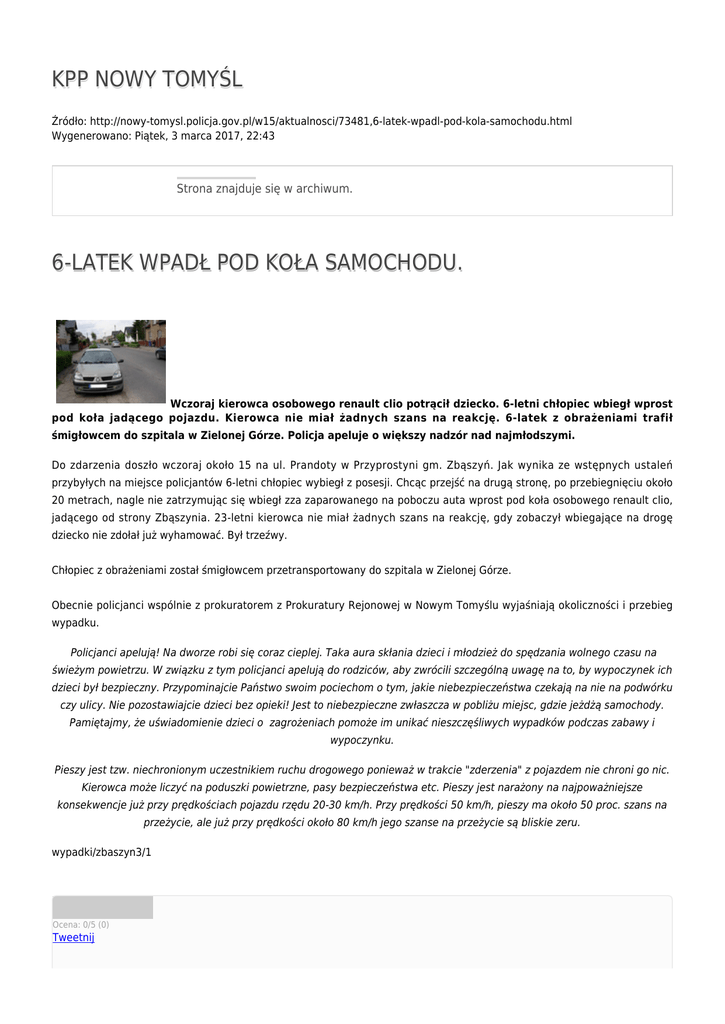 KPP NOWY TOMYŚL Źródło: http://nowy-tomysl.policja.gov.pl/w15/aktualnosci/73481,6-latek-wpadl-pod-kola-samochodu.html Wygenerowano: Piątek, 3 marca 2017, 22:43 Strona znajduje się w archiwum. 6-LATEK WPADŁ POD KOŁA SAMOCHODU. Wczoraj kierowca osobowego renault clio potrącił dziecko. 6-letni chłopiec wbiegł wprost pod koła jadącego pojazdu. Kierowca nie miał żadnych szans na reakcję. 6-latek z obrażeniami trafił śmigłowcem do szpitala w Zielonej Górze. Policja apeluje o większy nadzór nad najmłodszymi. Do zdarzenia doszło wczoraj około 15 na ul. Prandoty w Przyprostyni gm. Zbąszyń. Jak wynika ze wstępnych ustaleń przybyłych na miejsce policjantów 6-letni chłopiec wybiegł z posesji. Chcąc przejść na drugą stronę, po przebiegnięciu około 20 metrach, nagle nie zatrzymując się wbiegł zza zaparowanego na poboczu auta wprost pod koła osobowego renault clio, jadącego od strony Zbąszynia. 23-letni kierowca nie miał żadnych szans na reakcję, gdy zobaczył wbiegające na drogę dziecko nie zdołał już wyhamować. Był trzeźwy. Chłopiec z obrażeniami został śmigłowcem przetransportowany do szpitala w Zielonej Górze. Obecnie policjanci wspólnie z prokuratorem z Prokuratury Rejonowej w Nowym Tomyślu wyjaśniają okoliczności i przebieg wypadku. Policjanci apelują! Na dworze robi się coraz cieplej. Taka aura skłania dzieci i młodzież do spędzania wolnego czasu na świeżym powietrzu. W związku z tym policjanci apelują do rodziców, aby zwrócili szczególną uwagę na to, by wypoczynek ich dzieci był bezpieczny. Przypominajcie Państwo swoim pociechom o tym, jakie niebezpieczeństwa czekają na nie na podwórku czy ulicy. Nie pozostawiajcie dzieci bez opieki! Jest to niebezpieczne zwłaszcza w pobliżu miejsc, gdzie jeżdżą samochody. Pamiętajmy, że uświadomienie dzieci o zagrożeniach pomoże im unikać nieszczęśliwych wypadków podczas zabawy i wypoczynku. Pieszy jest tzw. niechronionym uczestnikiem ruchu drogowego ponieważ w trakcie "zderzenia" z pojazdem nie chroni go nic. Kierowca może liczyć na poduszki powietrzne, pasy bezpieczeństwa etc. Pieszy jest narażony na najpoważniejsze konsekwencje już przy prędkościach pojazdu rzędu 20-30 km/h. Przy prędkości 50 km/h, pieszy ma około 50 proc. szans na przeżycie, ale już przy prędkości około 80 km/h jego szanse na przeżycie są bliskie zeru. wypadki/zbaszyn3/1 Ocena: 0/5 (0) Tweetnij