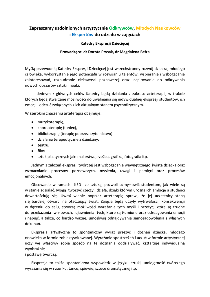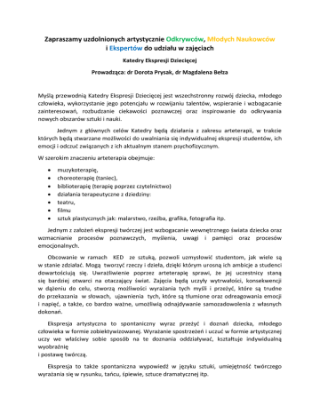 Zapraszamy uzdolnionych artystycznie Odkrywców, Młodych Naukowców i Ekspertów do udziału w zajęciach Katedry Ekspresji Dziecięcej Prowadząca: dr Dorota Prysak, dr Magdalena Bełza Myślą przewodnią Katedry Ekspresji Dziecięcej jest wszechstronny rozwój dziecka, młodego człowieka, wykorzystanie jego potencjału w rozwijaniu talentów, wspieranie i wzbogacanie zainteresowań, rozbudzanie ciekawości poznawczej oraz inspirowanie do odkrywania nowych obszarów sztuki i nauki. Jednym z głównych celów Katedry będą działania z zakresu arteterapii, w trakcie których będą stwarzane możliwości do uwalniania się indywidualnej ekspresji studentów, ich emocji i odczuć związanych z ich aktualnym stanem psychofizycznym. W szerokim znaczeniu arteterapia obejmuje: muzykoterapię, choreoterapię (taniec), biblioterapię (terapię poprzez czytelnictwo) działania terapeutyczne z dziedziny: teatru, filmu sztuk plastycznych jak: malarstwo, rzeźba, grafika, fotografia itp. Jednym z założeń ekspresji twórczej jest wzbogacanie wewnętrznego świata dziecka oraz wzmacnianie procesów poznawczych, myślenia, uwagi i pamięci oraz procesów emocjonalnych. Obcowanie w ramach KED ze sztuką, pozwoli uzmysłowić studentom, jak wiele są w stanie zdziałać. Mogą tworzyć rzeczy i dzieła, dzięki którym urosną ich ambicje a studenci dowartościują się. Uwrażliwienie poprzez arteterapię sprawi, że jej uczestnicy staną się bardziej otwarci na otaczający świat. Zajęcia będą uczyły wytrwałości, konsekwencji w dążeniu do celu, stworzą możliwości wyrażania tych myśli i przeżyć, które są trudne do przekazania w słowach, ujawnienia tych, które są tłumione oraz odreagowania emocji i napięć, a także, co bardzo ważne, umożliwią odnajdywanie samozadowolenia z własnych dokonań. Ekspresja artystyczna to spontaniczny wyraz przeżyć i doznań dziecka, młodego człowieka w formie zobiektywizowanej. Wyrażanie spostrzeżeń i uczuć w formie artystycznej uczy we właściwy sobie sposób na te doznania oddziaływać, kształtuje indywidualną wyobraźnię i postawę twórczą. Ekspresja to także spontaniczna wypowiedź w języku sztuki, umiejętność twórczego wyrażania się w rysunku, tańcu, śpiewie, sztuce dramatycznej itp. W czasie zajęć KED studenci będą mogli wyrażać swoje wewnętrzne autentyczne treści poprzez struktury estetycznie zorganizowane, które powstaną instynktownie. Założenia programowe: ekspresja ruchowo-mimiczna (gest, poza, spontaniczny ruch, taniec); ekspresja ruchowo-muzyczna (improwizowany taniec); ekspresja słowna (werbalna, modulacyjna i intonacyjna w wypowiedzi); ekspresja słowno-muzyczna (spontaniczne nucenie melodii i tekstów piosenek); ekspresja muzyczna (improwizowana gra na instrumentach); ekspresja plastyczna (samorzutne rysowanie, malowanie, lepienie, rzeźbienie); ekspresja zabawowa (synteza powyższych form ekspresji). Maksymalna ilość miejsc w grupie: 15 (Odkrywcy: 7, Młodzi Naukowcy: 5, Eksperci: 3) Zajęcia KED przewidziane są w terminach: 29 listopada 2014 13 grudnia 2014 10 stycznia 2015 24 stycznia 2015 Czas trwania zajęć wynosi 90 min, początek zajęć o godz. 15.00. Semestralny koszt udziału w zajęciach wynosi 100 zł. Opłatę prosimy przelać na rachunek Uniwersytetu Śląskiego Dzieci nr 64 1050 1214 1000 0023 4388 1542. Prosimy o umieszczenie w tytule przelewu dopisku zawierającego Imię i Nazwisko dziecka, nazwę programu (odpowiednio "Poszukiwacze", "Odkrywcy", "Naukowcy" lub "Eksperci"), a także dopisku "Grupa Twórcza - KED". Przykładowo: "Jan Kowalski, Odkrywcy, Grupa Twórcza - KED". Logowanie do grupy rozpocznie się w dniu 13 listopada 2014 o godzinie 20.00. Opłatę prosimy przelać na konto Uniwersytetu Śląskiego Dzieci do 22 listopada 2014. Dowody wpłaty prosimy przesłać e-mailem na adres UŚD.
