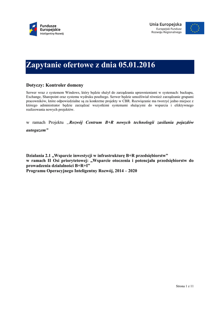 Zapytanie ofertowe z dnia 05.01.2016 Dotyczy: Kontroler domeny Serwer wraz z systemem Windows, który będzie służył do zarządzania uprawnieniami w systemach: backupu, Exchange, Sharepoint oraz systemu wydruku poufnego. Serwer będzie umożliwiał również zarządzanie grupami pracowników, które odpowiedzialne są za konkretne projekty w CBR. Rozwiązanie ma tworzyć jedno miejsce z którego administrator będzie zarządzać wszystkimi systemami służącymi do wsparcia i efektywnego realizowania nowych projektów. w ramach Projektu „Rozwój Centrum B+R nowych technologii zasilania pojazdów autogazem” Działania 2.1 „Wsparcie inwestycji w infrastrukturę B+R przedsiębiorstw” w ramach II Osi priorytetowej: „Wsparcie otoczenia i potencjału przedsiębiorstw do prowadzenia działalności B+R+I” Programu Operacyjnego Inteligentny Rozwój, 2014 – 2020 Strona 1 z 11 1. OPIS PRZEDMIOTU ZAMÓWIENIA Minimalne wymagania na sprzęt i licencje: Serwer – 1 szt Specyfikacja Obudowa Płyta główna Chipset Opis Obudowa Rack o wysokości max 1U z możliwością instalacji do 4 dysków 3.5" HotPlug wraz z kompletem wysuwanych szyn umożliwiających montaż w szafie rack i wysuwanie serwera do celów serwisowych oraz organizatorem kabli Posiadająca dodatkowy przedni panel zamykany na klucz, chroniący dyski twarde przed nieuprawnionym wyjęciem z serwera. Płyta główna z możliwością zainstalowania minimum dwóch procesorów cztero, sześcio lub ośmiordzeniowych. Płyta główna musi być zaprojektowana przez producenta serwera i oznaczona jego znakiem firmowym. Dedykowany przez producenta procesora do pracy w serwerach dwuprocesorowych Dwa procesory ośmiordzeniowe klasy x86 dedykowane do pracy z zaoferowanym serwerem umożliwiające osiągnięcie wyniku Procesor Chipset Pamięć RAM Sloty PCI Express Karta graficzna Wbudowane porty Interfejsy sieciowe Napęd optyczny Wewnętrzny moduł SD Kontroler dysków Dyski twarde System Operacyjny System diagnostyczny Zasilacze Wentylatory Bezpieczeństwo min. 663 punktów w teście SPECint_rate_base2006 dostępnym na stronie www.spec.org w konfiguracji dla 2 dwóch procesorów. Dedykowany przez producenta procesora do pracy w serwerach dwuprocesorowych 64GB pamięci RAM RDIMM o częstotliwości pracy 2133MHz Płyta powinna obsługiwać do min. 384GB, na płycie głównej powinno znajdować się minimum 12 slotów przeznaczonych dla pamięci Możliwe zabezpieczenia pamięci: Memory Rank Sparing, Memory Mirror, Lockstep Min. Dwa sloty PCIe Gen 3 Zintegrowana karta graficzna umożliwiająca rozdzielczość min. 1280x1024 min. 5 portów USB z czego min 2 porty 3.0 , 2 porty RJ45, 2 porty VGA (1 na przednim panelu obudowy, drugi na tylnym), min. 1 port RS232 Wbudowana czteroportowa karta Gigabit Ethernet . Dodatkowo zainstalowana karta w złącza PCI-E która posiada dwa interfejsy sieciowe 10Gb Ethernet ze złączami w standardzie SFP+. Wbudowany DVD-RW Możliwość instalacji wewnętrznego modułu z redundantnymi kartami SD. Możliwość skonfigurowania mirroru pomiędzy redundantnymi kartami SD. Jeden sprzętowy kontrolery dyskowe, posiadające min. 1GB nieulotnej pamięci cache , możliwe konfiguracje poziomów RAID : 0, 1, 5, 6, 10, 50, 60. Możliwość instalacji dysków twardych SATA, SAS, NearLine SAS i SSD. Zainstalowanych 2 dyski twarde o pojemności min. 300GB SAS 12Gb/s 15k RPM Zainstalowany Windows Server 2012R2 Standard, dostarczyć również nośnik z systemem operacyjnym Windows Server 2012R2 Standard. Panel LCD umieszczony na froncie obudowy, umożliwiający wyświetlenie informacji o stanie procesora, pamięci, dysków, BIOS’u, zasilaniu oraz temperaturze. Dwa redundantne zasilacze hot plug o mocy maks. 550W każdy Minimum 6 redundantnych wentylatorów Zintegrowany z płytą główną moduł TPM. Wbudowany czujnik otwarcia obudowy współpracujący z BIOS i kartą zarządzającą. Strona 2 z 11 Karta zarządzająca Gwarancja Niezależna od zainstalowanego systemu operacyjnego, zintegrowana z płytą główną posiadająca port RJ45 lub jako dodatkowa karta rozszerzeń (Zamawiający dopuszcza zastosowanie karty instalowanej w slocie PCI Express jednak nie może ona powodować zmniejszenia minimalnej ilości wymaganych slotów w serwerze), posiadająca minimalną funkcjonalność : - komunikacja poprzez dedykowany interfejs RJ45 - podstawowe zarządzanie serwerem poprzez protokół IPMI 2.0, SNMP, VLAN tagging - wbudowana diagnostyka - wbudowane narzędzia do instalacji systemów operacyjnych - dostęp poprzez interfejs graficzny Web karty oraz z linii poleceń - monitorowanie zasilania oraz zużycia energii przez serwer w czasie rzeczywistym z możliwością graficznej prezentacji - lokalna oraz zdalna konfiguracja serwera - zdalna instalacja systemów operacyjnych - wsparcie dla IPv4 i IPv6 - zapis zrzutu ekranu z ostatniej awarii - integracja z Active Directory - wirtualna konsola z dostępem do myszy i klawiatury - udostępnianie wirtualnej konsoli - autentykacja poprzez publiczny klucz (dla SSH) - możliwość obsługi poprzez dwóch administratorów równocześnie - wysyłanie do administratora powiadomienia o awarii lub zmianie konfiguracji sprzętowej Dodatkowe oprogramowanie umożliwiające zarządzanie poprzez sieć, spełniające minimalne wymagania: - Wsparcie dla serwerów, urządzeń sieciowych oraz pamięci masowych - Możliwość zarządzania dostarczonymi serwerami bez udziału dedykowanego agenta - Wsparcie dla protokołów– WMI, SNMP, IPMI, WSMan, Linux SSH - Możliwość oskryptowywania procesu wykrywania urządzeń - Możliwość uruchamiania procesu wykrywania urządzeń w oparciu o harmonogram - Szczegółowy opis wykrytych systemów oraz ich komponentów - Możliwość eksportu raportu do CSV, HTML, XLS - Grupowanie urządzeń w oparciu o kryteria użytkownika - Możliwość uruchamiania narzędzi zarządzających w poszczególnych urządzeniach - Automatyczne skrypty CLI umożliwiające dodawa
