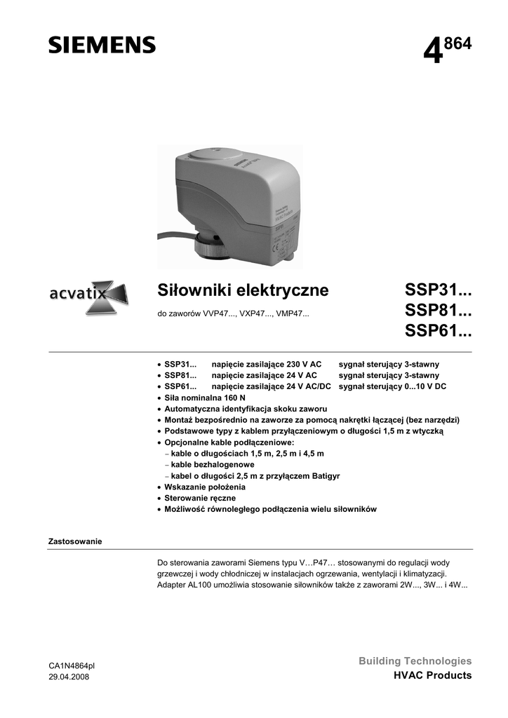 4 864 Siłowniki elektryczne do zaworów VVP47..., VXP47..., VMP47... SSP31... SSP81... SSP61... • • • • • • • • SSP31... napięcie zasilające 230 V AC sygnał sterujący 3-stawny SSP81... napięcie zasilające 24 V AC sygnał sterujący 3-stawny SSP61... napięcie zasilające 24 V AC/DC sygnał sterujący 0...10 V DC Siła nominalna 160 N Automatyczna identyfikacja skoku zaworu Montaż bezpośrednio na zaworze za pomocą nakrętki łączącej (bez narzędzi) Podstawowe typy z kablem przyłączeniowym o długości 1,5 m z wtyczką Opcjonalne kable podłączeniowe: − kable o długościach 1,5 m, 2,5 m i 4,5 m − kable bezhalogenowe − kabel o długości 2,5 m z przyłączem Batigyr • Wskazanie położenia • Sterowanie ręczne • Możliwość równoległego podłączenia wielu siłowników Zastosowanie Do sterowania zaworami Siemens typu V…P47… stosowanymi do regulacji wody grzewczej i wody chłodniczej w instalacjach ogrzewania, wentylacji i klimatyzacji. Adapter AL100 umożliwia stosowanie siłowników także z zaworami 2W..., 3W... i 4W... CA1N4864pl 29.04.2008 Building Technologies HVAC Products Zestawienie typów Oznaczenie typu SSP31 SSP31/00 1) Napięcie zasilające Czas przebiegu przy 50 Hz Sygnał sterujący 1,5 m 230 V AC bez kabla 150 s SSP81 1,5 m 43 s SSP81.04/00 1) bez kabla SSP61 24 V AC/DC 1,5 m 0...10 V DC 34 s bez kabla 0...10 V DC 2) SSP61P 2) bez kabla 24 V AC SSP81.04 1) 1,5 m 3-stawny SSP81/00 1) SSP61/00 1) Kabel podłączeniowy 1,5 m Dostępne różne długośc kabli przyłączeniowych i wtyki z zaciskami podłączeniowymi (patrz «Wyposażenie dodatkowe», strona 3) Aktywny zakres skoku 5...7,5 V DC (0...100 % skoku), zamiennik AM1S… Siłowniki SSP81… i SSP61… posiadają zatwierdzenie UL i cUL Wyposażenie dodatkowe Zamawianie Oznaczenie typu Opis ASY3L15 Kabel przyłączeniowy 1,5 m ASY3L25 Kabel przyłączeniowy 2,5 m ASY3L45 Kabel przyłączeniowy 4,5 m ASY8L15 Kabel przyłączeniowy 1,5 m ASY8L25 Kabel przyłączeniowy 2,5 m ASY8L25B Kabel przyłączeniowy 2,5 m z wtykiem do Batigyr Napięcie zasilające Sygnał sterujący 230 V AC 3-stawny 24 V AC ASY8L45 Kabel przyłączeniowy 4,5 m ASY8L45HF Kabel przyłączeniowy 4,5 m bezhalogenowy, VDE 0207-24 ASY6L15 Kabel przyłączeniowy 1,5 m ASY6L25 Kabel przyłączeniowy 2,5 m ASY6L45 Kabel przyłączeniowy 4,5 m ASY6L45HF Kabel przyłączeniowy 4,5 m bezhalogenowy, VDE 0207-24 ASY98 Śruba mocująca zabezpieczająca wtyczkę kabla podłączeniowego ASY99 Wtyk z zaciskami podłączeniowymi do siłowników 3-stawnych SSP81.../00 24 V AC/DC 0...10 V DC ASY100 Wtyk z zaciskami podłączeniowymi do siłowników 0…10 V DC SSP61/00 AL100 Adapter do zaworów 2W..., 3W... i 4W... Przy zamawianiu należy podać ilość, nazwę i oznaczenie typu urządzenia. Przykład: Dostawa 2 siłowniki SSP81/00 bez kabla 2 wtyki z zaciskami podłączeniowymi ASY99 Zawory, siłowniki i wyposażenie dodatkowe pakowane są oddzielnie i dostarczane w oddzielnych opakowaniach. Urządzenia współpracujące Oznaczenie typu Rodzaj zaworu Montaż bezpośredni Montaż z adapterem AL100 (renowacja) kvs [m3/h] VVP47... Zawory 2-drogowe VXP47... Zawory 3-drogowe VMP47... Zawory 3-drogowe z obejściem 0,25...2,5 2W...K... Zawory 2-drogowe 0,6...2,5 3W... Zawory 3-drogowe 0,6...4,0 4W... Zawory 3-drogowe z obejściem 0,6...2,5 Ciśnienie nominalne 0,25...4,0 Karta katalogowa N4847 PN16 N4846 kvs = Nominalne natężenie przepływu zimnej wody (5...30 °C) przez całkowicie otwarty zawór (H100) przy spadku ciśnienia 100 kPa (1 bar) 2/8 Building Technologies HVAC Products Siłowniki elektryczne CA1N4864pl 29.04.2008 F Przyłącze M30 x 1,5 do podłączenia siłownika Siła nominalna F ≤ 160 N Wymiar x (zawór otwarty) x > 9,0 mm Wymiar y (zawór zamknięty) y ≤ 14,5 mm M30 x1,5 AB A 4864Z01 • • • • y Aby zapewnić prawidłową współpracę siłowników SSP... z zaworami innych producentów, zawory te muszą spełniać następujące wymagania: x Zawory innych producentów Działanie i budowa Gdy siłownik sterowany jest sygnałem 0...10 V DC lub 3-stawnym, to wytwarza on skok, który przenoszony jest na trzpień zaworu. Przedstawiony poniżej opis działania dotyczy zaworów, które w stanie bez zasilania są całkowicie zamknięte (zawory N.Z.). Sterowanie 3-stawne SSP31... / SSP81... • Napięcie na Y1: • Napięcie na Y2: • Brak napięcia na Y1 i Y2: Sterowanie 0...10 V DC SSP61... • Zawór jest otwierany i zamykany proporcjonalnie do sygnału sterującego Y • Przy 0 V zawór V…P47… jest całkowicie zamknięty (A → AB) • Przy braku zasilania siłownik pozostaje w swojej bieżącej pozycji Właściwości i korzyści • • • • • • • Trzpień siłownika wysuwa się Otwieranie zaworu Trzpień siłownika chowa się Zamykanie zaworu Siłownik pozostaje w swojej bieżącej pozycji 4893Z16 Obudowa z tworzywa sztucznego Wskazanie położenia Bezobsługowa przekładnia zabezpieczona przed zblokowaniem Sterowanie ręczne przy pomocy klucza imbusowego 3 mm Zmniejszony pobór mocy w stanie utrzymywania pozycji Wyłącznik przeciążeniowy i dla pozycji krańcowych Możliwość równoległej pracy 6 siłowników SSP31..., 24 SSP81... lub 10 SSP61..., pod warunkiem wystarczającej obciążalności wyjścia regulatora • Dostępne wtyki z zaciskami podłączeniowymi umożliwiające podłączenie standardowych przewodów (tylko do siłowników 24 V AC i 24 V AC/DC) • Brak możliwości pomylenia kabli podłączeniowych z wtyczkami 24 V AC i 230 V AC • Dostępne kable bezhalogenowe Wyposażenie dodatkowe Śruba mocująca ASY98 Śruba ASY98 przeznaczona do zabezpieczenia wtyczki kabla 4864Z02 b Wtyczka mocowana jest zatrzaskowo, ale można ją dodatkowo zabezpieczyć śrubą mocującą d 4864Z03 c 3/8 Building Technologies HVAC Products Siłowniki elektryczne CA1N4864pl 29.04.2008 4864Z04 Wtyki z zaciskami podłączeniowymi ASY99 ASY100 Do specjalnych długości kabli do siłowników 24 V