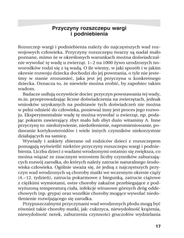 Przyczyny rozszczepu wargi i podniebienia Rozszczep wargi i podniebienia nale˝y do najcz´stszych wad rozwojowych cz∏owieka. Przyczyny rozszczepu twarzy sà nadal ma∏o poznane, mimo ˝e w okreÊlonych warunkach mo˝na doÊwiadczalnie wywo∏aç t´ wad´ u zwierzàt. 1– 2 na 1000 ˝ywo urodzonych noworodków rodzi si´ z tà wadà. O ile wiemy, w jaki sposób i w jakim okresie rozwoju dziecka dochodzi do jej powstania, o tyle nie jesteÊmy w stanie zrozumieç, jaka jest jej przyczyna u konkretnego dziecka. Oznacza to, ˝e niewiele mo˝na zrobiç, by zapobiec takim wadom. Badacze usi∏ujà oczywiÊcie dociec przyczyn powstawania tej wady, m.in. przeprowadzajàc liczne doÊwiadczenia na zwierz´tach, jednak wniosków uzyskanych na podstawie tych doÊwiadczeƒ nie mo˝na w pe∏ni odnieÊç do cz∏owieka, poniewa˝ inny jest proces jego rozwoju. Eksperymentalnie wad´ t´ mo˝na wywo∏aç u zwierzàt, np. podajàc pokarm zawierajàcy zbyt ma∏o lub zbyt du˝o witaminy A. Inne przyczyny to: niedo˝ywienie, niedotlenienie, napromieniowanie, podawanie kortykosteroidów i wiele innych czynników niekorzystnie dzia∏ajàcych na samic´. Wywiady i ankiety zbierane od rodziców dzieci z rozszczepem pomagajà wyÊwietliç niektóre przyczyny rozszczepu wargi i podniebienia. Liczba dzieci z wadami wrodzonymi ostatnio si´ zwi´ksza, co mo˝na wiàzaç ze znacznym wzrostem liczby czynników zaburzajàcych rozwój zarodka, do których nale˝y zatrucie naturalnego Êrodowiska cz∏owieka. Ogólnie uwa˝a si´, ˝e jednà z najcz´stszych przyczyn wad wrodzonych sà choroby matki we wczesnym okresie cià˝y (4.–12. tydzieƒ), zatrucia pokarmowe z biegunkà, zatrucie cià˝owe z ci´˝kimi wymiotami, ostre choroby zakaêne przebiegajàce z podwy˝szonà temperaturà cia∏a, infekcje wirusowe górnych dróg oddechowych (np. grypa) oraz wszelkie choroby mogàce wywo∏aç niedotlenienie rozwijajàcego si´ zarodka. Przypuszczalnymi przyczynami wad wrodzonych p∏odu mogà byç równie˝ takie choroby matki, jak: cukrzyca, niewydolnoÊç krà˝enia, niewydolnoÊç nerek, zaburzenia czynnoÊci gruczo∏ów wydzielania 17 wewn´trznego oraz zabiegi operacyjne, stresy i urazy we wczesnym okresie cià˝y. Szkodliwe dzia∏anie leków na zarodek i p∏ód jest tematem wielu prac naukowych. Stwierdzono, ˝e niektóre leki przyjmowane w du˝ych iloÊciach przez matk´ w poczàtkach cià˝y mogà spowodowaç wady wrodzone u dziecka. Uwa˝a si´ te˝, ˝e pewne leki przyjmowane przez d∏u˝szy czas przez matk´ przed cià˝à mogà niekorzystnie wp∏ywaç na Êrodowisko wewnàtrzmaciczne i na komórk´ jajowà. Jednym z czynników bardzo szkodliwych dla zarodka jest energia promienista (promienie Roentgena, wszelkie promieniowanie jonizujàce), zatrucia chemiczne oraz niedobory niektórych witamin. Dawniej ca∏à odpowiedzialnoÊcià za powstawanie wad wrodzonych obarczano komórk´ jajowà. W miar´ rozwoju badaƒ nad budowà plemników okaza∏o si´, ˝e niekorzystne czynniki dzia∏ajàce na ojca w równej mierze jak czynniki dzia∏ajàce na matk´ mogà prowadziç do powstawania wad wrodzonych u potomstwa. Energia promienista, d∏ugotrwa∏e zatrucia chemiczne (rt´ç, o∏ów, alkohol etylowy, nikotyna), ultradêwi´ki i inne czynniki mogà wywo∏ywaç zaburzenia w budowie bia∏ka plemnika przed jego po∏àczeniem si´ z komórkà jajowà i w wyniku zap∏odnienia jaja takim plemnikiem mogà powstawaç wady wrodzone u potomstwa. Prawdopodobnie kilka takich czynników mo˝e wspó∏dzia∏aç ze sobà i doprowadziç do zaburzeƒ w rozwoju zarodka. Wymienione czynniki, tzw. Ê r o d o w i s k o w e — (czyli zewnàtrzpochodne), do których zalicza si´ czynniki infekcyjne, zjawiska chemiczne, leki, czynniki fizyczne, metabolizm matki, mogà wywo∏ywaç wady wrodzone u dzieci w ró˝nych narzàdach i uk∏adach, m.in. rozszczepy wargi i podniebienia. Czynniki g e n e t y c z n e (czyli wewnàtrzpochodne) mogà równie˝ powodowaç powstawanie rozszczepów. Jedne z najdok∏adniejszych badaƒ nad wp∏ywem dziedzicznoÊci na powstawanie rozszczepu prowadzone by∏y w Danii, w ma∏ym kraju, w którym mo˝na by∏o przeÊledziç wiele rodzin przez kilka pokoleƒ. Badania wykaza∏y, ˝e 27% dzieci z rozszczepem wargi, 41% dzieci z rozszczepem wargi i podniebienia i 19% dzieci z rozszczepem samego podniebienia nie by∏o pierwszymi dzieçmi z tà wadà w rodzinie. Stwierdzono równie˝, ˝e dziedziczne t∏o rozszczepu wyst´puje w 20–30% przypadków. Nie wiadomo jednak, w jaki sposób dziedziczy si´ cech´ 18 rozszczepu. Prawdopodobnie cecha ta ujawnia si´ wtedy, gdy odziedziczona jest sk∏onnoÊç, a szkodliwe czynniki z zewnàtrz dzia∏ajà na rozwijajàcy si´ zarodek. Oko∏o 70% dzieci z rozszczepem wargi lub wargi i podniebienia albo samego podniebienia by∏o pierwszymi dzieçmi z tà wadà w rodzinie, w której dotàd rozszczep nie wyst´powa∏.