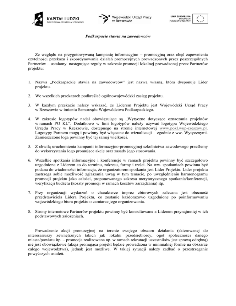 Podkarpacie stawia na zawodowców Ze względu na przygotowywaną kampanię informacyjno – promocyjną oraz chęć zapewnienia czytelności przekazu i skoordynowania działań promocyjnych prowadzonych przez poszczególnych Partnerów – ustalamy następujące reguły w zakresie promocji lokalnej prowadzonej przez Partnerów projektu: 1. Nazwa „Podkarpackie stawia na zawodowców” jest nazwą własną, która dysponuje Lider projektu. 2. We wszelkich przekazach podkreślać ogólnowojewódzki zasięg projektu. 3. W każdym przekazie należy wskazać, że Liderem Projektu jest Wojewódzki Urząd Pracy w Rzeszowie w imieniu Samorządu Województwa Podkarpackiego. 4. W zakresie logotypów nadal obowiązujące są „Wytyczne dotyczące oznaczania projektów w ramach PO KL”. Dodatkowo w linii logotypów należy używać logotypu Wojewódzkiego Urzędu Pracy w Rzeszowie, dostępnego na stronie internetowej www.pokl.wup-rzeszow.pl. Logotypy Partnera mogą i powinny być włączane do wizualizacji – zgodnie z ww. Wytycznymi. Zamieszczone loga powinny być tej samej wielkości. 5. Z chwilą uruchomienia kampanii informacyjno-promocyjnej szkolnictwa zawodowego prześlemy do wykorzystania logo promujące akcję oraz zasady jego stosowania. 6. Wszelkie spotkania informacyjne i konferencje w ramach projektu powinny być szczegółowo uzgodnione z Liderem co do terminu, zakresu, formy i treści. Na ww. spotkaniach powinna być podana do wiadomości informacja, że organizatorem spotkania jest Lider Projektu. Lider projektu zastrzega sobie możliwość zgłaszania uwag w tym temacie, po uwzględnieniu harmonogramu promocji projektu jako całości, proponowanego zakresu merytorycznego spotkania/konferencji, weryfikacji budżetu (koszty promocji w ramach kosztów zarządzania) itp. 7. Przy organizacji wydarzeń o charakterze imprez zbiorowych zalecana jest obecność przedstawiciela Lidera Projektu, co zostanie każdorazowo uzgodnione po poinformowaniu wojewódzkiego biura projektu o zamiarze jego organizowania. 8. Strony internetowe Partnerów projektu powinny być konsultowane z Liderem przynajmniej w ich podstawowych założeniach. Prowadzenie akcji promocyjnej na terenie swojego obszaru działania (skierowanej do interesariuszy zewnętrznych takich jak lokalni przedsiębiorcy, ogół społeczności danego miasta/powiatu itp. – promocja realizowana np. w ramach rekrutacji uczestników jest sprawą odrębną) nie jest obowiązkowe (akcja promująca projekt będzie prowadzona w minimalnej formie na obszarze całego województwa), jednak jest możliwe. W takiej sytuacji należy zadbać o przestrzeganie powyższych ustaleń.