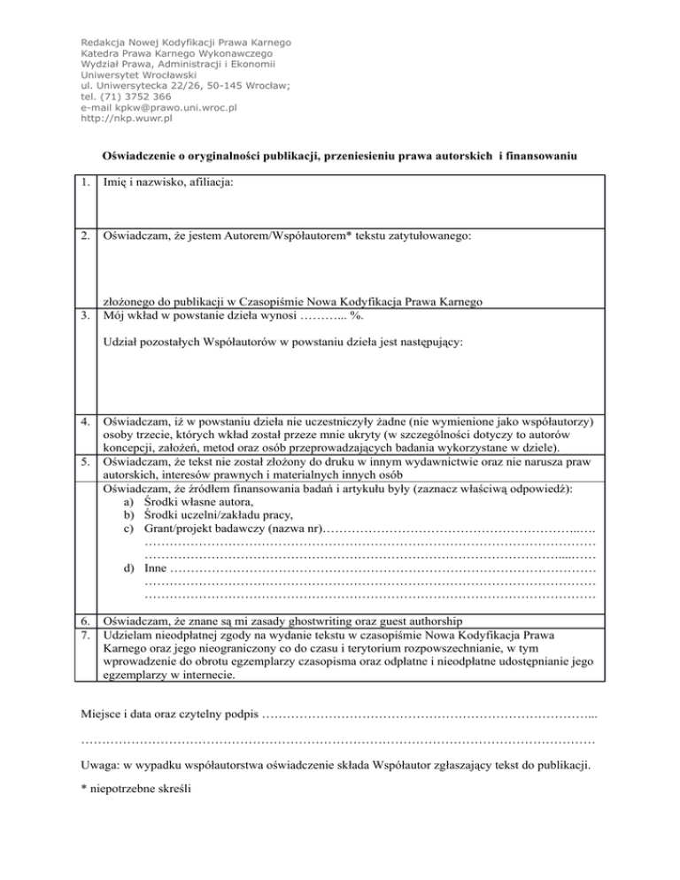 Redakcja Nowej Kodyfikacji Prawa Karnego Katedra Prawa Karnego Wykonawczego Wydział Prawa, Administracji i Ekonomii Uniwersytet Wrocławski ul. Uniwersytecka 22/26, 50-145 Wrocław; tel. (71) 3752 366 e-mail [email protected] http://nkp.wuwr.pl Oświadczenie o oryginalności publikacji, przeniesieniu prawa autorskich i finansowaniu 1. Imię i nazwisko, afiliacja: 2. Oświadczam, że jestem Autorem/Współautorem* tekstu zatytułowanego: 3. złożonego do publikacji w Czasopiśmie Nowa Kodyfikacja Prawa Karnego Mój wkład w powstanie dzieła wynosi ………... %. Udział pozostałych Współautorów w powstaniu dzieła jest następujący: 4. 5. 6. 7. Oświadczam, iż w powstaniu dzieła nie uczestniczyły żadne (nie wymienione jako współautorzy) osoby trzecie, których wkład został przeze mnie ukryty (w szczególności dotyczy to autorów koncepcji, założeń, metod oraz osób przeprowadzających badania wykorzystane w dziele). Oświadczam, że tekst nie został złożony do druku w innym wydawnictwie oraz nie narusza praw autorskich, interesów prawnych i materialnych innych osób Oświadczam, że źródłem finansowania badań i artykułu były (zaznacz właściwą odpowiedź): a) Środki własne autora, b) Środki uczelni/zakładu pracy, c) Grant/projekt badawczy (nazwa nr)……………………………………………………..…. ……………………………………………………………………………………………… ………………………………………………………………………………………....…… d) Inne ………………………………………………………………………………………… ……………………………………………………………………………………………… ……………………………………………………………………………………………… Oświadczam, że znane są mi zasady ghostwriting oraz guest authorship Udzielam nieodpłatnej zgody na wydanie tekstu w czasopiśmie Nowa Kodyfikacja Prawa Karnego oraz jego nieograniczony co do czasu i terytorium rozpowszechnianie, w tym wprowadzenie do obrotu egzemplarzy czasopisma oraz odpłatne i nieodpłatne udostępnianie jego egzemplarzy w internecie. Miejsce i data oraz czytelny podpis ……………………………………………………………………... …………………………………………………………………………………………………………… Uwaga: w wypadku współautorstwa oświadczenie składa Współautor zgłaszający tekst do publikacji. * niepotrzebne skreśli