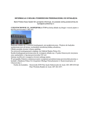INFORMACJA O WOLNEJ POWIERZCHNI PRZEZNACZONEJ DO WYNAJĘCIA Bank Polska Kasa Opieki SA uprzejmie informuje, że posiada wolną powierzchnię do wynajęcia położoną w : CZĘSTOCHOWIE UL. KOPERNIKA 17/19 na którą składa się drugie i trzecie piętro o łącznej powierzchni 1.082 m2. Budynek składa się z czterech kondygnacji, jest podpiwniczony. Wejście do budynku usytuowane jest od strony wschodniej niezależną klatką schodową. Obiekt posiada również własny parking. Na niższych kondygnacjach znajduje się Oddział Banku Pekao SA. Każda kondygnacja przeznaczona do wynajęcia składa się z 9 pokoi biurowych, korytarza oraz sanitariatów o łącznej powierzchni 541 m2. Istnieje możliwość wynajęcia również jednego piętra. W przypadku Państwa zainteresowania wynajmem przedstawionej powierzchni prosimy o kontakt z Bankiem Pekao SA Zespołem Obsługi Nieruchomości w Katowicach przy ul. Chorzowska 1. Osoby do kontaktu : Kierownik ZON Pan Jacek Stokowacki tel. kont. 601-409-454 lub Pani Wioletta Rudek tel. kont. 607-461-857.