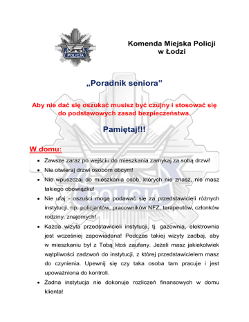Komenda Miejska Policji w Łodzi „Poradnik seniora” Aby nie dać się oszukać musisz być czujny i stosować się do podstawowych zasad bezpieczeństwa. Pamiętaj!!! W domu: Zawsze zaraz po wejściu do mieszkania zamykaj za sobą drzwi! Nie otwieraj drzwi osobom obcym! Nie wpuszczaj do mieszkania osób, których nie znasz, nie masz takiego obowiązku! Nie ufaj - oszuści mogą podawać się za przedstawicieli różnych instytucji, np. policjantów, pracowników NFZ, terapeutów, członków rodziny, znajomych! Każda wizyta przedstawicieli instytucji, tj. gazownia, elektrownia jest wcześniej zapowiadana! Podczas takiej wizyty zadbaj, aby w mieszkaniu był z Tobą ktoś zaufany. Jeżeli masz jakiekolwiek wątpliwości zadzwoń do instytucji, z której przedstawicielem masz do czynienia. Upewnij się czy taka osoba tam pracuje i jest upoważniona do kontroli. Żadna instytucja nie dokonuje rozliczeń finansowych w domu klienta! Nie wpłacaj należności, ani nie przyjmuj rzekomej nadpłaty od „inkasentów”! Nie kupuj artykułów za „podejrzanie” niską cenę, im większa OKAZJA, tym większe prawdopodobieństwo OSZUSTWA! Nie podpisuj dokumentów bez uprzedniego zapoznania się z jego treścią! Wszelką dokumentację czytaj ze zrozumieniem, w razie wątpliwości skonsultuj jej treść z osobą zaufaną. Nie ufaj osobom podających się za krewnych, nie zgaduj kto do ciebie dzwoni! Rozmówca ma obowiązek się przedstawić. Nie podawaj swoich danych osobowych prze telefon i Internet! Nikomu nie udostępniaj swojego dokumentu tożsamości! Nie informuj w jakich bankach i na jakich lokatach gromadzisz oszczędności! Podczas transakcji pieniężnych: Staraj się zapamiętać numer PIN do swojej karty bankomatowej! Nigdy nie zapisuj go bezpośrednio na karcie bankomatowej, pod żadnym pozorem nie przechowuj go razem z kartą, ani w żadnym innym widocznym miejscu! Nikomu nie udostępniaj swojej karty bankomatowej! Chcąc wypłacić większą ilość gotówki z banku lub bankomatu poproś zaufaną osobę, aby ci towarzyszyła! Podczas transakcji skorzystaj z pomieszczenia przeznaczonego do wypłat indywidualnych, w którym w sposób niewidoczny dla innych będziesz mógł przeliczyć pieniądze i schować je w bezpiecznym miejscu! Po wypłaceniu większej ilości gotówki udaj się bezpośrednio do miejsca zamieszkania! Poza domem: Nie przechowuj kluczy do mieszkania razem z dokumentami, w których podany jest Twój adres zamieszkania! W przypadku utraty kluczy od mieszkania niezwłocznie zmień zamki w drzwiach! Unikaj miejsc odosobnionych, słabo oświetlonych! W dużych skupiskach ludzi uważaj na „sztuczny tłok”! To sprzyja kradzieżom. Nigdy nie zostawiaj podręcznego bagażu bez nadzoru! Podręczną torbę noś zawsze trzymając ją z przodu, aby mieć większy nadzór nad swoją własnością! Pamiętaj, że torbę trzymaną w ręku łatwo wyrwać. Udając się na zakupy nie zabieraj ze sobą zbyt wiele pieniędzy, zabierz tylko tyle ile potrzebujesz! W razie potrzeby gotówkę podziel na mniejsze kwoty, którą przechowuj w różnych miejscach. Pamiętaj!!! Eksponowanie biżuterii, np. łańcuszków, kolczyków sprzyja kradzieżom! Bądź czujny! Nie ufaj! W razie potrzeby dzwoń pod nr tel. 997, 112