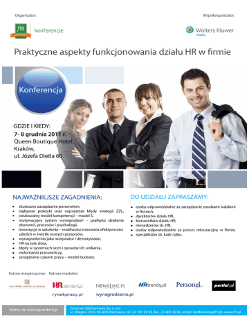 Organizator: 20 lecie Współorganizator: konferencje Praktyczne aspekty funkcjonowania działu HR w firmie Konferencja GDZIE I KIEDY: 7- 8 grudnia 2011 r. Queen Boutique Hotel, Kraków, ul. Józefa Dietla 60 NAJWAŻNIEJSZE ZAGADNIENIA: skuteczne zarządzanie personelem, najlepsze praktyki oraz najczęstsze błędy strategii ZZL, strukturalny model kompetencji – model S, motywacyjny system wynagrodzeń – praktyka działania ekonomii, procesów i psychologii, inwestycje w szkolenia – możliwości mierzenia efektywności szkoleń w świetle nowych przepisów, wynagrodzenia jako motywator i demotywator, HR na żyle złota, błędy w systemach ocen i sposoby ich unikania, wolontariat pracowniczy, zarządzanie czasem pracy – model budowy. DO UDZIAŁU ZAPRASZAMY: osoby odpowiedzialne za zarządzanie zasobami ludzkimi w firmach, dyrektorów działu HR, kierowników działu HR, menedżerów ds. HR, osoby odpowiedzialne za proces rekrutacyjny w firmie, specjalistów ds. kadr i płac. Patron merytoryczny: Patroni medialni: Adres do korespondencji: Centrum Szkoleniowe Sp. z. o.o. ul. Wiejska 20/3, 00-490 Warszawa, tel. 22 100 58 95, fax. 22 403 39 66, email: [email protected], www.frr.pl 20 lecie konferencje Praktyczne aspekty funkcjonowania działu HR w firmie Konferencja 7-8 grudnia, Queen Boutique Hotel ****, Kraków, ul. Józefa Dietla 60 Szanowni Państwo, Centrum Szkoleniowe Sp. z o. o. firma należąca do grupy Fundacji Rozwoju Rachunkowości w Polsce organizuje konferencję „Praktyczne aspekty funkcjonowania działu HR w firmie”. Konferencja odbędzie się w dniach 7-8 grudnia 2011 roku w Krakowie w hotelu Queen Boutique Hotel**** ul. Józefa Dietla 60 . Celem konferencji jest : Przedstawienie aspektów biznesowych procesów HR Zaprezentowanie metod skutecznego zarządzania personelem Omówienie modeli kompetencji i efektywnego wdrażania strategii Przedstawienie tematyki aspektów prawnych działań w dziale HR W trakcie konferencji będziecie mieli Państwo możliwość: Zdobycia wiedzy z zakresu biznesowych aspektów procesów HR Wymiany doświadczeń z innymi uczestnikami Zapoznania się z aspektami prawnymi funkcjonowania działu HR Kierowania pytań do ekspertów z branży HR Serdecznie zapraszam do uczestnictwa w konferencji wierząc, iż informacje przekazane przez ekspertów i możliwość wymiany doświadczeń przyczyni się do pogłębienia wiedzy i pozyskania nowych umiejętności z zakresu zarządzania zasobami ludzkimi. Konferencja będzie również okazją do zdobycia nowych kontaktów biznesowych. Adres do korespondencji: Z poważaniem, Emilia Nurzyńska Menedżer Projektu [email protected] Centrum Szkoleniowe Sp. z. o.o. ul. Wiejska 20/3, 00-490 Warszawa, tel. 22 100 58 95, fax. 22 403 39 66, email: [email protected], www.frr.pl konferencje 20 lecie Praktyczne aspekty funkcjonowania działu HR w firmie Konferencja 7-8 grudnia, Queen Boutique Hotel ****, Kraków, ul. Józefa Dietla 60 Program Konferencji Dzień I, 7 grudnia Konferencję poprowadzi Rafał Broniarek, Wolters Kluwer Efektywność biznesowa procesów HR 09:00 - 9:30 Rejestracja, powitalna kawa 09:30 - 9:45 Powitanie gości Rafał Broniarek, Redaktor naczelny miesięcznika Personel Plus 09:45-10:45 Koniec z generowaniem kosztów Wartość dodana generowana przez HR - slogan, czy prawda - panel dyskusyjny Rafał Broniarek, Redaktor naczelny miesięcznika, Personel Plus 10:45-11:30 Skuteczne zarządzanie personelem - realne zyski Roman Stolarski, Expert Czy można opracować, wdrożyć i skutecznie oraz elastycznie używać Motywacyjny System Wynagradzania, jako narzędzie zarządzania, spełniające oczekiwania? Jak zapewnić w systemach wynagradzania, stały rozwój motywacji i zaangażowania oraz oczekiwaną efektywność biznesu? 11:30-11:45 Przerwa kawowa 11:45-12:45 Rola kompetencji kulturowych w zdobywaniu przewagi konkurencyjnej w organizacjach zorientowanych rynkowo Izabela Markiewicz, Właściciel CCIQ Cross CulturalIntelligence Ostatnie lata zweryfikowały przyjętą prawdę, że duże organizacje międzynarodowe wygrywają z lokalnymi. Teraz to lokalne zdobywają klientów. Jaka jest rola ZZL w budowaniu przewagi konkurencyjnej w organizacjach zorientowanych rynkowo, a w szczególności zróżnicowanych kulturowo? Co to znaczy mieć kompetencje kulturowe i świadomie zarządzać różnorodnością? Na te pytania odpowiem podczas prelekcji, pokazując jednocześnie najczęstsze błędy oraz najlepsze praktyki strategii ZZL w tym zakresie. 12:45-13:15 Strukturalny Model Kopmetencji - Model S - Dualizm wskaźników behawioralnych i wpływ budowy kompetencji na jej funkcjonalność w systemach oceny i rozwoju pracowników Kinga Padzik, Współwłaściciel, ESSEY Doradztwo Personalne W modelu nacisk połozony jest na rozróżnienie realnej luki kompetencyjnej od efektu spowodowanego spadkiem motywacji, które to zjawiska mają analogiczne symptomy oraz w przypadku istnienia realnej luki określenie, z którego elementu kompetencji ona pochodzi. Model-S podkreśla, że sposób działania korygującego deficyt kompetencji jest zdeterminowany źródłem tego deficytu i jego charakterem, a nie zakresem obserwowanego wskaźnika. Pomijanie w analizie wyników oceny pracowników dwoistej natury wskaźników behawioralnych jest często przyczyną błędnego diagnozowania potrzeb rozwojowych, a w konsekwencji nieadekwatnego lokowania wydatków na zaspokojenie tych potrzeb. Adres do korespondencji: Centrum Szkoleniowe Sp. z. o.o. ul. Wiejska 20/3, 00-490 Warszawa, tel. 22 100 58 95, fax. 22 403 39 66, email: [email protected], www.frr.pl 20 lecie konferencje Praktyczne aspekty funkcjonowania działu HR w firmie Konferencja 13:15-14:00 7-8 grudnia, Queen Boutique Hotel ****, Kraków, ul. Józefa Dietla 60 Motywacyjny System Wynagrodzeń – praktyka działania ekonomi, procesów i psychologii Piotr Zagdański, Kierownik w Centrum Badań, DOOR Group 14:00-14:45 Lunch 14:45-15:30 Inwestycja w szkolenia - moż