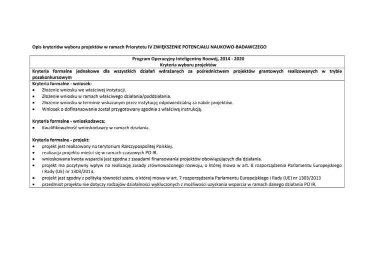 Kryteria oceny dla projektu pozakonkursowego w dz. 4.4. PO IR