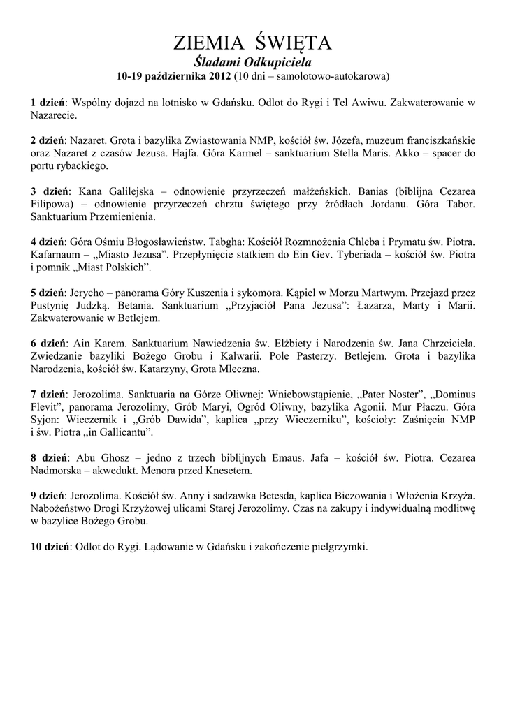 ZIEMIA ŚWIĘTA Śladami Odkupiciela 10-19 października 2012 (10 dni – samolotowo-autokarowa) 1 dzień: Wspólny dojazd na lotnisko w Gdańsku. Odlot do Rygi i Tel Awiwu. Zakwaterowanie w Nazarecie. 2 dzień: Nazaret. Grota i bazylika Zwiastowania NMP, kościół św. Józefa, muzeum franciszkańskie oraz Nazaret z czasów Jezusa. Hajfa. Góra Karmel – sanktuarium Stella Maris. Akko – spacer do portu rybackiego. 3 dzień: Kana Galilejska – odnowienie przyrzeczeń małżeńskich. Banias (biblijna Cezarea Filipowa) – odnowienie przyrzeczeń chrztu świętego przy źródłach Jordanu. Góra Tabor. Sanktuarium Przemienienia. 4 dzień: Góra Ośmiu Błogosławieństw. Tabgha: Kościół Rozmnożenia Chleba i Prymatu św. Piotra. Kafarnaum – „Miasto Jezusa”. Przepłynięcie statkiem do Ein Gev. Tyberiada – kościół św. Piotra i pomnik „Miast Polskich”. 5 dzień: Jerycho – panorama Góry Kuszenia i sykomora. Kąpiel w Morzu Martwym. Przejazd przez Pustynię Judzką. Betania. Sanktuarium „Przyjaciół Pana Jezusa”: Łazarza, Marty i Marii. Zakwaterowanie w Betlejem. 6 dzień: Ain Karem. Sanktuarium Nawiedzenia św. Elżbiety i Narodzenia św. Jana Chrzciciela. Zwiedzanie bazyliki Bożego Grobu i Kalwarii. Pole Pasterzy. Betlejem. Grota i bazylika Narodzenia, kościół św. Katarzyny, Grota Mleczna. 7 dzień: Jerozolima. Sanktuaria na Górze Oliwnej: Wniebowstąpienie, „Pater Noster”, „Dominus Flevit”, panorama Jerozolimy, Grób Maryi, Ogród Oliwny, bazylika Agonii. Mur Płaczu. Góra Syjon: Wieczernik i „Grób Dawida”, kaplica „przy Wieczerniku”, kościoły: Zaśnięcia NMP i św. Piotra „in Gallicantu”. 8 dzień: Abu Ghosz – jedno z trzech biblijnych Emaus. Jafa – kościół św. Piotra. Cezarea Nadmorska – akwedukt. Menora przed Knesetem. 9 dzień: Jerozolima. Kościół św. Anny i sadzawka Betesda, kaplica Biczowania i Włożenia Krzyża. Nabożeństwo Drogi Krzyżowej ulicami Starej Jerozolimy. Czas na zakupy i indywidualną modlitwę w bazylice Bożego Grobu. 10 dzień: Odlot do Rygi. Lądowanie w Gdańsku i zakończenie pielgrzymki. CENA PIELGRZYMKI około 2000 zł i 850 USD (dopłata dla chętnych za pokój jednoosobowy wynosi 320 USD) Osoby, które ukończyły 65 rok życia oraz przewlekle chore zobowiązane są do wykupienia dodatkowego ubezpieczenia, którego koszt wynosi 250 zł ORGANIZATORZY ZAPEWNIAJĄ przelot samolotem na trasie Gdańsk-Ryga-Tel Awiw i Tel Awiw-Ryga-Gdańsk pełne wyżywienie (śniadanie, obiad i kolacja) zakwaterowanie w hotelach (pokoje 2 lub 3 osobowe z łazienką) autokar do dyspozycji grupy, przewodnik po miejscach świętych wszystkie bilety wstępu, taksówka na Górę Tabor, statek po Jeziorze Galilejskim ubezpieczenie, przewodnik-śpiewnik, znak grupy, certyfikat pielgrzyma BLIŻSZE INFORMACJE i zapisy w zakrystii u ks. Adama Fulary. Kontakt: (59)842-31-86 e-mail: [email protected]