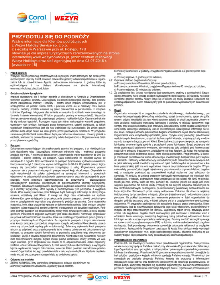 PRZYGOTUJ SIĘ DO PODRÓŻY Ważne informacje dla Klientów podróżujących z Wezyr Holiday Service sp. z o.o. z siedzibą w Warszawie przy ul. Postępu 17B obowiązują dla imprez turystycznych zarezerwowanych na stronie internetowej www.wezyrholidays.pl, przez centrum rezerwacji Wezyr Holidays oraz sieć agencyjną od dnia 03.07.2015 r. [wydanie nr 18] 1. Przed odlotem Wszyscy Klienci podróżują czarterowymi lub rejsowymi liniami lotniczymi. Na dzień przed rozpoczęciem Imprezy Klient powinien potwierdzić godziny odlotu bezpośrednio u Organizatora lub za pośrednictwem Agenta. Jednocześnie informujemy, iż godziny lotów są ogólnodostępne i na bieżąco aktualizowane na stronie internetowej: www.wezyrholidays.pl/rozklad_lotow. 2. Godziny odlotów i przylotów Impreza rozpoczyna się i kończy zgodnie z określonym w Umowie z Organizatorem terminem wyjazdu i powrotu. Data wyjazdu jest dniem rozpoczęcia Imprezy, data powrotu dniem zakończenia Imprezy. Pierwszy i ostatni dzień Imprezy przeznaczony jest w szczególności na podróż. Dzień odlotu i powrotu wlicza się w całkowity czas trwania Imprezy. Godziny przelotu ustalane są przez przewoźnika w porozumieniu z Urzędem Lotnictwa Cywilnego. Mogą one ulec zmianie w stosunku do rozkładu lotów zawartego na Umowie i stronie internetowej. W takim przypadku prosimy o wyrozumiałość. Wszystkie firmy przewozowe starają się przestrzegać podanych rozkładów lotów. Czasem jednak nie da się uniknąć opóźnień. Przyczyny mogą być różne: niekorzystne warunki pogodowe, wzmożony ruch lotniczy, konieczne prace konserwacyjne, usterki techniczne. W takich wypadkach bezpieczeństwo jest dla nas ważniejsze niż punktualność. Do zmian godzin odlotów może dojść nawet na kilka godzin przed planowanym rozkładem. W przypadku zaistnienia jakichkolwiek zmian Klienci będą niezwłocznie informowani. Prosimy jednak o osobiste, telefoniczne potwierdzenie godziny odlotu bezpośrednio u Organizatora na dzień przed planowaną podróżą. 3. Paszport Dokumentem uprawniającym do przekroczenia granicy jest paszport, a w niektórych krajach dodatkowo wiza (szczegółowe informacje odnośnie wizy i ważności paszportu znajdują się w pkt. 7 Informacji dodatkowych), natomiast do krajów należących do Unii Europejskiej - dowód osobisty lub paszport. Czas oczekiwania na paszport wynosi od miesiąca do 6 tygodni. Czas oczekiwania na paszport tymczasowy wydawany małoletnim, którzy nie ukończyli 5 roku życia, wynosi od 3 tygodni do 30 dni. Obywatele polscy, legitymujący się paszportem zagranicznym korzystający z usług Organizatora, powinni zapoznać się z przepisami wizowymi i paszportowymi kraju docelowego. Obywatele innych narodowości niż polska zobowiązani są zasięgnąć informacji o przepisach wjazdowych w odpowiednich placówkach dyplomatycznych oraz ich bezwzględnie przestrzegać. Klient przejmuje odpowiedzialność za dotrzymanie i przestrzeganie obowiązujących przepisów, niezbędnych do przeprowadzenia imprezy turystycznej. Wszelkimi szkodliwymi następstwami, szczególnie żądaniem uiszczenia kosztów rezygnacji z imprezy turystycznej, które wynikły z niedotrzymania tych przepisów, z wyjątkiem takich, które zostały zawinione przez fałszywe bądź brakujące informacje ze strony Organizatora, obciążany jest Klient. Z uwagi na długi czas oczekiwania na wydanie dokumentów upoważniających do przekroczenia granicy (paszport, dowód osobisty) prosimy o uwzględnienie tego faktu przy planowaniu podróży za granicę. Dane uczestnika (nazwisko, imię, data urodzenia) wpisane w dokumentach podróży (bilet lotniczy, voucher hotelowy, wiza) muszą być zgodne z danymi w paszporcie lub dowodzie osobistym. Podczas podróży paszport lub dowód osobisty należy mieć zawsze przy sobie, a nie w bagażu głównym. Paszport ze zdjęciem wymagany jest także dla dzieci i niemowląt. Organizator nie ponosi odpowiedzialności za osoby, które nie zostaną przepuszczone przez granicę z przyczyn niezależnych od Organizatora. Za zagubienie paszportu i innych dokumentów oraz koszty związane z procedurą otrzymania nowych, odpowiada Klient (koszty uzależnione są od placówek wydających te dokumenty). Zalecamy wykonanie kopii paszportu (strony ze zdjęciem) oraz przechowywanie jej w miejscu odrębnym od dokumentu oryginalnego, co znacznie uprości formalności w przypadku zagubienia tego dokumentu czy kradzieży. Jeżeli z powodu zagubienia dokumentów Klient spóźni się na samolot, na który miał zarezerwowane miejsce, będzie musiał pokryć dodatkowe koszty przelotu we własnym zakresie, gdyż Organizator nie ponosi za to odpowiedzialności. Jeżeli zagubiony zostanie jeden z dokumentów podróży, tj. bilet lotniczy lub voucher hotelowy, a wymagane będzie wystawienie nowych dokumentów, wówczas Klient powinien niezwłocznie poinformować Organizatora lub jego przedstawiciela w celu wydania duplikatu. Wydanie duplikatu może wiązać się z zakupem nowego biletu za dodatkową opłatą. 4. Odprawa na lotnisku 4.1 Zbiórka na lotnisku, przy stanowisku Organizatora, odbywa się minimum na: a) Przeloty samolotem Dreamliner, 3 godziny przed odlotem, Data Przeglądu: 03.07.2015] [Numer Przeglądu: 18] b) Przeloty czarterowe, 2 godziny, z wyjątkiem Pegasus Airlines 2,5 godziny przed odlotem, c) Przeloty rejsowe, 3 godziny przed odlotem, 4.2 Odprawa biletowo bagażowa kończy się: a) Przeloty samolotem Dreamliner, 60 minut przed odlotem, b) Przeloty czarterowe, 40 minut, z wyjątkiem Pegasus Airlines 45 minut przed odlotem, c) Przeloty rejsowe, 60 minut przed odlotem. 4.3 Ze względu na fakt, iż czas na odprawę jest ograniczony, prosimy o punktualność. Szczególnie zwracamy na to uwagę osobom wykupującym dolot krajowy. Ze względu na ściśle określone godziny odlotów należy liczyć się z faktem, że osoby znacznie spóźnione nie zostaną odprawione. Klient zobowiązany jest do posiadania wydru