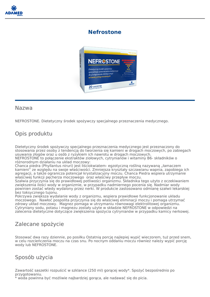 Nefrostone Nazwa NEFROSTONE. Dietetyczny środek spożywczy specjalnego przeznaczenia medycznego. Opis produktu Dietetyczny środek spożywczy specjalnego przeznaczenia medycznego jest przeznaczony do stosowania przez osoby z tendencją do tworzenia się kamieni w drogach moczowych, po zabiegach usuwania złogów oraz u osób z ryzykiem ich nawrotu w drogach moczowych. NEFROSTONE to połączenie ekstraktów ziołowych, cytrynianów i witaminy B6- składników o różnorodnym działaniu na układ moczowy: Chanca piedra (Phyllantus niruri) jest liściokwiatem- egzotyczną rośliną nazywaną „łamaczem kamieni” ze względu na swoje właściwości. Zmniejsza kryształy szczawianu wapnia, zapobiega ich agregacji, a także ogranicza potencjał krystalizacyjny moczu. Chanca Piedra wspiera utrzymanie właściwej funkcji pęcherza moczowego oraz właściwy przepływ moczu. Szałwia przyczynia się do prawidłowej potliwości organizmu. Składnika tego użyto z oczekiwaniem zwiększenia ilości wody w organizmie, w przypadku nadmiernego pocenia się. Nadmiar wody powinien zostać wtedy wydalony przez nerki. W produkcie zastosowano odmianę szałwii lekarskiej bez toksycznego tujonu. Pokrzywa zwiększa wydalanie wody z organizmu, wspiera prawidłowe funkcjonowanie układu moczowego. Nawłoć pospolita przyczynia się do właściwej eliminacji moczu i pomaga utrzymać zdrowy układ moczowy. Magnez pomaga w utrzymaniu równowagi elektrolitowej organizmu. Cytryniany sodu, potasu i magnezu zostały użyte w składzie NEFROSTONE w odpowiedzi na zalecenia dietetyczne dotyczące zwiększenia spożycia cytrynianów w przypadku kamicy nerkowej. Zalecane spożycie Stosować dwa razy dziennie, po posiłku Ostatnią porcję najlepiej wypić wieczorem, tuż przed snem, w celu rozcieńczenia moczu na czas snu. Po nocnym oddaniu moczu również należy wypić porcję wody lub NEFROSTONE. Sposób użycia Zawartość saszetki rozpuścić w szklance (250 ml) gorącej wody*. Spożyć bezpośrednio po przygotowaniu. * woda powinna być możliwie najbardziej gorąca, ale nadawać się do picia. Składniki Cytrynian potasu (potas); cytrynian sodu (sód); substancja słodząca - sorbitol; cytrynian magnezu (magnez); regulator kwasowości - kwas cytrynowy ; wyciąg suchy z ziela Phyllanthus niruri; suszony koncentrat cytryny; wyciąg suchy z ziela nawłoci pospolitej; aromat cytrynowy w proszku LF-AR-NS; aromat maskujący; wyciąg suchy z liścia pokrzywy zwyczajnej; substancja przeciwzbrylająca - dwutlenek krzemu ; wyciąg suchy z ziela szałwii lekarskiej; substancja słodząca acesulfam K ; barwnik - karoteny; chlorowodorek pirydoksyny (witamina B6). Zrównoważona dieta i zdrowy tryb życia są ważne dla prawidłowego funkcjonowania organizmu. Ważne informacje Produkt przyjmowany pod nadzorem lekarza. Produkt nie jest odpowiedni do przyjmowania jako jedyne źródło pożywienia. Produkt nie jest przeznaczony do stosowania pozajelitowego. Produkt przeznaczony dla osób dorosłych. Podczas stosowania należy spożywać min. 2 litry płynów dziennie. Wskazane jest zwiększenie aktywności fizycznej. Nefrostone zawiera substancje słodzące. Zawiera źródło fenyloalaniny. Spożycie w nadmiernych ilościach może mieć efekt przeczyszczający. Przeciwwskazania i środki ostrożności Nie należy stosować w przypadku nadwrażliwości na którykolwiek ze składników produktu. Nie stosować u kobiet w okresie ciąży i laktacji oraz u dzieci. Nie stosować u pacjentów z obrzękami pochodzenia sercowego lub nerkowego. Nie stosować w przypadku alkalozy metabolicznej. Nie stosować w przypadku hiperkalemii (hiperpotasemii). Nie stosować w czynnej chorobie wrzodowej. Należy stosować ostrożnie u osób przyjmujących leki na nadciśnienie oraz u osób z incydentami hipoglikemii. Opakowanie 20 saszetek, zawartość netto: 105 g, smak cytrynowy, proszek do rozpuszczania. Podmiot odpowiedzialny ADAMED Consumer Healthcare S.A. Pieńków 149, 05-152 Czosnów