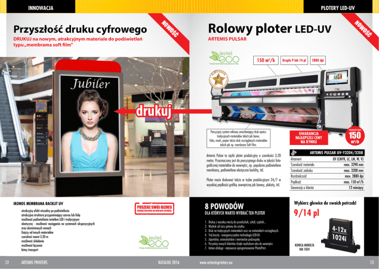 INNOWACJA PLOTERY LED-UV OŚ W OŚ W Ć Ć DRUKUJ na nowym, atrakcyjnym materiale do podświetleń typu „membrama soft film” NO Rolowy ploter LED-UV NO Przyszłość druku cyfrowego ARTEMIS PULSAR jesteś Twoja konkurencja jeszcze nie. 150 m2/h Kropla 9 lub 14 pl 2880 dpi drukuj Precyzyjny system rolkowy umożliwiający druk oprócz tradycyjnych materiałów takich jak baner, folia, mesh, papier także druk rozciągliwych materiałów takich jak np. membrana Soft Film. Artemis Pulsar to ciężki ploter produkcyjny o szerokości 3.20 metra. Przeznaczony jest do precyzyjnego druku w jakości fotograficznej materiałów do wewnątrz, np. popularne podświetlane membrany, podświetlane elastyczne backlity, itd. Ploter może drukować także w trybie produkcyjnym 24/7 w wysokiej prędkości grafikę zewnętrzną jak banery, plakaty, itd. IKONOS MEMBRANA BACKLIT UV • • • • • • • • • 12 atrakcyjny efekt wizualny po podświetleniu atrakcyjna struktura przypominający canvas lub folię możliwość podświetlania światłem LED i tradycyjnym elastyczny - możliwość naciągania na systemach ekspozycyjnych oraz aluminiowych ramach lżejszy od innych materiałów szerokość nawet 3.20 m możliwość składania możliwość łączenia łatwy transport ARTEMIS PRINTERS POSZERZ SWÓJ BIZNES drukuj zlecenia na których zarobisz jesteś Twoja konkurencja jeszcze nie. KATALOG 2016 8 POWODÓW DLA KTÓRYCH WARTO WYBRAĆ TEN PLOTER 1. 2. 3. 4. 5. 6. 7. Drukuj z wysoką marżą do przedszkoli, szkół, szpitali... Wydruk od razu gotowy do użytku. Druk na tradycyjnych materiałach oraz na materiałach rozciągliwych. Tnij koszty - energooszczędna technologia LED-UV. Japońskie, amerykańskie i niemieckie podzespoły. Pozyskaj nowych klientów dzięki wydrukom eko do wewnątrz. Łatwa obsługa - najnowsze oprogramowanie PhotoPrint. www.artemisprinters.eu GWARANCJA NAJLEPSZEJ CENY NA RYNKU PRĘDKOŚĆ MAX. 150 m2/h ARTEMIS PULSAR UV-Y3204/3208 Atrament Szerokość materiału Szerokość zadruku Rozdzielczość Prędkość Gwarancja u klienta UV (CMYK, LC, LM, W, V) max. 3290 mm max. 3200 mm max. 2880 dpi max. 150 m2/h 12 miesięcy Wybierz głowice do swoich potrzeb! 9/14 pl KONICA MINOLTA KM 1024 13