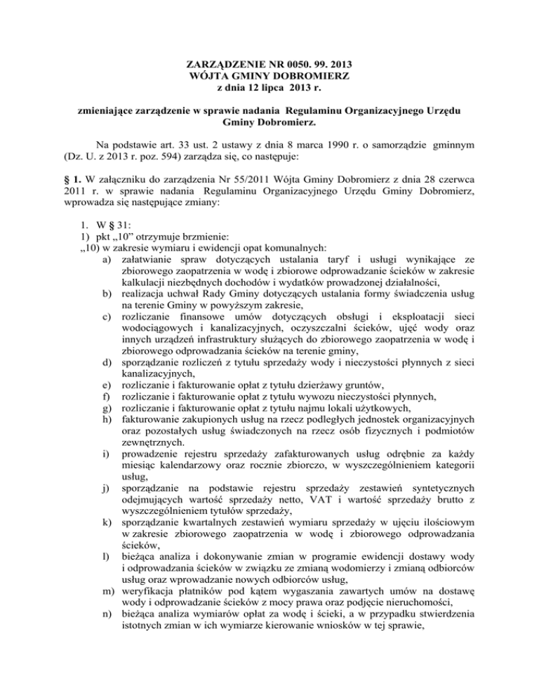 ZARZĄDZENIE NR 0050. 99. 2013 WÓJTA GMINY DOBROMIERZ z dnia 12 lipca 2013 r. zmieniające zarządzenie w sprawie nadania Regulaminu Organizacyjnego Urzędu Gminy Dobromierz. Na podstawie art. 33 ust. 2 ustawy z dnia 8 marca 1990 r. o samorządzie gminnym (Dz. U. z 2013 r. poz. 594) zarządza się, co następuje: § 1. W załączniku do zarządzenia Nr 55/2011 Wójta Gminy Dobromierz z dnia 28 czerwca 2011 r. w sprawie nadania Regulaminu Organizacyjnego Urzędu Gminy Dobromierz, wprowadza się następujące zmiany: 1. W § 31: 1) pkt „10” otrzymuje brzmienie: „10) w zakresie wymiaru i ewidencji opat komunalnych: a) załatwianie spraw dotyczących ustalania taryf i usługi wynikające ze zbiorowego zaopatrzenia w wodę i zbiorowe odprowadzanie ścieków w zakresie kalkulacji niezbędnych dochodów i wydatków prowadzonej działalności, b) realizacja uchwał Rady Gminy dotyczących ustalania formy świadczenia usług na terenie Gminy w powyższym zakresie, c) rozliczanie finansowe umów dotyczących obsługi i eksploatacji sieci wodociągowych i kanalizacyjnych, oczyszczalni ścieków, ujęć wody oraz innych urządzeń infrastruktury służących do zbiorowego zaopatrzenia w wodę i zbiorowego odprowadzania ścieków na terenie gminy, d) sporządzanie rozliczeń z tytułu sprzedaży wody i nieczystości płynnych z sieci kanalizacyjnych, e) rozliczanie i fakturowanie opłat z tytułu dzierżawy gruntów, f) rozliczanie i fakturowanie opłat z tytułu wywozu nieczystości płynnych, g) rozliczanie i fakturowanie opłat z tytułu najmu lokali użytkowych, h) fakturowanie zakupionych usług na rzecz podległych jednostek organizacyjnych oraz pozostałych usług świadczonych na rzecz osób fizycznych i podmiotów zewnętrznych. i) prowadzenie rejestru sprzedaży zafakturowanych usług odrębnie za każdy miesiąc kalendarzowy oraz rocznie zbiorczo, w wyszczególnieniem kategorii usług, j) sporządzanie na podstawie rejestru sprzedaży zestawień syntetycznych odejmujących wartość sprzedaży netto, VAT i wartość sprzedaży brutto z wyszczególnieniem tytułów sprzedaży, k) sporządzanie kwartalnych zestawień wymiaru sprzedaży w ujęciu ilościowym w zakresie zbiorowego zaopatrzenia w wodę i zbiorowego odprowadzania ścieków, l) bieżąca analiza i dokonywanie zmian w programie ewidencji dostawy wody i odprowadzania ścieków w związku ze zmianą wodomierzy i zmianą odbiorców usług oraz wprowadzanie nowych odbiorców usług, m) weryfikacja płatników pod kątem wygaszania zawartych umów na dostawę wody i odprowadzanie ścieków z mocy prawa oraz podjęcie nieruchomości, n) bieżąca analiza wymiarów opłat za wodę i ścieki, a w przypadku stwierdzenia istotnych zmian w ich wymiarze kierowanie wniosków w tej sprawie, o) prowadzenie spraw związanych z wstrzymaniem dostawy wody poprzez zamknięcie przyłącza wodociągowego, a w szczególności dokonywanie stosownych wpisów w kartotekach płatników oraz prowadzenie na bieżąco rejestru odcięć i ponownych wpięć, p) obsługa klienta w zakresie wyjaśniania wysokości naliczanych opłat, wystawiania faktur VAT oraz przyjmowanie zgłoszeń o stanach wodomierzy, q) transfer danych do i z modułu Psion, a następnie weryfikacja obciążeń płatników dokonanych przez inkasenta i fakturowanie osób pominiętych przez inkasenta na podstawie średniego zużycia, r) opracowanie całorocznego harmonogramu spisów wodomierzy w poszczególnych miejscowościach oraz przestrzeganie jego terminów, s) bieżące i terminowe rozliczanie opłat za dostawę wody Bi ścieków oraz nieczystości płynnych wspólnot mieszkaniowych na terenie gminy”. 2) dodaje się pkt „10a” w brzmieniu: „10a) w zakresie księgowości opłat komunalnych: a) ewidencja analityczna: − wpłat odbiorców wody i ścieków, − najemców lokali użytkowych, − wpłat z tytułu dzierżawy gruntów, − wpłat z tytułu nieczystości płynnych dowożonych do oczyszczalni ścieków. a) prowadzenie ewidencji realizacji należnych opłat oraz egzekwowanie ich terminowej realizacji w zakresie zbiorowego zaopatrzenia w wodę i zbiorowego odprowadzania ścieków, dzierżawy gruntów, najmu lokali użytkowych oraz wywozu nieczystości płynnych, b) opracowywanie zestawień zaległości w opłatach za wodę i ścieki, dzierżawy gruntów, wywozu nieczystości płynnych, najmu lokali użytkowych oraz szczegółowych analiz zadłużeń opłat odbiorców usług w zależności od potrzeb, c) prowadzenie spraw związanych z udzielaniem ulg w spłacie należności cywilnoprawnych, między innymi poprzez zawieranie porozumień na spłatę zadłużenia w ratach, d) nadzór nad terminową realizacja zawartych porozumień na spłatę zadłużenia w ratach oraz podejmowanie stosownych czynności w przypadku nie wywiązania się strony postanowień zawartych ugód, e) prowadzenie rejestru zawartych ugód z uwzględnieniem stopnia ich realizacji, f) ewidencja księgowa spłaty zadłużeń za wodę i ścieki oraz wywóz nieczystości płynnych w formie świadczenia zastępczego – odpracowanie długu, g) bieżący monitoring stanu zaległości za wodę i ścieki, czynsze z tytułu najmu lokali użytkowych, dzierżawę gruntów, wywóz nieczystości płynnych oraz systematyczny indywidualny kontakt z poszczególnymi dłużnikami, h) dochodzenie zaległości w opłatach za wodę i ścieki, opłatach za najem lokali użytkowych, dzierżawę gruntów oraz wywóz nieczystości płynnych, i) ustalenie struktury zaległości pod katem terminu ich wymagalności i przedawnienia oraz podejmowanie czynności mających na celu zatrzymanie biegu przedawnienia, j) weryfikacja i uzgadnianie w okresach miesięcznych wysokości zaewidencjonowanych w księgowości analitycznej wpłat z tytułu dostawy wody i odprowadzania ścieków, wywozu nieczystości płynnych, dzierżawy gruntów, najmu lokali użytkowych ze stanem wynikającym z księgowości syntetycznej, k) opracowywanie i ter