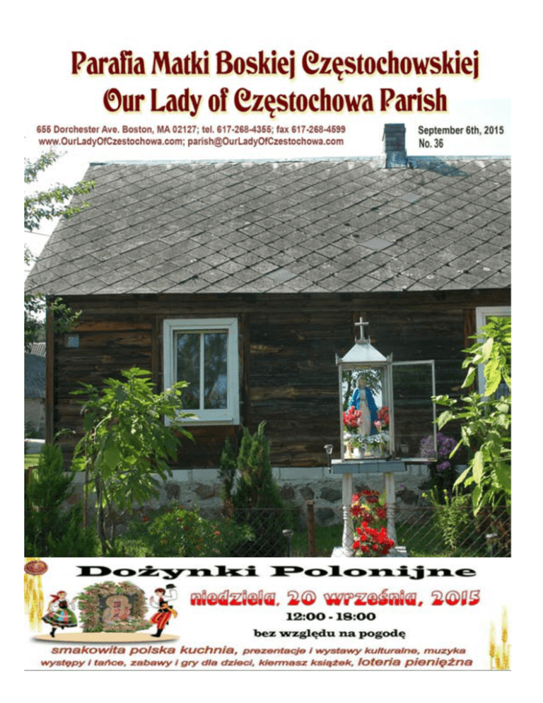 BIURO PARAFIALNE / PARISH OFFICE Tel: 617-268-4355; Fax: 617-268-4599 Monday - Friday - 8:00 am - 2:00 pm Saturday: 10:00 am - 12:00 pm Evenings and weekends - by appointment only. PORZĄDEK MSZY ŚWIĘTYCH MASS SCHEDULE Mon. - Wed. 7:00 am (English); 8:00 am (Polish) Thursday 7:00 am (English) 7:00 pm (Polish) Friday 7:00 am (English) 6:00 pm - 7:00 pm - Adoracja Najśw. Sakr. - Koronka Spowiedź - Adoration, Divine Mercy Chaplet, Confession 7:00 pm (Polish) Saturday 8:00 am (Polish) 4:00 pm (English) 7:00 pm (Polish) Sunday 8:00 am (Polish) 9:30 am (English) 11:00 am (Polish) Holydays - as announced SPOWIEDŹ / CONFESSIONS Friday 6:00 pm and every day 30 min. before Masses. CHRZEST / BAPTISM By arrangement with the priest. Instruction for parents and godparents is required. SAKRAMENT MAŁŻEŃSTWA / MARRIAGE Please, make arrangement with the parish office at least six months in advance. Instruction is required. SAKRAMENT CHORYCH/SACRAMENT OF THE SICK Parishioners who are seriously ill should call the office to arrange for a priest to visit and administer the Sacraments. ŻYCIE JEST DAREM OD BOGA Jeżeli odkryłaś, że pod Twym sercem poczęło się życie, przyjdź do nas sama lub z najbliższą osobą i podziel się tą wspaniałą nowiną. Będziemy Ci błogosławić, a jeśli trzeba - służyć pomocą. Nie lękaj się! - Ojcowie franciszkanie PASTORAL STAFF - FRANCISCAN FRIARS OJCOWIE FRANCISZKANIE (OFM Conv.) Fr. Jerzy Żebrowski OFMConv. - pastor Fr. Józef Brzozowski OFMConv. - guardian & parochial vicar Fr. Aloysius Minyong Hong OFMConv. - in residence KATECHECI / CATECHISTS Diakon Paweł Sawiak - bierzmowanie; Urszula Boryczka - kl. 0 Elżbieta Sokołowska - kl. 0; Danuta Surowiec-Ramos - kl. 2; Zofia Fiedorczyk - kl. 3; Monika Danek - kl. 4; Anna Maziarz - kl. 5; Piotr Goszczynski - kl. 6; Danuta Daniels - kl. 6; Eugeniusz Bramowski - kl. 7; Alicja Szewczyk - zastępstwa; Beata Kozak - zastępstwa; Małgorzata Sokołowski - zastępstwa; Iwona Gajczak - koordynatorka PRACOWNICY PARAFII / OFFICE STAFF Secretary & Religious Education Coordinator - Mrs. Iwona Gajczak Bookkeeper & Office Assistant - Ms. Connie Bielawski RADA PARAFIALNA / PARISH COUNCIL Mr. Szymon Biegański, Mr. Grzegorz Boryczka, Mr. Eugeniusz Bramowski, Mr. Czesław Kilian, Mr. Jan Kozak, Ms. Maryann Sadowski, Mr. Zbigniew Saletnik, Ms. Danuta Urbaniak, Mrs. Lucy Willis, Mrs. Władzia Wygonowska RADA FINANSOWA / FINANCE COUNCIL Ms. Constance Bielawski, Mr. Grzegorz Boryczka, Mr. Maks Gradziuk, Mr. Rafał Jabłonka, Mr. Richard Rolak, Mr. Wiesław Wierzbowski SŁUŻBA MUZYCZNA / MUSIC MINISTRY Organist & Psalmist: Mrs. Marta Saletnik ZAKRYSTIA/SACRISTAN – KWIATY/FLOWERS Mrs. Beata Kozak & Mrs. Renata Marshall Misją Parafii Matki Bożej Częstochowskiej jest dawanie świadectwa wiary rzymsko-katolickiej i polskiego dziedzictwa. Ofiarnie i nieustannie służymy Bogu i sobie nawzajem zachowując i dzieląc się naszymi polskimi tradycjami w otwarciu się na wszystkich ludzi. Parafię obsługują Ojcowie Franciszkanie. The mission of the Parish of Our Lady of Czestochowa is to bear witness to our Roman Catholic faith and our Polish heritage. We strive to continue to serve God and each other, celebrating and sharing our Polish traditions, welcoming and reaching out to all people. The parish is served by Conventual Franciscan Friars. LIFE IS A GIFT FROM GOD If you discovered that a new life began under your heart, come to us alone or with someone you love, and share this wonderful news. We will bless you, and - if necessary - offer you help. Do not be afraid! - Franciscan Fathers ACTIVITIES & ORGANIZATIONS ♦ Sala św. Jana Pawła II — St. John Paul II Hall Kontakt w sprawie wynajmu sali: tel: 617-268-4355 W sprawie sprzętu audio-wizualnego tel. 617-922-3691 Contact for renting the hall: tel: 617-268-4355 For audio-visual equipment tel. 617-922-3691 (Mariusz) ♦ Ministranci / Altar Servers - Eugeniusz Bramowski Spotkania w pierwsze niedziele miesiąca w sali świętego Jana Pawła II o godz. 10:00 am (781-871-2991) ♦ Fundacja Kultury Polskiej - Polish Cultural Foundation, Inc. - Mr. Andrzej Pronczuk - tel. 617-859-9910 ♦ Polska Szkoła Sobotnia - Polish Saturday School - Mr. Jan Kozak - tel. 617-464-2485 ♦ Chór Parafialny i Chórek Dziecięcy Promyki św. Jana Pawła II - Parish Choir & Children Choir - Mrs. Marta Saletnik, tel. kom. 857-212-7962 ♦ Stowarzyszenie Weteranów Armii Polskiej - SWAP #37 Mr. Wincenty Wiktorowski - tel. 617-288-1649 Grupa AA - Stanisław, tel. 508 283 4262 Sala pod kościołem. 2 Spotkania odbywają się w każdy czwartek o godz. 7:00 pm ♦ Krakowiak - Wednesdays at 7:30 pm - St. John Paul II hall www.krakowiak.org,: Eric Pierce: Tel. 508-320-2344 ♦ Żywy Różaniec / Rosary Society - Mrs. Genowefa Lisek tel. 617-436-5779 ♦ Siostry Matki Bożej Miłosierdzia Sisters of Our Lady of Mercy: tel. 617-288-1202 ♦ Polski Amatorski Teatr w Bostonie / Polish Theater - Mrs. Małgorzata Tutko: tel. 617-325-2208 ♦ Harcerze / Polish Scouts - The meetings will be conducted in Polish for young boys and girls. Contact information: Mateusz Wozny, tel. 347-749-5867, email: [email protected] ♦ Klub Polski Polish American Citizens Club - Mr. Christopher Lisek Club: 617-436-2786; Cell: 617-436-2686 All Things Well The incident in today's Gospel is recorded only by Mark. The key line is what the crowd says at the end: "He has done all things well." In the Greek, this echoes the creation story, recalling that God saw all the things he had done and declared them good (see Genesis 1:31). Mark also deliberately evokes Isaiah's promise, which we hear in today's First Reading that God will make the deaf hear and the mute speak. He even uses a Greek word to describe the man's condition (mogilalon = "speech impediment") that's only found in one other place in the Bible - in the Greek translation of today's Isaiah passage, where the prophet describes the "dumb" singing. The crowd recognizes th