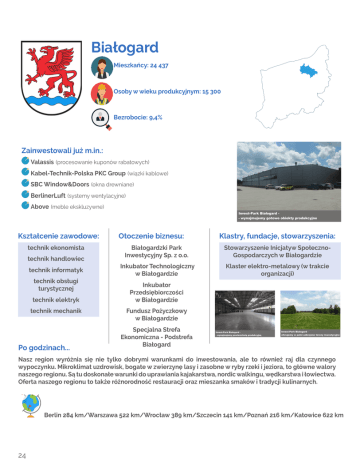 Białogard Mieszkańcy: 24 437 Osoby w wieku produkcyjnym: 15 300 Bezrobocie: 9,4% Zainwestowali już m.in.: Valassis (procesowanie kuponów rabatowych) Kabel-Technik-Polska PKC Group (wiązki kablowe) SBC Window&Doors (okna drewniane) BerlinerLuft (systemy wentylacyjne) Above (meble ekskluzywne) Kształcenie zawodowe: technik ekonomista technik handlowiec technik informatyk technik obsługi turystycznej technik elektryk technik mechanik Po godzinach... Otoczenie biznesu: Klastry, fundacje, stowarzyszenia: Białogardzki Park Inwestycyjny Sp. z o.o. Stowarzyszenie Inicjatyw SpołecznoGospodarczych w Białogardzie Inkubator Technologiczny w Białogardzie Klaster elektro-metalowy (w trakcie organizacji) Inkubator Przedsiębiorczości w Białogardzie Fundusz Pożyczkowy w Białogardzie Specjalna Strefa Ekonomiczna - Podstrefa Białogard Nasz region wyróżnia się nie tylko dobrymi warunkami do inwestowania, ale to również raj dla czynnego wypoczynku. Mikroklimat uzdrowisk, bogate w zwierzynę lasy i zasobne w ryby rzeki i jeziora, to główne walory naszego regionu. Są tu doskonałe warunki do uprawiania kajakarstwa, nordic walkingu, wędkarstwa i łowiectwa. Oferta naszego regionu to także różnorodność restauracji oraz mieszanka smaków i tradycji kulinarnych. Berlin 284 km/Warszawa 522 km/Wrocław 389 km/Szczecin 141 km/Poznań 216 km/Katowice 622 km 24 Tereny inwestycyjne Białogard Teren 1 Lokalizacja: Orientacyjna cena gruntu: Działka nr 16/10 obr. 004 Białogard Od 38 zł/m2 netto Białogardzki Park Inwestycyjny „Invest-Park” – Białogard, ul. Kołobrzeska Media (jakie są dostępne na terenie działki, a jeśli nie ma, to odległości do najbliższych przyłączy): Maksymalna dostępna powierzchnia: 1,2345 ha Procent dopuszczalnej zabudowy: 50% Droga dojazdowa do terenu: TAK gaz, woda, kanalizacja, energia elektryczna Teren 2 Lokalizacja: Orientacyjna cena gruntu: Działka nr 16/9 obr. 004 Białogard Od 38 zł/m2 netto Białogardzki Park Inwestycyjny „Invest-Park” – Białogard, ul. Kołobrzeska Media (jakie są dostępne na terenie działki, a jeśli nie ma, to odległości do najbliższych przyłączy): Maksymalna dostępna powierzchnia: 5,6277 ha Procent dopuszczalnej zabudowy: 50% Droga dojazdowa do terenu: TAK gaz, woda, kanalizacja, energia elektryczna Teren 3 Lokalizacja: Orientacyjna cena gruntu: Działka nr 2/1 obr. 004 Białogard Od 33 zł/m2 netto Białogardzki Park Inwestycyjny „Invest-Park” – Białogard, ul. Kołobrzeska Media (jakie są dostępne na terenie działki, a jeśli nie ma, to odległości do najbliższych przyłączy): Maksymalna dostępna powierzchnia: 25,7454 ha Procent dopuszczalnej zabudowy: 70% Droga dojazdowa do terenu: TAK gaz, woda, kanalizacja, energia elektryczna Białogardzki Park Inwestycyjny INVEST-PARK Sp. z o.o. 78-200 Białogard, ul. Kołobrzeska 58 tel. +48 94 312 44 49 kom. +48 600 899 138 www.investparkbialogard.pl, e-mail: [email protected] 25