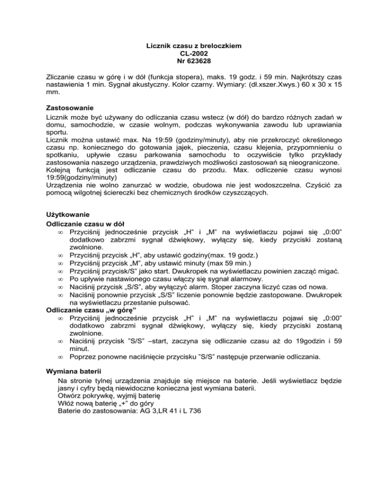 Licznik czasu z breloczkiem CL-2002 Nr 623628 Zliczanie czasu w górę i w dół (funkcja stopera), maks. 19 godz. i 59 min. Najkrótszy czas nastawienia 1 min. Sygnał akustyczny. Kolor czarny. Wymiary: (dł.xszer.Xwys.) 60 x 30 x 15 mm. Zastosowanie Licznik może być używany do odliczania czasu wstecz (w dół) do bardzo różnych zadań w domu, samochodzie, w czasie wolnym, podczas wykonywania zawodu lub uprawiania sportu. Licznik można ustawić max. Na 19:59 (godziny/minuty), aby nie przekroczyć określonego czasu np. koniecznego do gotowania jajek, pieczenia, czasu klejenia, przypomnieniu o spotkaniu, upływie czasu parkowania samochodu to oczywiście tylko przykłady zastosowania naszego urządzenia, prawdziwych możliwości zastosowań są nieograniczone. Kolejną funkcją jest odliczanie czasu do przodu. Max. odliczenie czasu wynosi 19:59(godziny/minuty) Urządzenia nie wolno zanurzać w wodzie, obudowa nie jest wodoszczelna. Czyścić za pomocą wilgotnej ściereczki bez chemicznych środków czyszczących. Użytkowanie Odliczanie czasu w dół • Przyciśnij jednocześnie przycisk „H” i „M” na wyświetlaczu pojawi się „0:00” dodatkowo zabrzmi sygnał dźwiękowy, wyłączy się, kiedy przyciski zostaną zwolnione. • Przyciśnij przycisk „H”, aby ustawić godziny(max. 19 godz.) • Przyciśnij przycisk „M”, aby ustawić minuty (max 59 min.) • Przyciśnij przycisk/S” jako start. Dwukropek na wyświetlaczu powinien zacząć migać. • Po upływie nastawionego czasu włączy się sygnał alarmowy. • Naciśnij przycisk „S/S”, aby wyłączyć alarm. Stoper zaczyna liczyć czas od nowa. • Naciśnij ponownie przycisk „S/S” liczenie ponownie będzie zastopowane. Dwukropek na wyświetlaczu przestanie pulsować. Odliczanie czasu „w górę” • Przyciśnij jednocześnie przycisk „H” i „M” na wyświetlaczu pojawi się „0:00” dodatkowo zabrzmi sygnał dźwiękowy, wyłączy się, kiedy przyciski zostaną zwolnione. • Naciśnij przycisk ”S/S” –start, zaczyna się odliczanie czasu aż do 19godzin i 59 minut. • Poprzez ponowne naciśnięcie przycisku ”S/S” następuje przerwanie odliczania. Wymiana baterii Na stronie tylnej urządzenia znajduje się miejsce na baterie. Jeśli wyświetlacz będzie jasny i cyfry będą niewidoczne konieczna jest wymiana baterii. Otwórz pokrywkę, wyjmij baterię Włóż nową baterię „+” do góry Baterie do zastosowania: AG 3,LR 41 i L 736