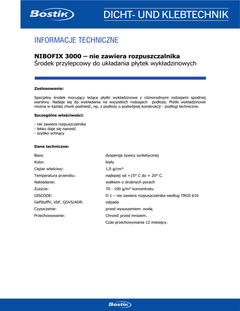 INFORMACJE TECHNICZNE NIBOFIX 3000 – nie zawiera rozpuszczalnika Środek przylepcowy do układania płytek wykładzinowych Zastosowanie: Specjalny środek mocujący leżące płytki wykładzinowe z różnorodnymi rodzajami spodniej warstwy. Nadaje się do wykładania na wszystkich rodzajach podłoża. Płytki wykładzinowe można w każdej chwili podnieść, np. z podłoży o podwójnej konstrukcji - podłogi techniczne. Szczególne właściwości: - nie zawiera rozpuszczalnika - lekko daje się nanosić - szybko schnący Dane techniczne: Baza: dyspersja żywicy syntetycznej Kolor: biały Ciężar właściwy: 1,0 g/cm³ Temperatura przerobu: najlepiej od +15° C do + 20° C. Nakładanie: wałkiem o drobnych porach Zużycie: 70 - 100 g/m² koncentratu GISCODE: D 1 – nie zawiera rozpuszczalnika według TRGS 610 GefStoffV, VbF, GGVS/ADR: odpada Czyszczenie: przed wysuszeniem: wodą Przechowywanie: Chronić przed mrozem. Czas przechowywania 12 miesięcy. Spis treści Przygotowanie podłoża: Podłoże musi być zgodnie z obowiązującymi normami i instrukcjami (DIN 18365) oczyszczone, suche, wolne od kurzu, oleju, tłuszczu, wosku i innych substancji izolacyjnych, niezarysowane, wytrzymałe na ściskanie i rozciąganie. Na chłonne podłoża trzeba nanieść NIBOGRUND G 17 (1:1 rozcieńczony wodą). Powierzchnia podłoża użytkowego musi być dobrze związana z podłożem nośnym. Sposób użycia: NIBOFIX 3000 nanieść równomiernie na podłoże wałkiem z drobnymi porami i odczekać aż wyschnie do przeźroczystego filmu. Czas schnięcia wynosi na chłonnych podłożach 15 – 30 minut. Przy niechłonnych podłożach trzeba odczekać dłuższy czas odparowania, dopóki naniesiona warstwa całkowicie nie wyschnie. Następnie układać wykładzinę i dokładnie docisnąć. Zwrócić uwagę, że przy podwójnej konstrukcji podłogi fugi płyt nie zostaną sklejone. Antystatyczne wykładanie: Do mocowania antystatycznych płytek wykładzinowych wymieszać NIBOFIX 3000 z LEITZUSATZ 3000. Stosunek mieszania: 3 kg LEITZUSATZ 3000 na 20 kg NIBOFIX 3000. Używać tylko pełne oryginalne opakowania. Mieszanka nie może być przechowywana, dlatego mieszankę bezpośrednio po wymieszaniu zużyć lub resztki produktu usunąć zgodnie z miejscowymi przepisami. Przy układaniu wykładzin należy cały czas zwracać uwagę na zalecenia producentów wykładziny. Opakowanie: 10 kg kanister 32 sztuki na palecie Spis treści Powyższych wskazówek udzielamy Państwu na podstawie przeprowadzonych prób i doświadczeń. Nie gwarantujemy jednak za efekt końcowy w jednostkowym przypadku z powodu możliwości różnorodnego zastosowania naszych produktów, jak i niezależnych od nas warunków magazynowania i użycia. Obowiązuje to również w wypadku roszczeń względem naszych doradców technicznych i handlowych. Zaleca się przeprowadzanie własnych prób. W momencie ukazania się niniejszego prospektu wszystkie wydania zostają unieważnione. Wydano: 02.2005 Bostik Polska z o.•o.ul.• ul. Średzka • 63-005 Kleszczewo k./Poznania Bostik Sp.Sp. z o.o. Średzka 8 •863-005 Kleszczewo k./Poznania Tel. / Fax Fax 061 // 663 663 88 88 87 87•• Tel. 88 86 86 •• Tel. Tel. 061 061 / 663 88 Tel.502 502 // 16 16 16 16 26