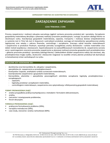 Gwarantowany wysoki poziom merytoryczny i organizacyjny szkoleń. Polska firma szkoleniowa – od 15 lat na rynku szkoleń dla biznesu. ZAPRASZAMY PAŃSTWA DO UCZESTNICTWA W SZKOLENIU: ZARZĄDZANIE ZAPASAMI. CZAS TRWANIA: 2 DNI Procesy zaopatrzenia i realizacji zakupów warunkują ciągłość zarówno procesów produkcji jak i sprzedaży. Zarządzanie gospodarką materiałową decyduje o planowej realizacji procesów produkcyjnych, rzutując na poziom obsługi klienta na docelowym rynku. Koordynacja gospodarki materiałowej, zapasów, transportu i realizacji dostaw (niejednokrotnie w systemie Just in Time lub Just in Sequence) z potrzebami produkcji, wymaga od menedżerów specjalistycznej wiedzy logistycznej oraz wiedzy z zakresu finansów, controllingu i zarządzania. Znaczący udział kosztów materiałowych i zaopatrzenia w produkcie finalnym, wywołuje potrzeby szczegółowej analizy dostawców i rynków materiałów oraz dobór metod współpracy z dostawcami. Zapotrzebowanie na wykwalifikowanych menedżerów ds. zaopatrzenia wzrasta wraz z postrzeganiem znaczenia procesów zaopatrzenia w planowej realizacji procesów gospodarczych przedsiębiorstwa – głównie procesów produkcji i sprzedaży (obsługi klienta). Całokształtem działań zaopatrzenia należy tak sterować, aby przedsiębiorstwa mogły szybko, skutecznie i elastycznie reagować na wszelkie zmiany planów produkcji lub dystrybucji w konsekwencji zmian zachodzących na rynku. SZKOLENIE JEST KIEROWANE DO: - dyrektorów oraz kierowników ds. zakupów i zaopatrzenia, specjalistów ds. zaopatrzenia w przedsiębiorstwach, branżystów i kupców, analityków rynków surowcowo-materiałowych, koordynatorów zaopatrzenia i gospodarki materiałowej, kierowników, planistów i specjalistów poszczególnych odcinków zarządzania logistyką przedsiębiorstwa zarządzających: - zapasami, - logistyką produkcji i przepływem materiałów, - controllingiem materiałowym, zaopatrzenia oraz optymalizacją i efektywnością gospodarki materiałowej FORMY PROWADZENIA ZAJĘĆ: analiza przypadków praktycznychpołączona z metodami i formułami obliczeniowymi, analizy, ćwiczenia i rozwiązywanie problemów, forum decyzyjne. FORMUŁA PROWADZENIA ZAJĘĆ: praktyczne formułowanie problemu (20%), narzędzia metodyczne (20%), case study, ćwiczenia i analizy rachunkowe (60%). ATL “Achievement Through Learning” Sp. z o.o. 02-793 Warszawa, ul. Belgradzka 14/14; tel.: 22 853 35 23, tel. kom.: 607 573 053, faks: 22 247 21 83, e-mail: [email protected], www.atl.edu.pl NIP: 5213358018, REGON: 140233796 KRS: 0000241906, SĄD REJONOWY DLA M. ST. WARSZAWY, XIII WYDZIAŁ GOSPODARCZY KAPITAŁ ZAKŁADOWY: 80.000 PLN Gwarantowany wysoki poziom merytoryczny i organizacyjny szkoleń. Polska firma szkoleniowa – od 15 lat na rynku szkoleń dla biznesu. PROGRAM SZKOLENIA: 1. WPROWADZENIE DO ZARZĄDZANIA ZAPASAMI. • • • • • • Analiza procesów w łańcuchu dostaw i przepływu materiałów. Analiza potrzeb i czynników kształtowania zapasów w przedsiębiorstwie. Cele utrzymania zapasów i funkcje zapasów w przedsiębiorstwie. Rodzaje zapasów w łańcuchu dostaw przedsiębiorstwa. Wymagania zarządzania zapasami. Punkt rozdzielenia w łańcuchu dostaw. Alokacja zapasów. 2. KLASYFIKACJA ZAPASÓW. KOSZTY ZAPASÓW. • • • • Analiza zużycia i klasyfikacja do grup asortymentowych ABC/XYZ - praktyczne grupowanie materiałów / produktów, algorytmy analiz. Analiza kosztów zapasów. Sposoby obliczania kosztów. Współczynniki kosztów zarządzania zapasami. Współzależności kosztowe. 3. ANALIZA POPYTU I PROGNOZOWANIE. • • • • • • Analiza zużycia zapasu /popytu/. Histogram częstości popytu. Analiza parametrów planowania zapasów na podstawie pokrycia popytu/zużycia. Parametry zużycia - średnia, odchylenie standardowe, trend, sezonowość. Metody prognozowania krótko- i długoterminowego. Błąd prognozowania. Nieliniowe i liniowe algorytmy prognozowania. Adaptacyjne metody prognozowania. 4. METODY ZARZĄDZANIA ZAPASAMI. SYSTEMY ZAMAWIANIA I ODTWARZANIE ZAPASU. • • • • • • • Parametry zarządzania zapasami. Określanie wielkości zamówienia i poziomu zapasu zamawiania. Ekonomiczna wielkość zamówienia i ekonomiczna częstość zamawiania. Zmienność zużycia i analiza czasu realizacji zamówienia. Zapas bezpieczeństwa. Ciągłe i okresowe śledzenie poziomu zapasu. Praktyczne metody zarządzania zapasami i zasady ich doboru dla pokrycia stabilnych i zmiennych potrzeb (analiza współczynnika zmienności). 5. PRAKTYCZNE ASPEKTY ZARZĄDZANIA ZAPASAMI. • • • • • Wybrane decyzje zarządzania zapasami w przedsiębiorstwie – opusty cenowe, grupowanie zamówień do jednego dostawcy. Analiza pokrycia i stała pokrycia. Organizacja systemu sterowania zapasem. Analiza sieciowa i rozmieszczenie zapasów. Controlling wyników zarządzania zapasami. ATL “Achievement Through Learning” Sp. z o.o. 02-793 Warszawa, ul. Belgradzka 14/14; tel.: 22 853 35 23, tel. kom.: 607 573 053, faks: 22 247 21 83, e-mail: [email protected], www.atl.edu.pl NIP: 5213358018, REGON: 140233796 KRS: 0000241906, SĄD REJONOWY DLA M. ST. WARSZAWY, XIII WYDZIAŁ GOSPODARCZY KAPITAŁ ZAKŁADOWY: 80.000 PLN Gwarantowany wysoki poziom merytoryczny i organizacyjny szkoleń. Polska firma szkoleniowa – od 15 lat na rynku szkoleń dla biznesu. ZARZĄDZANIE ZAPASAMI. FORMULARZ ZAINTERESOWANIA: prosimy o przesłanie faksem (22) 247 21 83 lub mailem: [email protected] Jesteśmy zainteresowani zorganizowaniem szkolenia zamkniętego w naszej firmie dla grupy około ......................... osób Jesteśmy zainteresowani uczestnictwem w szkoleniu otwartym (proszę podać ilość osób) - .......................... zorganizowanym w mieście: Białystok Kraków Łódź Toruń Szczecin Gdańsk Kielce Poznań Warszawa inne ………… Katowice Lublin Rzeszów Wrocław Firma:.......................................................
