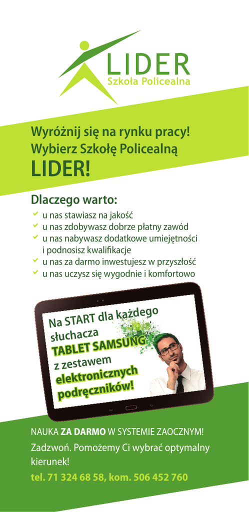 Wyróżnij się na rynku pracy! Wybierz Szkołę Policealną LIDER! Dlaczego warto: u nas stawiasz na jakość u nas zdobywasz dobrze płatny zawód u nas nabywasz dodatkowe umiejętności i podnosisz kwalifikacje u nas za darmo inwestujesz w przyszłość u nas uczysz się wygodnie i komfortowo o dla każdeg T R A T S a N słuchacza SUNG M TABLET SA z zestawem ych zn elektronic ów! podręcznik NAUKA ZA DARMO W SYSTEMIE ZAOCZNYM! Zadzwoń. Pomożemy Ci wybrać optymalny kierunek! tel. 71 324 68 58, kom. 506 452 760 Kształcimy na kierunkach: Technik Administracji Technik Drogownictwa Technik Geodeta Technik BHP Technik Informatyk Technik Rachunkowości Florysta KONTAKT Szkoła Policealna LIDER ul. Sołtysowicka 19 B, Wrocław 51-168 (okolice pl. Kromera) Godziny otwarcia: pn. - pt. 8:00 - 16:00, sb. 09:00 - 15.00 Zapraszamy! www.lider.wroclaw.pl