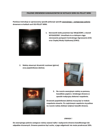 PALENIE DREWNEM KAWAŁKOWYM W KOTŁACH SERII EG-PELLET MINI Poniższa instrukcja w uproszczony sposób pokazuje sposób awaryjnego – zastępczego palenia drewnem w kotłach serii EG-PELLET MINI. 1. Sterownik kotła powinien być WŁĄCZONY, a kocioł WYGASZONY. Umożliwia to w dalszym ciągu sterowanie pompami Centralnego Ogrzewania (CO) oraz Ciepłej Wody Użytkowej (CWU). 2. Należy otworzyć drzwiczki rusztowe (górne) oraz popielnikowe (dolne). 3. Na ruszcie awaryjnym należy za pomocą kawałków papieru i drobnego drewna w sposób tradycyjny dokonać rozpalenia. Drzwiczki popielnikowe (dolne) muszą być w trakcie rozpalania otwarte. Po częściowym zapaleniu się paliwa na ruszcie należy dołożyć większe kawałki drewna. UWAGA ! Do awaryjnego palenia zastępczo należy używać tylko i wyłączenie drewna kawałkowego lub odpadów drzewnych. Drewno powinno być suche, a jego wilgotność nie może przekraczać 20%. 4. Po osiągnięciu temperatury 45 stopni na wyświetlaczu sterownika, należy zamknąć drzwiczki paleniskowe (górne) oraz otworzyć przesłonę znajdującą się w drzwiczkach popielnika (dolnych). Regulacja powietrza potrzebnego do awaryjnego, zastępczego spalania drewna powinna odbywać się w zakresie 50-100% otwarcia przesłony. 5. Zamknąć drzwiczki dolne. Zamknąć drzwi maskujące. UWAGA ! W trakcie palenia awaryjnego na ruszcie dodatkowym, nie należy wyłączać sterownika! GROZI TO AWARIĄ KOTŁA i przegrzaniem układu grzewczego. UWAGA ! Po zakończeniu palenia w trybie awaryjnym, chcąc powrócić do palenia sposobem tradycyjnym czyli AUTOMATYCZNYM, należy PAMIĘTAĆ o ZAMKNIĘCIU PRZESŁONY w drzwiczkach dolnych kotła ! Praca kotła w trybie automatycznym wymaga zamknięcia WSZYSTKICH DRZWICZEK KOTŁA ORAZ PRZESŁONY POWIETRZA ! POWRÓT DO AUTOMATYCZNEGO OPALENIA PELLETEM W przypadku, kiedy użytkownik chciałby powrócić do automatycznej pracy urządzenia na paliwie pellet, należy poczekać do zakończenia ręcznego / zastępczego sposobu palenia, a nastepnie: 1. Upewnić się, że palenie ręczne dobiegło końca. 2. W przypadku dużej ilości popiołu znajdującego się w zasobniku, należy go usunąć 3. ZAMKNĄĆ DYFUZOR powietrza w drzwiczkach popielnikowych 4. Uruchomić automatyczną pracę kotła, używając funkcji ROZPALANIE w MENU sterownika. UWAGA ! Po zakończeniu palenia w trybie awaryjnym, chcąc powrócić do palenia sposobem tradycyjnym czyli AUTOMATYCZNYM, należy PAMIĘTAĆ o ZAMKNIĘCIU PRZESŁONY w drzwiczkach dolnych kotła !
