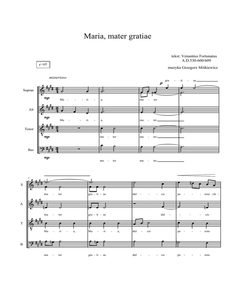 Maria, mater gratiae tekst: Venantius Fortunatus A.D.530-600/609 q =65 muzyka Grzegorz Miśkiewicz misterioso Sopran Alt Tenor Bas 5 S #### 3 & 4˙ P Ma #### 3 & 4œ P Ma # # V # # 43 P ma A T B ## & # # nœ - ma - V - - #### œ Ma - ri - œ - ri - œ œ ˙œ a, ma ˙. œ a, ma - ter ter ma - ter ˙ œ ter ma œ ∑ ˙ ma - œ ∑ ma - œ ˙ . œ̇ œ ˙ ˙ ter gra - ti - ae dul ˙ nœ œ ˙ ter gra - ti - ae œ - - œ ? #### 3 4 P ## . & # # œ̇ ˙. œ ri - œ œ a, Ma ri œ - a, dul œ nœ ˙ ˙ ma gra - ti - ae dul ter - - œ ti œ ˙. ˙ ˙ ˙. ter - œ œ cis pa œ ˙ dul cis - ae ˙. ˙ - - ˙. ˙ - - gra ter œ œ ˙ ? #### œ n œ ˙ - - - Ó œ - p - - - œ œ n˙ cis pa - - rens cle - nœ - pa - nœ œ œ œ - œ - - cis œ - rens œ - - - rens 9 S & men - ti - ae #### œœ œ n ˙œ - men - - A T B # ## & # nœ V #### pa nœ cle - œ rens cle ˙ œ ? #### Œ . - - - j œ œ œ # ˙. & # 43 Tu A # 3 & # 4 ˙. T B # V # 43 Œ œ œ œ A T B & & V p ## p ## p Œ n˙ Tu ? ## ˙ . p œ Tu Œ Tu - - nœ - - - - - - ti - - ti - - - œ nos ab hos bœ men - - - ti - ae - œ. 45 n œ . - ae - ae - - œ - nnnn# # 3 4 ˙ ˙ - nnnn# # 3 4 ˙ 5 ˙˙. 4 ti - - . 45 n ˙ nœ - j œ œ œ œ J ti - 5 4 ˙. nœ œ œ ˙ nnnn# # 3 4 ˙˙ nnnn# # 3 4 ae œ œ te pro œ œ œ - te œ #œ - - - ˙ ge œ nos ab hos - te pro - te - - - ge nos ab hos - te pro - te - - - ge œ œ œ œ œ œ œ œ œ œ nos Tu - œ œ ## n ˙ . -- œ Tu S - cle ˙ ? # # 43 ˙ . 16 - œ men - ˙ Tu - nœ b ˙˙ Tu men œœ - œ 12 S - - pa - rens cle - men - œ nœ ti - - ae - -- ˙ men - œ˙ œ œ - - cle ab hos - ˙ #œ te pro - œ œ te pro œ œ œ - te pro - ab hos - te pro - b˙ œ œ nos ab hos n˙ œ nœ nos ab hos ˙ œ œ nos ab hos nœ nos œ #œ - œ œ - te ˙ nœ œ - - - ˙ - te œ - - - #˙ nœ pro te œ - - - ge te - - - ge n˙ - ge te n˙ te œ œ - œ - - ge ge nn nn nn nn 2 20 S A T B ˙. œ & F et mor & ˙. F et ? ˙. et & ˙. & ˙. B ?œ œ œ 28 S A & et mor œ œ et mor &œ et T Vœ et B œ ?œ œ et - - œ mor - œ mor - œ œ mor - tis ho ˙ ho - - - ra mor - - - ho - ra œ œ - - mor œ ˙ tis ho œ - - ho œ œ tis ho œ œ œœ tis ho - - tis œ - tis œ - - ˙ - œ tis - œ œ ho tis - - - - ra P P P P œ œ ˙ mor - - tis ho - - - - - œ - mor œ ˙ ˙ ra sus ˙ œ ra sus ˙˙ ˙˙ ra sus - - œ - ra ra - - - ra ˙. ho sus - ra ˙. - - - œ œ ˙ ra - œ œ ˙ ˙. ho ˙ ˙ ˙. ho ra œ œ tis - ho ˙ - - œ ra œ œ œ œ œ œ - ˙ - œ œ œ - ho mor tis œ - tis et œ ho - ˙ VÓ tis - mor et T - - œ et A - ˙. mor mor 24 S - ˙. œ ˙ œ Vœ œ œ œ œ mor tis F et F œ œ œ ˙ ra ho ˙ œ tis ho œ - - œ - ci - - ci - pe. - - ci - pe. œœ - - - ci ˙ - ra ˙. - œ ra pe. - œ - ˙. œ - ra ˙. ˙˙ . . - pe. 3 œ & p et S A T B S T - ho œ ˙ ˙ ra sus ˙ œ ra sus ˙˙ ˙ ˙ ra sus tis ho œœ œœ tis ho œ œ œ œ œ œ œ œ su ti - bi sit œœ mor - - - ∑ & Vœ ∑ œ œ ? œ ∑ & ˙. - ri - ne V˙ œ de B ?œ de de Vir œ Vir - Vir - gi œ œ - gi œ œ œ gi - ne Je - - - œ - - - ˙. - - ci - pe. - - ci - pe. œ œ œ œ - pe. - - ci ˙. ˙. ˙. - pe. œ œ œ Qui na - tus œ œ œ œ œ œ œ na - tus es de Qui na - tus es œ ˙. tus es es œ œ œ œ de ˙. Vir - gi Vir - gi œ - - - - na œ œ œ œ œ œ œ œ œ su ti - bi sit œ œ œ œ œ œ sit glo P Je - Œ - Je - su ti - bi œ œ œ œ œ œ œ P Je - su ti - bi sit ne œ œ œ P su ti - glo - œ œ ˙ - œ Qui ne - - a œ - ci œ P œ œ œ - œ ˙. & ˙. - ˙. œ ne T - Œ œ œ œ glo - ri - a 40 A - Qui œ œ ˙ œ œ œ œ œ œ œ glo - ri - a glo S sus œ - - ra œ glo - ri - a B - ho mor - tis œ ˙ tis œ œ œ œ mor ?œ œ p et & - œ Vœ p et Je A mor &œ p et 36 œ œ 32 - ri - a œ œ - ri - a glo - ri - a œ œ œ bi sit glo - œ ri œ - a 4 &œ œ œ œ œ 44 S Qui A &œ Qui T B A T B œ ˙ œ ˙. tus es de Vir ˙ œ ˙. es de Vir - - - - œ Qui na tus es de Vir œ &œ F Cum œœ œœ œœ œœ œœ œ tre et al mo Spi œ ˙ mo œ œ œ œ œ œ Spi et Spi - Pa ˙ & œ œ œ œ œ œ F Cum Pa - tre et Vœ F Cum ?œ Cum & œœ &œ œ - œ Pa - œœ Pa - œ Pa - tre Pa - - Pa - - al œ œ tre et al - mo - - - œ œ mo Spi - - - - - - - tre et al œ œ al - tre et al - - - œ mo Spi nœ œ mo Spi œ œ Spi - ri - tu - œ ri - œ - ri - ri ri - ri ri œ - gi - ne - ne ˙ - œ - gi - - œ œ œ tu Spi P œ P in œ œ tu in œ #œ tu in P P ne tu œ in - ˙. œ œ œ œ #œ - tu Spi - œ œ ˙. tu a tempo Spi - ri - tu mo - œ œœ œ et - œ œœ œ # œœ œ œœ œ # œ œ œ tre gi œ œ al mo - œ - et - - - œ tre œ - œ œ - œ œœ œ - - œ œœ # œ rit. - œ œ œ ˙ œ œœ ? œ #œ #œ œ nœ œ #œ Cum - œ V œ #œ #œ œ œ œ Cum al œ Pa - ˙. ne œ - tus - ˙ Cum B œ na Vir - gi œ œ œ œ ? Cum T de na 52 A es Qui F S ˙. œ na - tus Vœ œ œ œ œ 48 S œ œ œ œ ri - tu - œ œ ri - tu - #### ˙ # #### sem # œ - - œ œ œ #### ‰ j # œ nœ sem - - pi œ - pi # ˙ sem pi - nœ - sem #### - - - œ - - - pi - 5