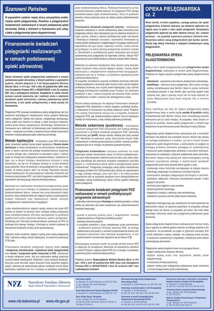 Szanowni Państwo W poprzednim wydaniu naszej strony poruszyliśmy problematykę opieki pielęgniarskiej. Pisaliśmy o pielęgniarskich świadczeniach realizowanych w ramach podstawowej opieki zdrowotnej. Dzisiaj o różnicach w finansowaniu tych usług, a także o pielęgniarskiej opiece długoterminowej. Finansowanie świadczeń pielęgniarki realizowanych w ramach podstawowej opieki zdrowotnej Zakres świadczeń opieki pielęgniarskiej udzielanych w ramach podstawowej opieki zdrowotnej, o których pisaliśmy w poprzednim wydaniu, określa załącznik nr 2 do Rozporządzenia Ministra Zdrowia (Dz.U. nr 214 poz. 1816 z dnia 28 października 2005 roku) oraz Zarządzenie Prezesa NFZ nr 69/2007/DSOZ z dnia 25 września 2007 roku z późniejszymi zmianami. Zarządzenie to ustala również zarówno warunki zawierania, jak i realizacji umów o udzielanie świadczeń opieki zdrowotnej z zakresu podstawowej opieki zdrowotnej, w tym opieki pielęgniarskiej, a także zasady ich finansowania. Pielęgniarka POZ sprawuje kompleksową opiekę pielęgniarską nad tymi pacjentami posiadającymi ubezpieczenie, którzy wypełnili deklarację wyboru pielęgniarki. Opiekę swą realizuje, uwzględniając obowiązujący zakres zadań oraz zlecenia na zabiegi, a także procedury medyczne, wydane przez lekarzy ubezpieczenia zdrowotnego. Świadczenia te finansowane są w zależności od dokonanego przez świadczeniodawcę wyboru – wskazanej we wniosku o zawarcie umowy metody finansowania świadczeń metodą kapitacyjną bądź zadaniową (punktową). Metoda kapitacyjna – finansowanie przez NFZ świadczeń opieki zdrowotnej według rocznej stawki kapitacyjnej. Roczna stawka kapitacyjna to kwota przeznaczona na sfinansowanie kompleksowej opieki w danym zakresie dla jednego świadczeniobiorcy (pacjenta) w okresie jednego roku, podzielona na dwanaście części, z których każda co miesiąc jest przekazywana świadczeniodawcy, niezależnie od tego, czy w danym miesiącu ubezpieczony korzysta z usług zdrowotnych, czy też nie. W praktyce oznacza to, że jest określona grupa pacjentów, która nie skorzysta z usług pielęgniarki ani razu – stąd zasada, że zdrowy pacjent „płaci” na chorego. Wysokość rocznych stawek kapitacyjnych dla poszczególnych zakresów świadczeń jest określana przez prezesa NFZ. Jest także korygowana współczynnikiem odpowiednim dla danej grupy wiekowej świadczeniobiorcy. Należność za zrealizowane świadczenia pielęgniarskiej opieki wypłacana jest raz w miesiącu na podstawie wystawionej przez świadczeniodawcę faktury i stanowi ona sumę dwunastych części iloczynów liczby świadczeniobiorców objętych opieką w poszczególnych grupach wiekowych oraz kapitacyjnych stawek rocznych z uwzględnieniem współczynników korygujących. Liczba świadczeniobiorców objętych opieką ustalana jest przez NFZ zgodnie ze stanem na pierwszy dzień miesiąca według przekazanej przez świadczeniodawcę informacji sporządzonej na podstawie wypełnionych przez pacjentów deklaracji wyboru pielęgniarki. Weryfikację tych informacji świadczeniodawca przekazuje do NFZ do siódmego dnia danego miesiąca. Informacja ta stanowi podstawę do finansowania świadczeń za dany okres sprawozdawczy. Całkowita liczba pacjentów objętych opieką przez jedną pielęgniarkę POZ, rozliczaną według metody kapitacyjnej, nie powinna przekroczyć 2.750 osób. Finansowanie świadczeń pielęgniarki dotyczy także nocnej i świątecznej ambulatoryjnej i wyjazdowej opieki pielęgniarskiej oraz nocnej i świątecznej opieki medycznej w POZ, udzielanych w ramach odrębnych umów. Jest ono realizowane według ustalonych rocznych stawek kapitacyjnych. Należność z tytułu realizacji świadczeń, którą jest suma dwunastu części iloczynów liczby pacjentów objętych opieką i właściwej dla realizowanego zakresu świadczeń rocznej stawki kapitacyjnej, wypłacana jest raz w miesiącu na podstawie wystawionej przez świadczeniodawcę faktury. Podstawą finansowania są listy świadczeniobiorców zadeklarowanych do pielęgniarki POZ danego świadczeniodawcy bądź świadczeniodawcy, który na podstawie zawartej umowy przejmuje prawa do objęcia opieką zadeklarowanych pacjentów. Finansowanie świadczeń pielęgniarki szkolnej – świadczenia medyczne realizowane w ramach podstawowej opieki zdrowotnej przez pielęgniarkę szkolną, która zobowiązana jest do udzielania świadczeń na rzecz uczniów, również z zakresu profilaktycznej opieki nad dziećmi i młodzieżą w środowisku nauczania i wychowania, finansowane są według stawek kapitacyjnych uwzględniających korygujące współczynniki odpowiednie dla typu szkoły i populacji uczniów. Liczba uczniów przypadająca na jedną szkolną pielęgniarkę określona została w „Standardach w profilaktycznej opiece zdrowotnej nad uczniami sprawowanej przez pielęgniarkę lub higienistkę szkolną i lekarza POZ” opracowanych przez Zakład Medycyny Szkolnej Instytutu Matki i Dziecka. Należność za wykonane świadczenia, która stanowi sumę dwunastu części iloczynów liczby uczniów objętych opieką i rocznej stawki kapitacyjnej z uwzględnieniem współczynników korygujących, wypłacana jest raz w miesiącu na podstawie wystawionej przez świadczeniodawcę faktury. W przypadku prowadzenia grupowej profilaktyki fluorkowej należność zostaje powiększona o dwunastą część iloczynu liczby uczniów objętych profilaktyką fluorkową oraz rocznej stawki kapitacyjnej. Listy uczniów podlegają comiesięcznej weryfikacji przez Fundusz. Do rozliczania świadczeń w lipcu i sierpniu przyjmuje się stosowne liczby uczniów zweryfikowane na dzień 1 czerwca roku obowiązywania umowy. Roczna stawka kapitacyjna nie obejmuje finansowania świadczeń pielęgniarki POZ udzielanych w ramach programu profilaktyki gruźlicy, a świadczenia te finansowane są według odrębnych zasad. Podobnie inne zasady finansowania stosuje się w przypadku
