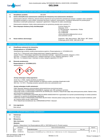 Karta charakterystyki według 1907/2006/WE (REACH), 453/2010/WE, 2015/830/EU GELSAN SEKCJA 1: IDENTYFIKACJA SUBSTANCJI/MIESZANINY I IDENTYFIKACJA SPÓŁKI/PRZEDSIĘBIORSTWA GELSAN 1.1 Identyfikator produktu: 1.2 Istotne zidentyfikowane zastosowania substancji lub mieszaniny oraz zastosowania odradzane: Zastosowanie zalecane: Alkaliczny, pianowo-żelowy preparat do mycia powierzchni zewnętrznych maszyn i urządzeń, ścian i posadzek. Szczególnie przydatny w myciu sufitów, konstrukcji ażurowych, kratownic, przenośników i niewielkich elementów linii produkcyjnych. Stosowany w przemyśle spożywczym, napojowym i gastronomii. Wyłącznie do użytku zawodowego. Zastosowanie odradzane: Każdy rodzaj zastosowania nie wymieniony powyżej oraz w punkcie 7.3 1.3 Dane dotyczące dostawcy karty charakterystyki: Kuchnie Swiata S.A. Slodowiec 10/10 01-708 Warszawa - mazowieckie - Polska Tel.: 818831638 Fax: 818830168 [email protected] www.sanechem.com.pl 1.4 Numer telefonu alarmowego: Pogotowie : 999, Straż pożarna : 998, Policja : 997, Zakład Produkcyjny (8:00-16:00) : (081) 88 30 168 SEKCJA 2: IDENTYFIKACJA ZAGROŻEŃ 2.1 Klasyfikacja substancji lub mieszaniny: Rozporządzenie nr 1272/2008 (CLP): Klasyfikacja tego produktu została przeprowadzona zgodnie z Rozporządzeniem nr 1272/2008 (CLP). Acute Tox. 4: Toksyczność ostra (droga pokarmowa), kategoria zagrożenia 4, H302 Aquatic Chronic 3: Stwarzające zagrożenie dla środowiska wodnego – zagrożenie przewlekłe, kategoria 3, H412 Eye Dam. 1: Poważne uszkodzenie oczu / działanie drażniące na oczy, kategoria zagrożenia 1, H318 Skin Corr. 1A: Działanie żrące / drażniące na skórę, kategoria zagrożenia 1A, H314 2.2 Elementy oznakowania: Rozporządzenie nr 1272/2008 (CLP): Niebezpieczeństwo Zwroty wskazujące rodzaj zagrożenia: Acute Tox. 4: H302 - Działa szkodliwie po połknięciu Aquatic Chronic 3: H412 - Działa szkodliwie na organizmy wodne, powodując długotrwałe skutki Skin Corr. 1A: H314 - Powoduje poważne oparzenia skóry oraz uszkodzenia oczu Zwroty wskazujące środki ostrożności: P280: Stosować rękawice ochronne/odzież ochronną/ochronę oczu/ochronę twarzy P301+P330+P331: W PRZYPADKU POŁKNIĘCIA: wypłukać usta. NIE wywoływać wymiotów P303+P361+P353: W PRZYPADKU KONTATKU ZE SKÓRĄ (lub z włosami): Natychmiast zdjąć całą zanieczyszczoną odzież. Spłukać skórę pod strumieniem wody/prysznicem P304+P340: W PRZYPADKU DOSTANIA SIĘ DO DRÓG ODDECHOWYCH: wyprowadzić lub wynieść poszkodowanego na świeże powietrze i zapewnić mu warunki do swobodnego oddychania P305+P351+P338: W PRZYPADKU DOSTANIA SIĘ DO OCZU: Ostrożnie płukać wodą przez kilka minut. Wyjąć soczewki kontaktowe, jeżeli są i można je łatwo usunąć. Nadal płukać P310: Natychmiast skontaktować się z OŚRODKIEM ZATRUĆ / lekarzem 2.3 Inne zagrożenia: Brak danych SEKCJA 3: SKŁAD/INFORMACJA O SKŁADNIKACH 3.1 Substancje: Nie dotyczy 3.2 Mieszaniny: Opis chemiczny: Mieszanina Składniki: Zgodnie z Załącznikiem II do Rozporządzenia (WE) nr 1907/2006 (punkt 3), Produkt zawiera: Identyfikacja CAS: EC: Index: 1310-58-3 215-181-3 019-002-00-8 Data sporządzenia: 2006-08-16 Aktualizacja: 2016-02-25 Nazwa chemiczna/klasyfikacja wodorotlenek potasu Stężenie Klas. dost. Rozporządzenie 1272/2008 Acute Tox. 4: H302; Met. Corr. 1: H290; Skin Corr. 1A: H314 - Niebezpieczeństwo Strona 1 z 11 10 - <20 % Wersja: 8 (zastępuje 7) Karta charakterystyki według 1907/2006/WE (REACH), 453/2010/WE, 2015/830/EU GELSAN 10 - <20 % Rozporządzenie 1272/2008 Acute Tox. 4: H302; Met. Corr. 1: H290; Skin Corr. 1A: H314 - Niebezpieczeństwo REAC 01-2119487136-33-XXXX CAS: EC: Index: REAC Nie dotyczy 939-625-7 Nie dotyczy 01-2119985168-23-XXXX CAS: EC: Index: REAC 143-18-0 205-590-5 Nie dotyczy Nie dotyczy Oleinian potasu (mydło) CAS: EC: Index: REAC 308062-28-4 931-292-6 Nie dotyczy Aminy, C12-14-alkilodimetyl, n-tlenki 71-23-8 200-746-9 603-003-00-0 Propan-1-ol AlkanoC6-C8(parzyste), kwas 1-sulfonowy, sól sodowa Klas. dost. 5 - <10 % Rozporządzenie 1272/2008 Acute Tox. 4: H302; Eye Irrit. 2: H319; Skin Irrit. 2: H315 - Uwaga Klas. dost. 5 - <10 % Rozporządzenie 1272/2008 Eye Irrit. 2: H319; Skin Irrit. 2: H315 - Uwaga Klas. dost. Acute Tox. 4: H302; Aquatic Acute 1: H400; Aquatic Chronic 2: H411; Eye Dam. 1: H318; Skin Irrit. 2: H315 Rozporządzenie 1272/2008 Niebezpieczeństwo 01-2119490061-47-XXXX CAS: EC: Index: REAC 01-2119486761-29-XXXX CAS: EC: Index: REAC 68002-97-1 500-182-6 Nie dotyczy Nie dotyczy 1 - <5 % ATP CLP00 1 - <5 % Rozporządzenie 1272/2008 Eye Dam. 1: H318; Flam. Liq. 2: H225; STOT SE 3: H336 - Niebezpieczeństwo Alkohole, C10-16, etoksylowane Klas. dost. 1 - <5 % Rozporządzenie 1272/2008 Aquatic Acute 1: H400; Eye Dam. 1: H318 - Niebezpieczeństwo Więcej informacji nt. zagrożeń stwarzanych przez substancje – patrz sekcja 8, 11, 12, 15 i 16 SEKCJA 4: ŚRODKI PIERWSZEJ POMOCY 4.1 Opis środków pierwszej pomocy: Natychmiast wezwać lekarza i pokazać mu Kartę Charakterystyki produktu. Przez wdychanie: Produkt nie został sklasyfikowany jako niebezpieczny w przypadku jego wdychania, ale pomimo to w razie stwierdzenia objawów zatrucia zaleca się usunąć poszkodowanego z miejsca narażenia oraz zapewnić mu dostęp świeżego powietrza i spokój. Jeżeli objawy nie ustąpią, należy wezwać pomoc lekarską. Przez kontakt ze skórą: Zdjąć zanieczyszczone ubranie i buty, oczyścić skórę lub umyć poszkodowanego mydłem naturalnym , spłukując obficie zimną wodą. W przypadku poważnych dolegliwości należy się udać do lekarza. Jeżeli mieszanka spowodowała oparzenia lub odmrożenia, nie wolno zdejmować ubrania z poszkodowanego, gdyż w sytuacji, gdy ubranie jest przylepione do skóry może to spowodować jeszcze większe obrażenia. Jeśli na skórze pojawią się pęcherze, nie wolno ich przekłuwać, ponieważ może to zwiększyć ryzyko infekcji. Przez kontakt z oczami: Obficie płukać oczy 