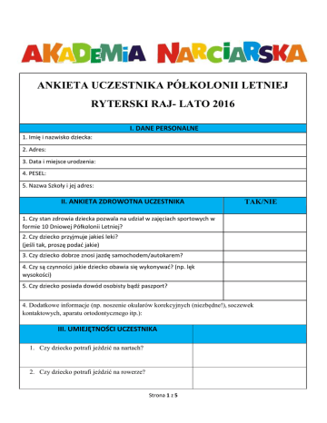 ANKIETA UCZESTNIKA PÓŁKOLONII LETNIEJ RYTERSKI RAJ- LATO 2016 I. DANE PERSONALNE 1. Imię i nazwisko dziecka: 2. Adres: 3. Data i miejsce urodzenia: 4. PESEL: 5. Nazwa Szkoły i jej adres: II. ANKIETA ZDROWOTNA UCZESTNIKA TAK/NIE 1. Czy stan zdrowia dziecka pozwala na udział w zajęciach sportowych w formie 10 Dniowej Półkolonii Letniej? 2. Czy dziecko przyjmuje jakieś leki? (jeśli tak, proszę podać jakie) 3. Czy dziecko dobrze znosi jazdę samochodem/autokarem? 4. Czy są czynności jakie dziecko obawia się wykonywać? (np. lęk wysokości) 5. Czy dziecko posiada dowód osobisty bądź paszport? 4. Dodatkowe informacje (np. noszenie okularów korekcyjnych (niezbędne!), soczewek kontaktowych, aparatu ortodontycznego itp.): III. UMIEJĘTNOŚCI UCZESTNIKA 1. Czy dziecko potrafi jeździć na nartach? 2. Czy dziecko potrafi jeździć na rowerze? Strona 1 z 5 3. Czy dziecko potrafi pływać? IV. DODATKOWE INFORMACJE O UCZESTNIKU Czy dziecko posiada własny sprzęt sportowy: rower, kask rowerowy, łyżworolki (proszę podkreślić posiadany sprzęt) Wzrost: Rozmiar buta: V. INFORMACJE O RODZICACH/OPIEKUNACH 1. Imię i nazwisko: 2. Telefon kontaktowy: (zawsze dostępny!) 3. Adres e-mail: VI. PROSZĘ ZAKREŚLIĆ WYBRANY TURNUS I TURNUS: 27.06-08.07.2016 II TURNUS: 11.07-22.07.2016 III TURNUS: 25.07-05.08.2016 IV TURNUS: 08.08-19.08.2016 27.08.2016- Uroczyste zakończenie półkolonii. Jeśli życzą sobie Państwo, aby dziecko uczestniczyło w zajęciach z konkretnym dzieckiem/rodzeństwem, kolegą lub koleżanką proszę podać imię i nazwisko tej osoby (Możliwe tylko w przypadku podobnego poziomu umiejętności) Zabawa dla wszystkich uczestników półkolonii. ……………………………………………………………… data i podpis Rodzica/Opiekuna) Strona 2 z 5 OŚWIADCZENIA RODZICÓW/OPIEKUNÓW Wyrażam/nie wyrażam zgodę* na bezpłatne używanie zdjęć z podobizną mojego syna/córki* w materiałach reklamowych: Stacji narciarskiej Ryterski Raj w Rytrze i Szkoły Narciarskiej Ryter‐SKI w Rytrze. Wyrażam/nie wyrażam zgodę* na udział mojego syna/córki* w zajęciach rekreacyjno‐sportowych. Oświadczam, że znam Regulamin Akademii Narciarskiej i zobowiązuję się do jego przestrzegania. *niewłaściwe skreślić Data: …………………………….. Czytelny podpis Rodziców/Opiekunów: …………………………………………………………………… Strona 3 z 5 NIEZBĘDNIK PÓŁKOLONISTY Prosimy o zaopatrzenie Uczestnika w wymieniony poniżej ekwipunek, który na czas półkolonii zalecany jest do pozostawienia w depozycie szatni, a niezbędny do codziennego funkcjonowania podczas trwania turnusu. • kask rowerowy, • skarpety narciarskie, • peleryna bądź kurtka przeciwdeszczowa, • ciepła bluza, • strój kąpielowy (obowiązkowo czepek!!, przybory do mycia, ręcznik), • buty sportowe (na zmianę, np. adidasy, trekkingowe), • czapka, bądź apaszka chroniąca przed słońcem, • dowód osobisty/paszport. Uwaga: w pierwszym dniu rozpoczęcia turnusu, tj. poniedziałek, po przymiarce sprzętu sportowego, zostanie wystosowana informacja z prośbą o ewentualne udostępnienie na czas półkolonii roweru dla Uczestnika. Zalecane jest także, jeśli dziecko posiada, aby na czas trwania półkolonii zabrało ze sobą własne łyżworolki i ochraniacze. PROSIMY O DBANIE, ABY UCZESTNIK KAŻDEGO DNIA MIAŁ UBRANIE DOSTOSOWANE ADEKWATNIE DO PANUJĄCEJ AURY POGODOWEJ. Ubrania mają dawać poczucie komfortu a nie ograniczać aktywność ruchową dziecka. Niewygodne, nowe czy niedostosowane do charakteru zajęć ubrania i buty często nie są używane przez dzieci, a bywa i tak, że w przypadku zgubienia, dzieci nie rozpoznają ich jako własne. Strona 4 z 5 Lepiej spakować używanie rzeczy, których w razie zniszczenia lub pobrudzenia nie będzie Państwu szkoda – podczas zajęć dzieci angażują się w zadania, a nie zwracają uwagi na wartość ubrań, co może spowodować, że rzeczy zostaną nieodwracalnie zniszczone lub pobrudzone trawą, farbami czy błotem których nie da się sprać. PODCZAS ZAJĘĆ OBOWIĄZUJE OBUWIE I STRÓJ SPORTOWY!! Informacje dotyczące zapisu i opłaty za półkolonię: Zgłoszenia na półkolonię przyjmowane są do wyczerpania miejsc. Zgłoszenia przyjmowane są poprzez wypełnienie formularza zgłoszeniowego i odesłanie go na adres e‐mail: biuro@akademia narciarska.pl , bądź złożenie go bezpośrednio w biurze szkoły narciarskiej Ryter‐SKI w Rytrze. Cena półkolonii wynosi 650 zł. W cenę wliczony jest program półkolonii, wyżywienie, transport, ubezpieczenie oraz opieka wykwalifikowanych opiekunów. Warunkiem zapisu na półkolonię jest wypełnienie formularza zgłoszeniowego i wpłata zaliczki w wysokości 350 zł na konto: Fundacja Żyj Aktywnie ul. Królowej Jadwigi 34 33300 Nowy Sącz Nr konta: Bank BGŻ 33 203000451110000003049870 Tytułem: zaliczka/turnus/imię i nazwisko dziecka Pozostałą kwotę należy wpłacić najpóźniej na 3 dni przed datą rozpoczęcia turnusu. Do uczestnictwa w zajęciach niezbędne jest wypełnienie Ankiety uczestnika, która po zakwalifikowaniu Uczestnika zostanie przesłana na wskazany adres mailowy. Podpis rodziców: Strona 5 z 5