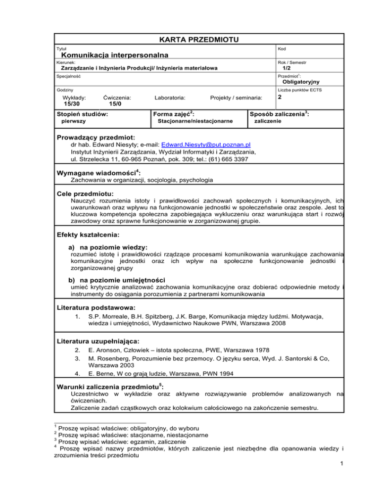 KARTA PRZEDMIOTU Komunikacja interpersonalna