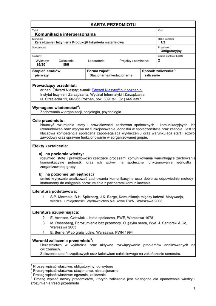 KARTA PRZEDMIOTU Tytuł Kod Komunikacja interpersonalna Kierunek: Rok / Semestr Zarządzanie i Inżynieria Produkcji/ Inżynieria materiałowa 1/2 1 Specjalność Przedmiot : Obligatoryjny Godziny Liczba punktów ECTS Wykłady: Ćwiczenia: 15/30 Laboratoria: Projekty / seminaria: 2 15/0 Stopień studiów: pierwszy 2 Forma zajęć : Stacjonarne/niestacjonarne 3 Sposób zaliczenia : zaliczenie Prowadzący przedmiot: dr hab. Edward Niesyty; e-mail: [email protected] Instytut Inżynierii Zarządzania, Wydział Informatyki i Zarządzania, ul. Strzelecka 11, 60-965 Poznań, pok. 309; tel.: (61) 665 3397 Wymagane wiadomości4: Zachowania w organizacji, socjologia, psychologia Cele przedmiotu: Nauczyć rozumienia istoty i prawidłowości zachowań społecznych i komunikacyjnych, ich uwarunkowań oraz wpływu na funkcjonowanie jednostki w społeczeństwie oraz zespole. Jest to kluczowa kompetencja społeczna zapobiegająca wykluczeniu oraz warunkująca start i rozwój zawodowy oraz sprawne funkcjonowanie w zorganizowanej grupie. Efekty kształcenia: a) na poziomie wiedzy: rozumieć istotę i prawidłowości rządzące procesami komunikowania warunkujące zachowania komunikacyjne jednostki oraz ich wpływ na społeczne funkcjonowanie jednostki i zorganizowanej grupy b) na poziomie umiejętności umieć krytycznie analizować zachowania komunikacyjne oraz dobierać odpowiednie metody i instrumenty do osiągania porozumienia z partnerami komunikowania Literatura podstawowa: 1. S.P. Morreale, B.H. Spitzberg, J.K. Barge, Komunikacja między ludźmi. Motywacja, wiedza i umiejętności, Wydawnictwo Naukowe PWN, Warszawa 2008 Literatura uzupełniająca: 2. 3. 4. E. Aronson, Człowiek – istota społeczna, PWE, Warszawa 1978 M. Rosenberg, Porozumienie bez przemocy. O języku serca, Wyd. J. Santorski & Co, Warszawa 2003 E. Berne, W co grają ludzie, Warszawa, PWN 1994 Warunki zaliczenia przedmiotu5: Uczestnictwo w wykładzie oraz aktywne rozwiązywanie problemów analizowanych na ćwiczeniach. Zaliczenie zadań cząstkowych oraz kolokwium całościowego na zakończenie semestru. 1 Proszę wpisać właściwe: obligatoryjny, do wyboru Proszę wpisać właściwe: stacjonarne, niestacjonarne 3 Proszę wpisać właściwe: egzamin, zaliczenie 4 Proszę wpisać nazwy przedmiotów, których zaliczenie jest niezbędne dla opanowania wiedzy i zrozumienia treści przedmiotu 1 2 Program zajęć 5 Lp. Problematyka ogólna Zagadnienia szczegółowe 1. Wprowadzenie do komunikowania 2. Podmiot w komunikowaniu 3. Percepcja słuchanie 4. Komunikaty werbalne niewerbalne Komunikowanie, jego funkcje. Model komunikacji. Kontekst komunikacji. Nadawca, odbiorca, kodowanie, dekodowanie. Przesłania i kanały komunikacyjne. Oddziaływanie i przygotowanie terenu. Zakłócenia. Efekty. Kompetencje komunikacyjne. Świadomość siebie. Poczucie własnej wartości. Jego wpływ na stosunek do innego i proces komunikowania. Otwieranie się. Granice otwarcia. Etapy i formy percepcji. Wpływ uprzedzeń i stereotypów na komunikowanie. Krytycyzm percepcji. Aktywne słuchanie i odpowiadanie. Jego przeszkody. Dialog. Język jako system znaczący. Język a myślenie. Warunki skutecznego porozumiewania się. Bariery konwersacji. Formy i rola komunikacji niewerbalnej w porozumiewaniu. Ruchy ciała, mimika, ruchy oczu, znaczenie przestrzeni, terytorium, dotyk i czas. Warunki skutecznej komunikacji interpersonalnej. Postawy, wiedza i umiejętności porozumiewania się. Nieporozumienia i konflikty. Radzenie sobie z konfliktem. Komunikacja bez przemocy. Warunki, strategie i techniki negocjacji. Umiejętności negocjacyjne. Rozpoznawanie strategii i zachowań kontrahentów. Techniki negocjowania. Zasady etyczne w negocjacjach. Nawiązywanie i kształtowanie oraz podtrzymywanie więzi międzyludzkich. Zaburzenia więzi międzyludzkich. Zerwanie i odbudowa więzi międzyludzkich. Typy spotkań. Spotkania zawodowe. Pytania i odpowiedzi. Dyskryminacja. Możliwe strategie. Zarządzanie spotkaniem. Typy grup społecznych. Dynamika grupy. Budowania zespołu. Typy ról i ich podział w grupie. Władza. Typy władzy. Przywództwo. Rola przywódcy w grupie. Style przywództwa. Menedżer (przywódca) sytuacyjny. Interakcje. Korzyści z pracy zespołowej. Typy zadań i organizacji zespołu. Rozwiązywanie problemów rutynowych i poszukiwanie nowych rozwiązań. Tekst i jego specyfika. Rola paragrafu w wypowiedzi pisemnej. Organizacja paragrafu. Paragraf informacyjny i perswazyjny. Budowanie paragrafu. Idea wiodąca, argumenty, przykłady. Tworzenie planu. Układ idei w tekście. Dobór planu. Typy planów: dedukcyjne, sukcesywne. Wprowadzenie, konkluzje. Organizacja części. Poprawność gramatyczna i ortograficzna oraz składniowa. Styl. Figury stylistyczne. Wprowadzanie cytatów. Formy graficzne. Ilustracje. Zwięzłość. Obiektywność. Spójność. Specyfika komunikacji publicznej. Przygotowanie wypowiedzi. Wypowiedź informacyjna a perswazyjna. Typy dyskursu, analiza argumentacji. Odwołania psychologiczne. Wiarygodność. Formy wystąpień publicznych: wykład, prezentacja, prowadzenie zebrania, zabieranie głosu w dyskusji. Przygotowanie siebie. Trema i lęk. Przemawianie na żywo. Budowa zdań. Przejścia. Sztuka prezentowania. Głos, zachowania. Powtórzenia. Ocena wypowiedzi. Techniczne środki prezentacji. i i 5. Porozumiewanie, negocjowanie, dyskurs instytucjonalny 6. Rozmowa a więzi międzyludzkie 7. Grupa i role w grupie 8. Metody i techniki pracy zespołowej 9. Komunikowanie tekstem 10. Komunikowanie publiczne i prezentowanie Proszę wpisać wymagania formalne uszczegóławiając sposób zaliczenia przedmiotu (np. zasady usprawiedliwiania nieobecności na zajęciach, liczba kolokwiów, sposób obliczania oceny końcowej, przykładowe pytania, itp.) 2