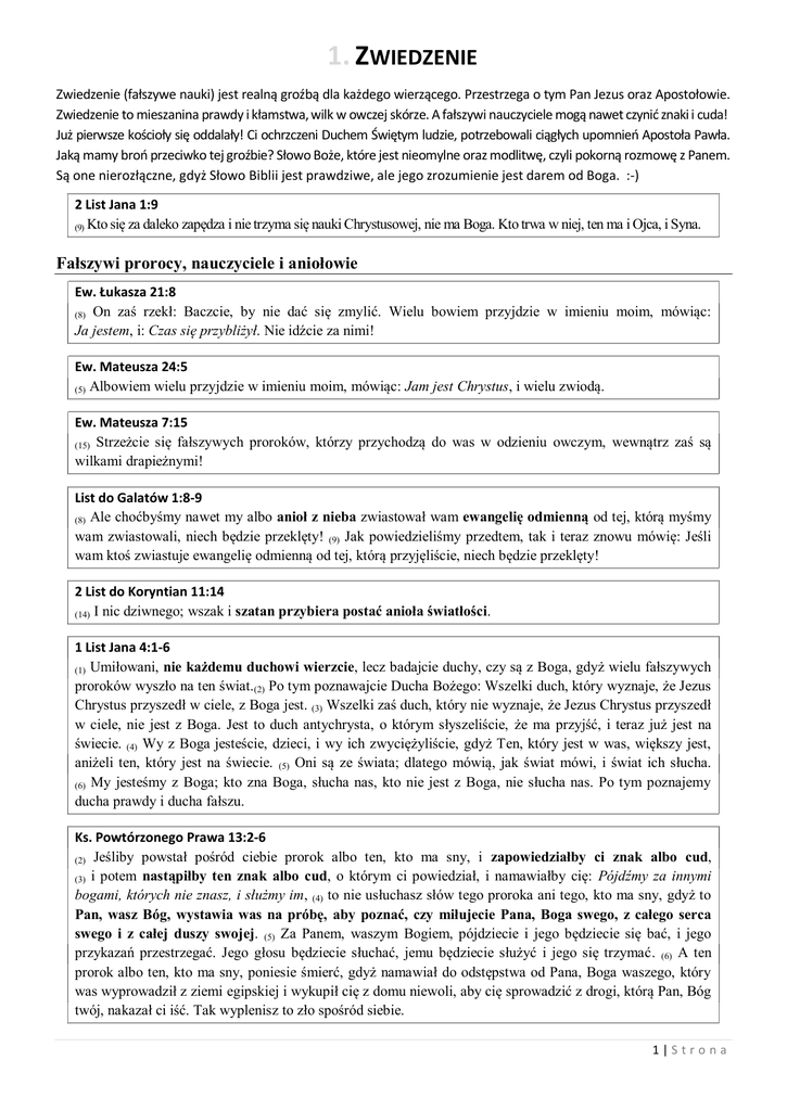 1. ZWIEDZENIE Zwiedzenie (fałszywe nauki) jest realną groźbą dla każdego wierzącego. Przestrzega o tym Pan Jezus oraz Apostołowie. Zwiedzenie to mieszanina prawdy i kłamstwa, wilk w owczej skórze. A fałszywi nauczyciele mogą nawet czynid znaki i cuda! Już pierwsze kościoły się oddalały! Ci ochrzczeni Duchem Świętym ludzie, potrzebowali ciągłych upomnieo Apostoła Pawła. Jaką mamy broo przeciwko tej groźbie? Słowo Boże, które jest nieomylne oraz modlitwę, czyli pokorną rozmowę z Panem. Są one nierozłączne, gdyż Słowo Biblii jest prawdziwe, ale jego zrozumienie jest darem od Boga. :-) 2 List Jana 1:9 (9) Kto się za daleko zapędza i nie trzyma się nauki Chrystusowej, nie ma Boga. Kto trwa w niej, ten ma i Ojca, i Syna. Fałszywi prorocy, nauczyciele i aniołowie Ew. Łukasza 21:8 (8) On zaś rzekł: Baczcie, by nie dać się zmylić. Wielu bowiem przyjdzie w imieniu moim, mówiąc: Ja jestem, i: Czas się przybliżył. Nie idźcie za nimi! Ew. Mateusza 24:5 (5) Albowiem wielu przyjdzie w imieniu moim, mówiąc: Jam jest Chrystus, i wielu zwiodą. Ew. Mateusza 7:15 (15) Strzeżcie się fałszywych proroków, którzy przychodzą do was w odzieniu owczym, wewnątrz zaś są wilkami drapieżnymi! List do Galatów 1:8-9 (8) Ale choćbyśmy nawet my albo anioł z nieba zwiastował wam ewangelię odmienną od tej, którą myśmy wam zwiastowali, niech będzie przeklęty! (9) Jak powiedzieliśmy przedtem, tak i teraz znowu mówię: Jeśli wam ktoś zwiastuje ewangelię odmienną od tej, którą przyjęliście, niech będzie przeklęty! 2 List do Koryntian 11:14 (14) I nic dziwnego; wszak i szatan przybiera postać anioła światłości. 1 List Jana 4:1-6 (1) Umiłowani, nie każdemu duchowi wierzcie, lecz badajcie duchy, czy są z Boga, gdyż wielu fałszywych proroków wyszło na ten świat.(2) Po tym poznawajcie Ducha Bożego: Wszelki duch, który wyznaje, że Jezus Chrystus przyszedł w ciele, z Boga jest. (3) Wszelki zaś duch, który nie wyznaje, że Jezus Chrystus przyszedł w ciele, nie jest z Boga. Jest to duch antychrysta, o którym słyszeliście, że ma przyjść, i teraz już jest na świecie. (4) Wy z Boga jesteście, dzieci, i wy ich zwyciężyliście, gdyż Ten, który jest w was, większy jest, aniżeli ten, który jest na świecie. (5) Oni są ze świata; dlatego mówią, jak świat mówi, i świat ich słucha. (6) My jesteśmy z Boga; kto zna Boga, słucha nas, kto nie jest z Boga, nie słucha nas. Po tym poznajemy ducha prawdy i ducha fałszu. Ks. Powtórzonego Prawa 13:2-6 (2) Jeśliby powstał pośród ciebie prorok albo ten, kto ma sny, i zapowiedziałby ci znak albo cud, (3) i potem nastąpiłby ten znak albo cud, o którym ci powiedział, i namawiałby cię: Pójdźmy za innymi bogami, których nie znasz, i służmy im, (4) to nie usłuchasz słów tego proroka ani tego, kto ma sny, gdyż to Pan, wasz Bóg, wystawia was na próbę, aby poznać, czy miłujecie Pana, Boga swego, z całego serca swego i z całej duszy swojej. (5) Za Panem, waszym Bogiem, pójdziecie i jego będziecie się bać, i jego przykazań przestrzegać. Jego głosu będziecie słuchać, jemu będziecie służyć i jego się trzymać. (6) A ten prorok albo ten, kto ma sny, poniesie śmierć, gdyż namawiał do odstępstwa od Pana, Boga waszego, który was wyprowadził z ziemi egipskiej i wykupił cię z domu niewoli, aby cię sprowadzić z drogi, którą Pan, Bóg twój, nakazał ci iść. Tak wyplenisz to zło spośród siebie. 1|S tro na Zwiedzenie dotyczy wierzących Chrześcijan Ew. Mateusza 7:21-23 (21) Nie każdy, kto do mnie mówi: Panie, Panie, wejdzie do Królestwa Niebios; lecz tylko ten, kto pełni wolę Ojca mojego, który jest w niebie. (22) W owym dniu wielu mi powie: Panie, Panie, czyż nie prorokowaliśmy w imieniu twoim i w imieniu twoim nie wypędzaliśmy demonów, i w imieniu twoim nie czyniliśmy wielu cudów? (23) A wtedy im powiem: Nigdy was nie znałem. Idźcie precz ode mnie wy, którzy czynicie bezprawie. Ew. Mateusza 24:24 (24) Powstaną bowiem fałszywi mesjasze i fałszywi prorocy i czynić będą wielkie znaki i cuda, aby, o ile można, zwieść i wybranych. Ew. Łukasza 13:24 (24) Starajcie się wejść przez wąską bramę, gdyż wielu, powiadam wam, będzie chciało wejść, ale nie będą mogli. Dzieje Apostolskie 20:29-31 (29) Ja wiem, że po odejściu moim wejdą między was wilki drapieżne, nie oszczędzając trzody, (30) nawet spomiędzy was samych powstaną mężowie, mówiący rzeczy przewrotne, aby uczniów pociągnąć za sobą. (31) Przeto czuwajcie, pamiętając, że przez trzy lata we dnie i w nocy nie przestawałem ze łzami napominać każdego z was. Filozofia, mądrość ludzka i baśnie 1 Tymoteusza 6:20-21 (20) Tymoteuszu! Strzeż tego, co ci powierzono, unikaj pospolitej, pustej mowy i sprzecznych twierdzeń, błędnej, rzekomej nauki, (21) do której niejeden przystał i od wiary odpadł. Łaska niech będzie z wami. Amen. 2 Tymoteusza 2:14-18 (14) To przypominaj, zaklinając ich przed Bogiem, aby się nie wdawali w spory o słowa, bo to jest bezużyteczne, a tylko słuchaczy do zguby przywodzi. (15) Staraj się usilnie o to, abyś mógł stanąć przed Bogiem jako wypróbowany i nienaganny pracownik, który wykłada należycie słowo prawdy. (16) A pospolitej, pustej mowy unikaj, bo ci, którzy się nią posługują, będą się pogrążali w coraz większą bezbożność, (17) a nauka ich szerzyć się będzie jak zgorzel; do nich należy Hymeneusz i Filetos, (18) którzy z drogi prawdy zboczyli, powiadając, że zmartwychwstanie już się dokonało, przez co podważają wiarę niektórych. List do Kolosan 2:4,8 (4) A to mówię, aby was nikt nie zwodził rzekomo słusznymi wywodami. (8) Baczcie, aby was kto nie sprowadził na manowce filozofią i czczym urojeniem, opartym na podaniach ludzkich i na żywiołach świata, a nie na Chrystusie Objawienie 16:13-14 (13) I widziałem trzy duchy nieczyste jakby żaby wychod