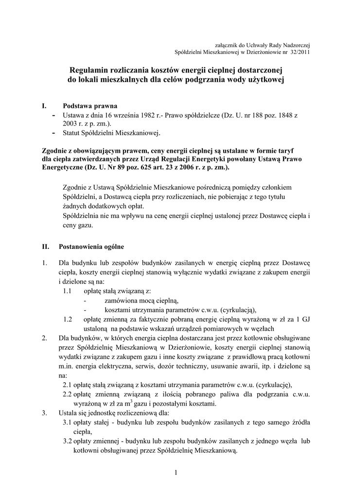 załącznik do Uchwały Rady Nadzorczej Spółdzielni Mieszkaniowej w Dzierżoniowie nr 32/2011 Regulamin rozliczania kosztów energii cieplnej dostarczonej do lokali mieszkalnych dla celów podgrzania wody użytkowej I. - Podstawa prawna Ustawa z dnia 16 września 1982 r.- Prawo spółdzielcze (Dz. U. nr 188 poz. 1848 z 2003 r. z p. zm.). Statut Spółdzielni Mieszkaniowej. Zgodnie z obowiązującym prawem, ceny energii cieplnej są ustalane w formie taryf dla ciepła zatwierdzanych przez Urząd Regulacji Energetyki powołany Ustawą Prawo Energetyczne (Dz. U. Nr 89 poz. 625 art. 23 z 2006 r. z p. zm.). Zgodnie z Ustawą Spółdzielnie Mieszkaniowe pośredniczą pomiędzy członkiem Spółdzielni, a Dostawcą ciepła przy rozliczeniach, nie pobierając z tego tytułu żadnych dodatkowych opłat. Spółdzielnia nie ma wpływu na cenę energii cieplnej ustalonej przez Dostawcę ciepła i ceny gazu. II. Postanowienia ogólne 1. Dla budynku lub zespołów budynków zasilanych w energię cieplną przez Dostawcę ciepła, koszty energii cieplnej stanowią wyłącznie wydatki związane z zakupem energii i dzielone są na: 1.1 opłatę stałą związaną z: zamówiona mocą cieplną, kosztami utrzymania parametrów c.w.u. (cyrkulacją), 1.2 opłatę zmienną za faktycznie pobraną energię cieplną wyrażoną w zł za 1 GJ ustaloną na podstawie wskazań urządzeń pomiarowych w węzłach Dla budynków, w których energia cieplna dostarczana jest przez kotłownie obsługiwane przez Spółdzielnię Mieszkaniową w Dzierżoniowie, koszty energii cieplnej stanowią wydatki związane z zakupem gazu i inne koszty związane z prawidłową pracą kotłowni m.in. energia elektryczna, serwis, dozór techniczny, usuwanie awarii, itp. i dzielone są na: 2.1 opłatę stałą związaną z kosztami utrzymania parametrów c.w.u. (cyrkulację), 2.2 opłatę zmienną związaną z ilością pobranego paliwa dla podgrzania c.w.u. wyrażoną w zł za m3 gazu i pozostałymi kosztami. Ustala się jednostkę rozliczeniową dla: 3.1 opłaty stałej - budynku lub zespołu budynków zasilanych z tego samego źródła ciepła, 3.2 opłaty zmiennej - budynku lub zespołu budynków zasilanych z jednego węzła lub kotłowni obsługiwanej przez Spółdzielnię Mieszkaniową. 2. 3. 1 4. Jednostka rozliczeniowa składa się z: 4.1 opłaty stałej - wyrażonej w zł na lokal mieszkalny, 4.2 opłaty zmiennej - wyrażonej w zł za koszt podgrzania 1 m3 wody. III. Opłaty na pokrycie kosztów ciepłej wody użytkowej 1. Za dostarczone ciepło do podgrzania wody użytkowej wnoszone są zaliczki miesięczne na poczet pokrycia całkowitych kosztów podgrzania wody. Podlegają one ostatecznemu rozliczeniu po zakończeniu okresu rozliczeniowego. Spółdzielnia pobiera opłaty stałe i zaliczki: 1.1 Dla budynku lub zespołów budynków zasilanych w energię cieplną przez Dostawcę ciepła, opłata na pokrycie kosztów stałych przypadająca na lokal obliczana jest następująco: kwota kosztów za moc zamówioną przypadająca na dany budynek lub zespół budynków dzielona jest przez ilość lokali mieszkalnych w budynku lub zespole budynków, koszty utrzymania parametrów c.w.u. (cyrkulacja) stanowią do 30% kosztów całkowitych podgrzania wody w danym budynku lub zespole budynków. Suma tych dwóch kosztów daje kwotę opłaty stałej przypadającą na lokal mieszkalny. 1.2 Dla budynków, w których energia cieplna dostarczana jest przez kotłownie obsługiwane przez Spółdzielnię Mieszkaniową w Dzierżoniowie, opłata na pokrycie kosztów stałych (cyrkulacji) stanowi do 40% kosztów całkowitych podgrzania wody i ustalona jest dla każdego budynku indywidualnie. 1.3 Opłata stała nie podlega rozliczeniu z użytkownikami. Opłata ta pomniejsza całkowite koszty energii cieplnej dla celów podgrzania wody. Zaliczki na pokrycie kosztów zmiennych ustalone są jako iloczyn m3 zużytej wody w lokalu i kosztu podgrzania 1m3 wody za poprzednie okresy rozliczeniowe. 2. IV. Rozliczanie kosztów cieplej wody użytkowej 1. Rozliczenie kosztów zmiennych na podgrzanie wody przypadające na lokal ustala się według wzoru: e = [(a – b) : c] x d gdzie: a- koszt całkowity energii cieplnej na potrzeby podgrzania wody dla budynku lub zespołu budynków, b- opłata stała, c- suma m3 zużytej wody do podgrzania w budynku lub zespole budynków, d- ilość zużytej wody w m3 w lokalu, e- koszt podgrzania wody. 2. Rozliczenie kosztów i zaliczek następuje według wzoru: g=e-f gdzie: 2 e- koszt podgrzania wody przypadający na lokal, f- wniesiona zaliczka, g- różnica między kosztami, a wniesionymi zaliczkami. V. Postanowienia końcowe 1. Ustalone w wyniku rozliczenia; - nadpłaty - powstałe w wyniku rozliczenia będą zaliczane na poczet przyszłych opłat za lokal lub pokrycie zaległości w opłatach, jeśli takie występują. Na pisemny wniosek lokatora nadpłata może być przekazana na wskazane konto po potrąceniu kosztów wypłaty tj. prowizja dla banku. - niedopłata- powstała w wyniku rozliczenia należy uregulować w terminie podanym na dokumencie rozliczeniowym. W uzasadnionych przypadkach Zarząd na pisemną prośbę zainteresowanego może kwotę niedoboru rozłożyć na raty. Od zaległości w opłatach naliczane będą odsetki ustawowe. 2. Traci moc Regulamin rozliczania kosztów energii cieplnej dostarczonej do lokali mieszkalnych dla celów centralnego ogrzewania i ciepłej wody użytkowej, wprowadzony Uchwałą nr 2/2010. 3. Regulamin wchodzi w życie z dniem podjęcia, za wyjątkiem budynków na Os. Tęczowym zasilanych w energię cieplną przez zewnętrznego dostawcę ciepła, w stosunku do których Uchwała wchodzi w życie z dniem 1.01.2012 r. Sekretarz Rady Przewodniczący Rady Nadzorczej Maria Koza Andrzej Błaszkiewicz 3