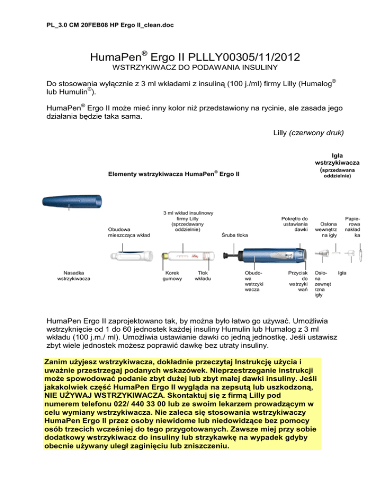 PL_3.0 CM 20FEB08 HP Ergo II_clean.doc HumaPen® Ergo II PLLLY00305/11/2012 WSTRZYKIWACZ DO PODAWANIA INSULINY Do stosowania wyłącznie z 3 ml wkładami z insuliną (100 j./ml) firmy Lilly (Humalog® lub Humulin®). HumaPen® Ergo II może mieć inny kolor niż przedstawiony na rycinie, ale zasada jego działania będzie taka sama. Lilly (czerwony druk) Igła wstrzykiwacza (sprzedawana ® Elementy wstrzykiwacza HumaPen Ergo II Obudowa mieszcząca wkład Nasadka wstrzykiwacza oddzielnie) 3 ml wkład insulinowy firmy Lilly (sprzedawany oddzielnie) Pokrętło do ustawiania dawki Śruba tłoka Korek gumowy Tłok wkładu Obudowa wstrzyki wacza Przycisk do wstrzyki wań Osłona wewnętrz na igły Osłona zewnęt rzna igły HumaPen Ergo II zaprojektowano tak, by można było łatwo go używać. Umożliwia wstrzyknięcie od 1 do 60 jednostek każdej insuliny Humulin lub Humalog z 3 ml wkładu (100 j.m./ ml). Umożliwia ustawianie dawki co jedną jednostkę. Jeśli ustawisz zbyt wiele jednostek możesz poprawić dawkę bez utraty insuliny. Zanim użyjesz wstrzykiwacza, dokładnie przeczytaj Instrukcję użycia i uważnie przestrzegaj podanych wskazówek. Nieprzestrzeganie instrukcji może spowodować podanie zbyt dużej lub zbyt małej dawki insuliny. Jeśli jakakolwiek część HumaPen Ergo II wygląda na zepsutą lub uszkodzoną, NIE UŻYWAJ WSTRZYKIWACZA. Skontaktuj się z firmą Lilly pod numerem telefonu 022/ 440 33 00 lub ze swoim lekarzem prowadzącym w celu wymiany wstrzykiwacza. Nie zaleca się stosowania wstrzykiwaczy HumaPen Ergo II przez osoby niewidome lub niedowidzące bez pomocy osób trzecich wcześniej do tego przygotowanych. Zawsze miej przy sobie dodatkowy wstrzykiwacz do insuliny lub strzykawkę na wypadek gdyby obecnie używany uległ zaginięciu lub zniszczeniu. Papierowa nakład ka Igła PL_3.0 CM 20FEB08 HP Ergo II_clean.doc 1 UMIESZCZENIE WKŁADU Z INSULINĄ WE WSTRZYKIWACZU Ważne uwagi Lekarz prowadzący zalecił najbardziej odpowiedni typ insuliny. Każda zmiana insuliny powinna zostać przeprowadzona pod nadzorem medycznym. HumaPen Ergo II jest przeznaczony do stosowania wyłącznie z 3 ml wkładami z insuliną firmy Lilly (Humalog® lub Humulin®). Nie stosuj wkładów insulinowych innych firm. Zapoznaj się i przestrzegaj zaleceń zawartych w ulotce dla pacjenta dołączonej do 3 ml wkładów insulinowych Humulin lub Humalog. Przed każdym wstrzyknięciem insuliny przeczytaj etykietkę na wkładzie i upewnij się, że wstrzykiwacz zawiera właściwy 3 ml wkład insuliny Humulin lub Humalog. Kolor wstrzykiwacza nie ma związku z typem insuliny. Aby uzyskać więcej informacji na temat HumaPen Ergo II oraz insulin Humulin i Humalog zapraszamy na naszą stronę internetową www.lilly.pl Często zadawane pytania dotyczące umieszczania wkładów insulinowych we wstrzykiwaczu 1. Dlaczego śruba tłoka nie wysuwa się, kiedy we wstrzykiwaczu nie ma wkładu? Śruba tłoka nie może wysunąć się podczas wciskania przycisku do wstrzykiwań, jeśli we wstrzykiwaczu nie ma wkładu. Ta cecha wstrzykiwacza umożliwia łatwe wciskanie śruby tłoka do wstrzykiwacza podczas wymiany wkładu. Gdy tylko wkład zostanie umieszczony we wstrzykiwaczu, śruba tłoka wysunie się po wciśnięciu przycisku do wstrzykiwań. 2. Co należy zrobić, jeśli nie mogę połączyć obudowy mieszczącej wkład z obudową wstrzykiwacza? Sprawdź czy wkład insulinowy jest całkowicie włożony do obudowy. Następnie uważnie dopasuj obudowę mieszczącą wkład z obudową wstrzykiwacza i mocno skręć. 2 PRZYGOTOWANIE WSTRZYKIWACZA (PRZED KAŻDYM WSTRZYKNIĘCIEM) Ważne uwagi HumaPen Ergo II jest przystosowany do stosowania z igłami do wstrzykiwaczy firmy Becton, Dickinson and Company Nie pożyczaj wstrzykiwacza, nie stosuj zużytych igieł Zalecenia dotyczące postępowania z igłą nie mają na celu zastąpienia obowiązujących lokalnie procedur lub zaleceń lekarza prowadzącego. PL_3.0 CM 20FEB08 HP Ergo II_clean.doc Używaj nowej igły do każdego wstrzyknięcia. Pomaga to zapewnić jałowość. Pomaga to także zabezpieczyć przed wyciekiem insuliny, przedostawaniem się pęcherzyków powietrza i zapchaniem igły. Często zadawane pytania dotyczące przygotowania wstrzykiwacza 1. Dlaczego ważne jest przygotowanie wstrzykiwacza przed każdym wstrzyknięciem? Jeśli NIE przygotujesz wstrzykiwacza możesz wstrzyknąć za dużo lub za mało insuliny. Przygotowanie wstrzykiwacza pomaga upewnić się, że wstrzykiwacz i igła działają prawidłowo. Kiedy wstrzykiwacz jest właściwie przygotowany, insulina wypływa z igły strumieniem. Może być potrzebne kilkakrotne przygotowanie wstrzykiwacza zanim zobaczysz strumień insuliny. 2. Dlaczego po umieszczeniu nowego wkładu przygotowanie wstrzykiwacza może wymagać kilku prób? Pomiędzy śrubą tłoka a tłokiem wkładu może znajdować się odstęp. Powtarzanie kroków przygotowania wstrzykiwacza spowoduje wysunięcie śruby tłoka do styku z tłokiem wkładu. Gdy koniec śruby tłoka popchnie tłok wkładu, insulina zacznie wypływać z igły. Przed przygotowaniem Tłok wkładu - Odstęp Śruba tłoka Po przygotowaniu Brak odstępu pomiędzy śrubą a tłokiem wkładu Powtarzaj kroki przygotowania wstrzykiwacza, aż zobaczysz strumień insuliny; Jeśli nadal nie widzisz strumienia insuliny wypływającego z igły, przejdź do pytania 3. 3. Dlaczego powinienem przygotowywać wstrzykiwacz do uzyskania strumienia insuliny i dlaczego wstrzykiwacz nie jest gotowy do użytku jeśli widzę kroplę insuliny na końcu igły? Przygotowanie wstrzykiwacza doprowadza śrubę tłoka do styku z tłokiem wkładu i usuwa powietrze z wkładu. Podczas przygotowania wstrzykiwacza: - możesz zobaczyć kroplę insuliny na końcu igły, kiedy zakładasz ją po raz pierwszy. Oznacza to, że igła jest jedynie nałożona i nie jest zatkana. Musisz nadal przygotowywać wstrzykiwacz. PL_3.0 CM 20FEB08 HP Ergo II_clean.doc - możesz także nie zobaczyć wcale wypływ